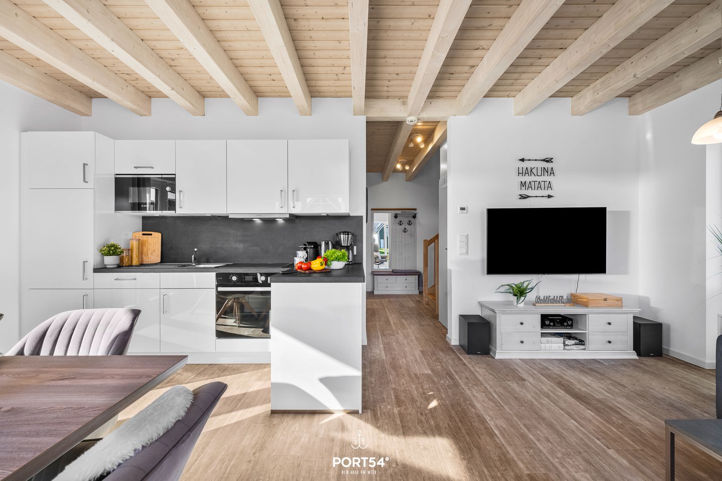 Der Wohnraum mit offener Küche und Esstisch für 6 Personen lässt keine Wünsche offen. Ein gemütliches Sofa und Lounge-Sessel laden zum Entspannen nach einem anstrengenden Strandtag ein. Falls der Regen zuschlägt und die Temperaturen die Lust auf Außenaktivitäten auf Eis legt, wird der Kamin im Wohnzimmer, zahlreiche Gesellschaftsspiele und ein moderner Flatscreen-TV die Stimmung und die Temperaturen heben.