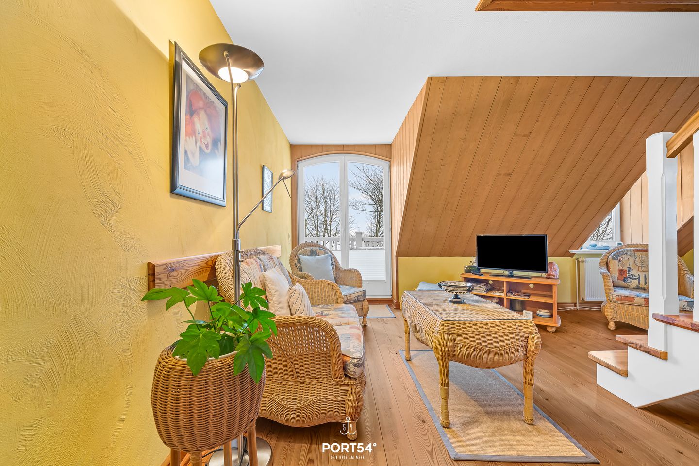 Ein besonderes Highlight ist der sonnige Balkon mit Blick ins Grüne, auf dem Sie die frische Nordseeluft genießen und entspannte Stunden verbringen können. Der separate Schlafbereich auf der Galerie sorgt für eine ruhige Rückzugsmöglichkeit und rundet das wohnliche Gesamtbild der Ferienwohnung ab. Für Familien mit Kleinkind steht bei Bedarf ein Babybett zur Verfügung.