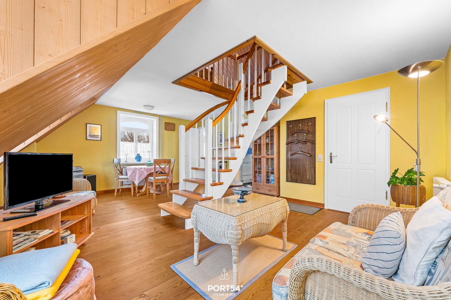 Die rund 50 m² große Wohnung befindet sich im ersten Obergeschoss eines gepflegten Hauses in einer ruhigen Seitenstraße und bietet eine behagliche Atmosphäre für Paare und kleine Familien. Der offen gestaltete Wohn- und Essbereich ist lichtdurchflutet und lädt mit seinem gemütlichen Mobiliar zum Verweilen ein – ob bei einem gemeinsamen Frühstück oder einem entspannten Abend nach einem Strandspaziergang. Die integrierte Küche ist gut ausgestattet und ermöglicht es Ihnen, sich auch im Urlaub bequem selbst zu versorgen.