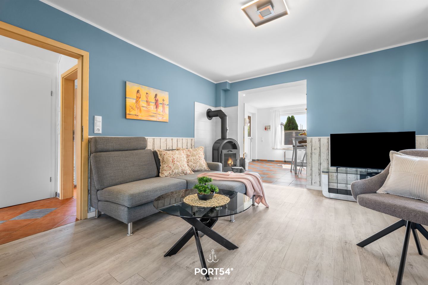 Das modern eingerichtete Haus bietet Platz für bis zu sechs Personen und überzeugt durch eine stilvolle Ausstattung. Im großzügigen Wohnzimmer lädt eine große Couch zum Entspannen ein. Ein Kamin sorgt an kühleren Tagen für gemütliche Stunden, während ein Flachbild-TV für Unterhaltung bereitsteht. Die offene Küche ist voll ausgestattet und bietet gemeinsam mit dem angrenzenden Esstisch Raum für gesellige Mahlzeiten.