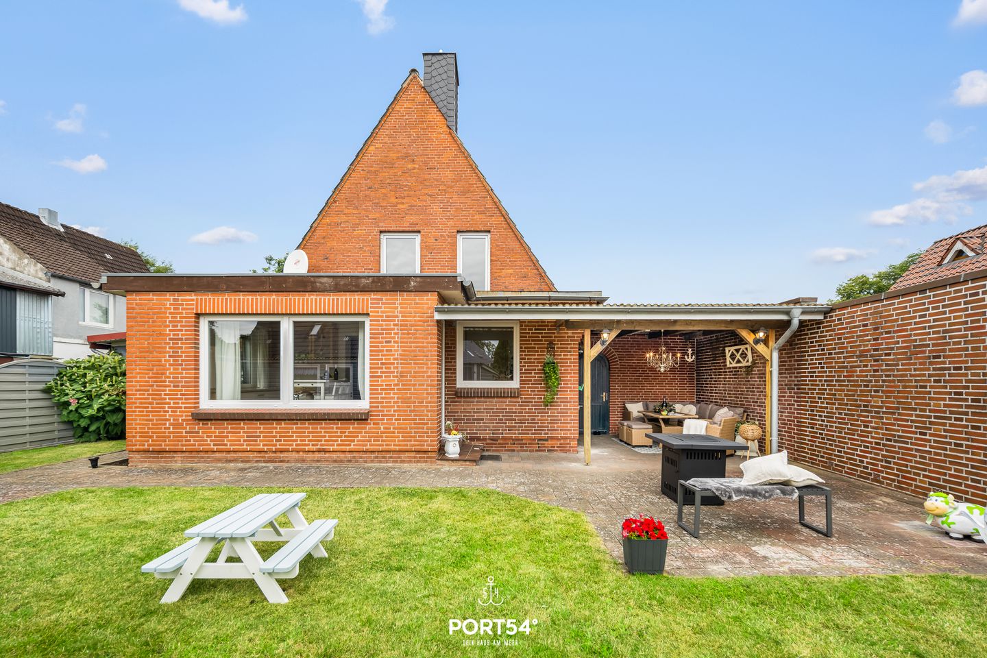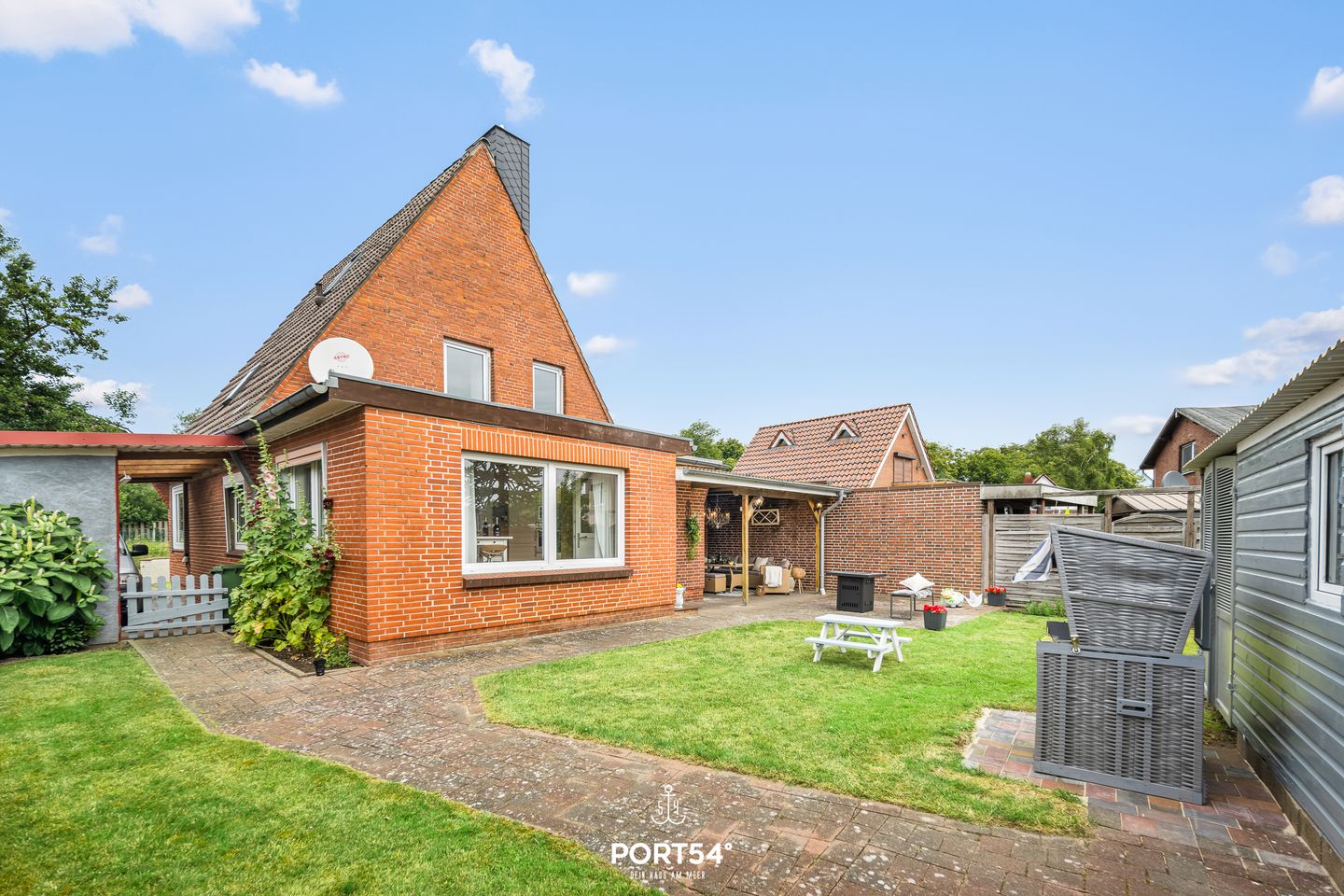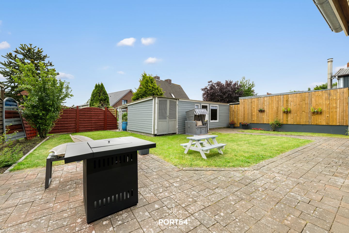 Auch der Außenbereich lässt keine Wünsche offen: Das komplett eingezäunte Grundstück sorgt für Privatsphäre und Sicherheit, besonders für Familien mit Kindern oder Reisende mit Hund. Eine überdachte Terrasse mit gemütlicher Lounge-Ecke und Feuerstelle lädt zu entspannten Abenden im Freien ein. Ein Strandkorb bietet maritimes Urlaubsgefühl, und Fahrräder können bequem und sicher abgestellt werden.