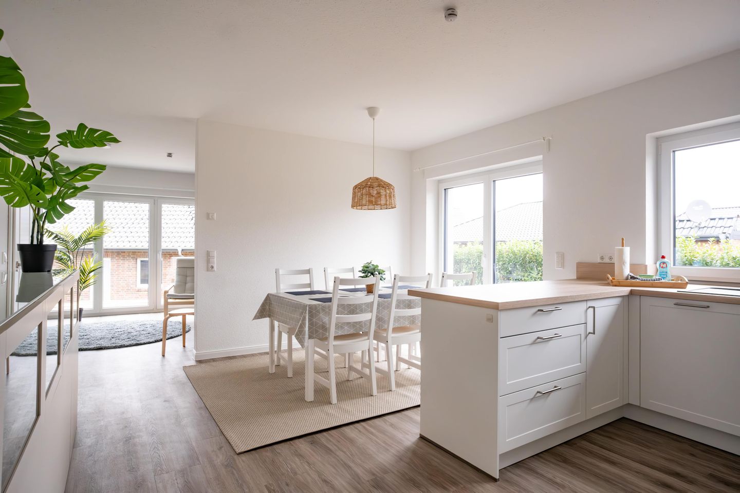 Mit einer Wohnfläche von 134 m² bietet das Ferienhaus Platz für bis zu sechs Personen. Insgesamt stehen sieben Zimmer zur Verfügung, darunter fünf separate Schlafzimmer und drei Badezimmer, die sowohl mit bodengleichen Duschen als auch mit einer Badewanne ausgestattet sind. Die modernen Bäder sind vollständig ausgestattet, unter anderem mit Haartrockner, Kosmetikspiegel und Fenstern für Tageslicht. Für zusätzlichen Komfort sorgt die Fußbodenheizung, ergänzt durch eine zentrale Heizungsanlage, sodass auch in den kühleren Monaten eine angenehme Wohnatmosphäre garantiert ist.