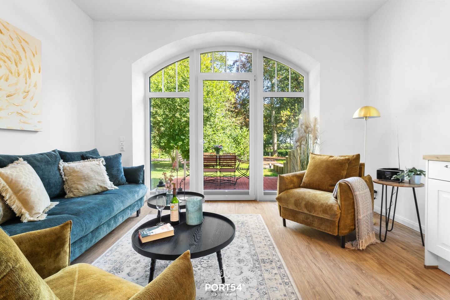 Die Wohnung besticht durch hohe Wände, stilvolle Einrichtung und besonders große Fenster mit Blick ins Grüne. Hier können Sie sich rundum wohlfühlen und einen unvergesslichen Urlaub auf dem Majorshof erleben.