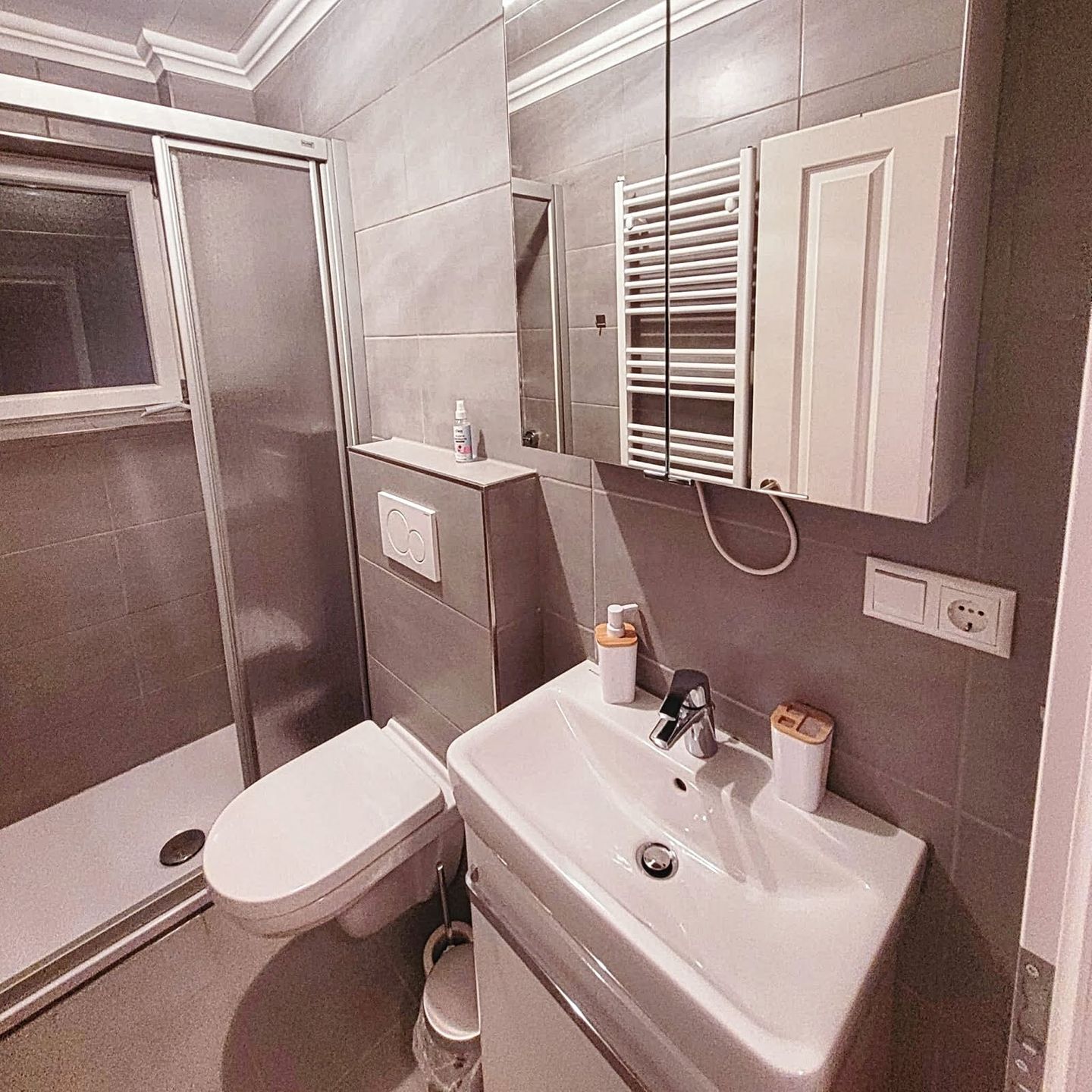 Das separate Schlafzimmer mit Laminatboden bietet zusätzlichen Komfort durch Kommode, Schuhschrank und Ganzkörperspiegel. Das Badezimmer verfügt über eine bodengleiche Dusche, WC, Waschbecken, Fenster, Warmwasser und Haartrockner.