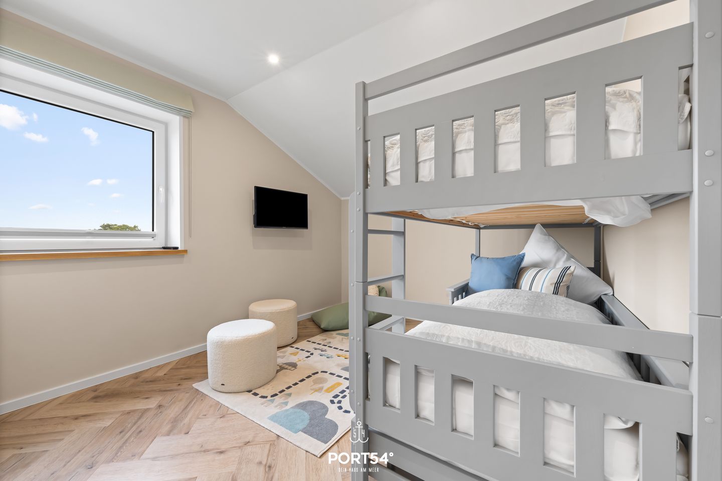 Die Ferienwohnung verfügt über zwei geschmackvoll eingerichtete Schlafzimmer: Ein Schlafzimmer mit gemütlichem Doppelbett und TV sorgt für erholsame Nächte, während das zweite Schlafzimmer mit Etagenbett, ausziehbarem dritten Schlafplatz und ebenfalls einem Fernseher ideal für Kinder oder zusätzliche Gäste ist. Zudem besitzt auch das Wohnzimmer einen Fernseher – somit sind alle Zimmer mit einem TV ausgestattet.