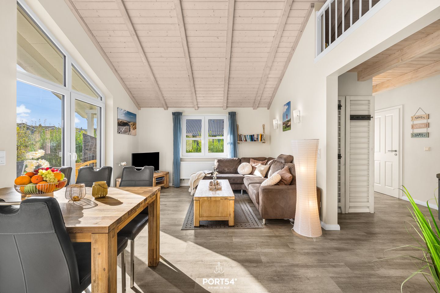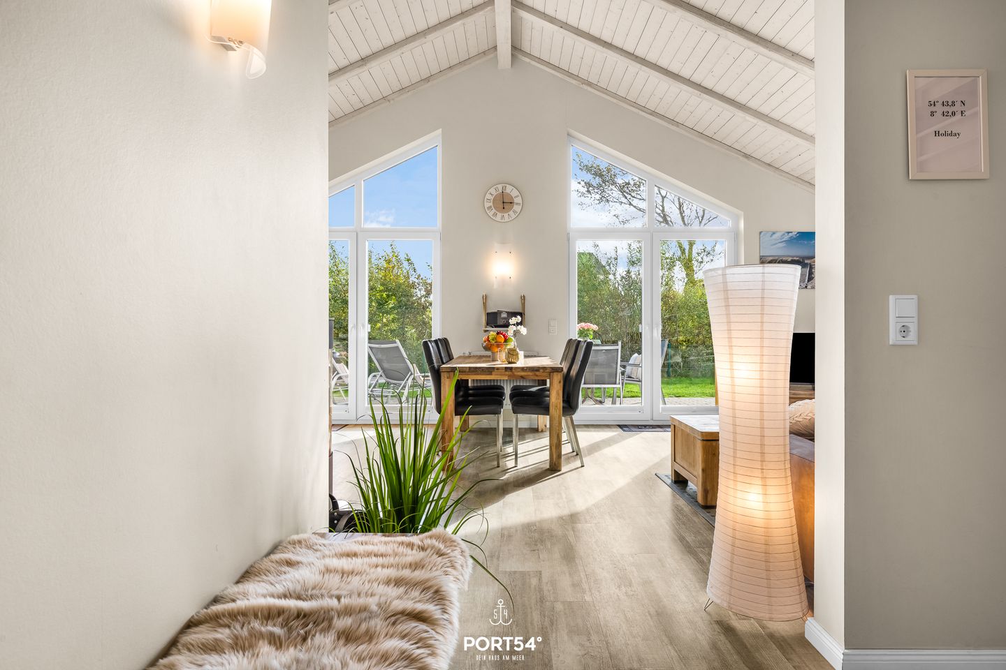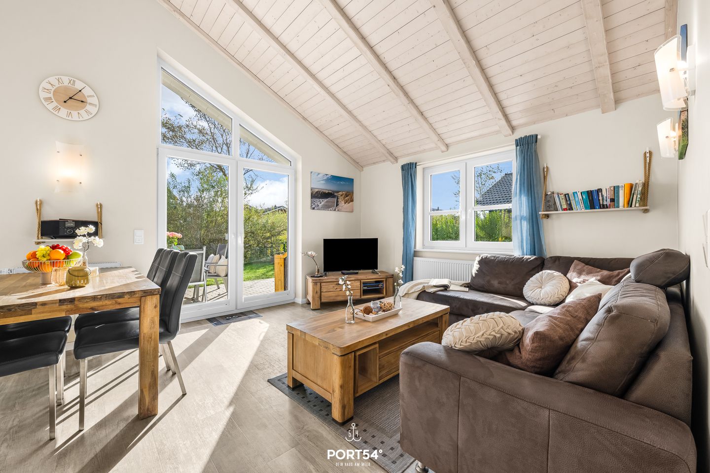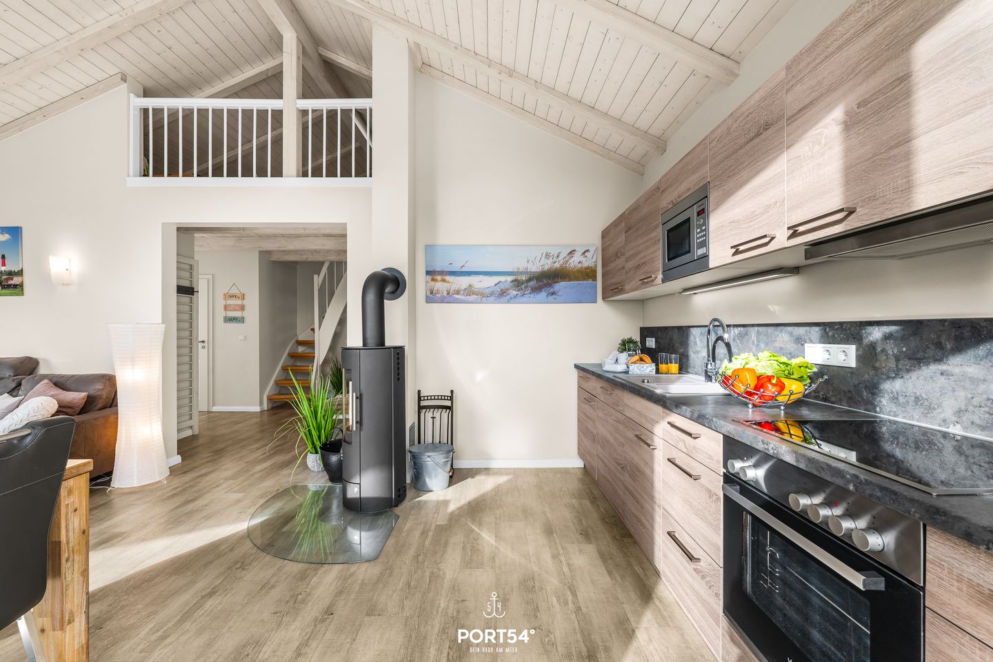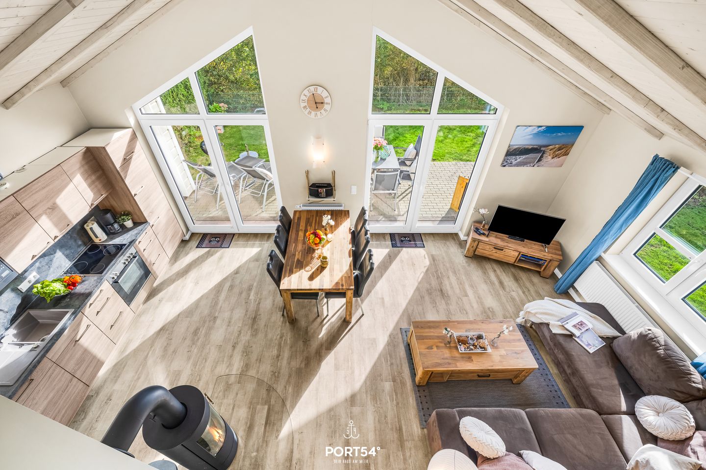 Das Haus empfängt Sie mit einem lichtdurchfluteten Wohnbereich im Erdgeschoss. Hier erwarten Sie eine gemütliche Sofaecke, ein Essbereich sowie ein Kaminofen, der an kühleren Tagen für eine behagliche Atmosphäre sorgt. Für Ihre mediale Unterhaltung stehen zwei Fernseher und ein Blu-ray-Spieler zur Verfügung. Die offene Küche ist zum Wohnzimmer hin gestaltet und umfassend ausgestattet – moderne Geräte wie Ceranherd, Backofen, Geschirrspüler, Kühlschrank mit Gefrierfach, Mikrowelle, Kaffeemaschine und umfangreiches Geschirr und Besteck bieten alles für die unabhängige Selbstversorgung.