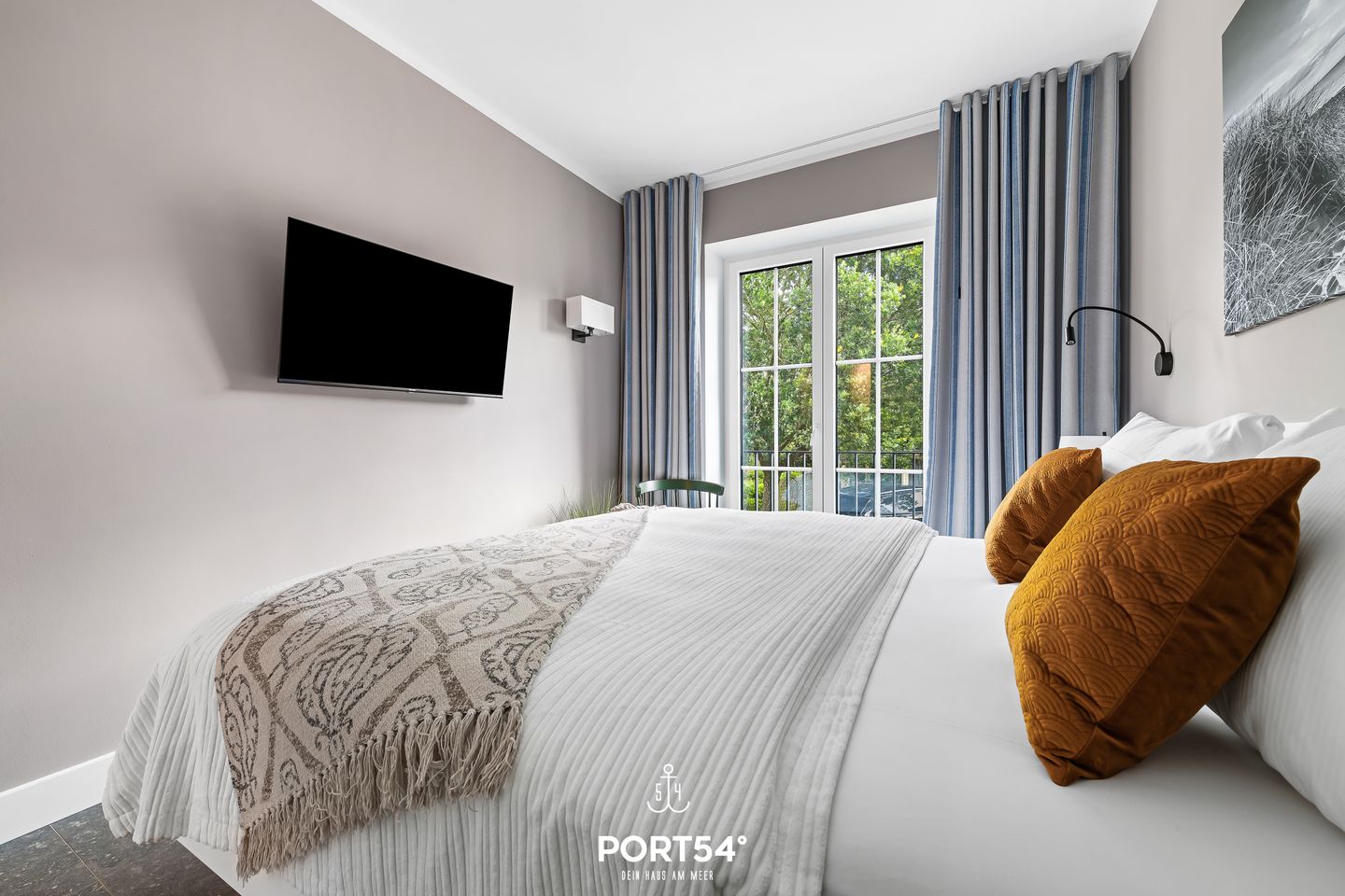 Zur Ausstattung gehören ein separates Schlafzimmer mit komfortablem Doppelbett sowie ein lichtdurchfluteter Wohnbereich mit offen gestalteter, hochwertig ausgestatteter Küche. Hier lässt sich der Urlaubstag entspannt ausklingen. Das moderne Badezimmer mit Dusche überzeugt durch klare Formen und ein zeitloses Design.