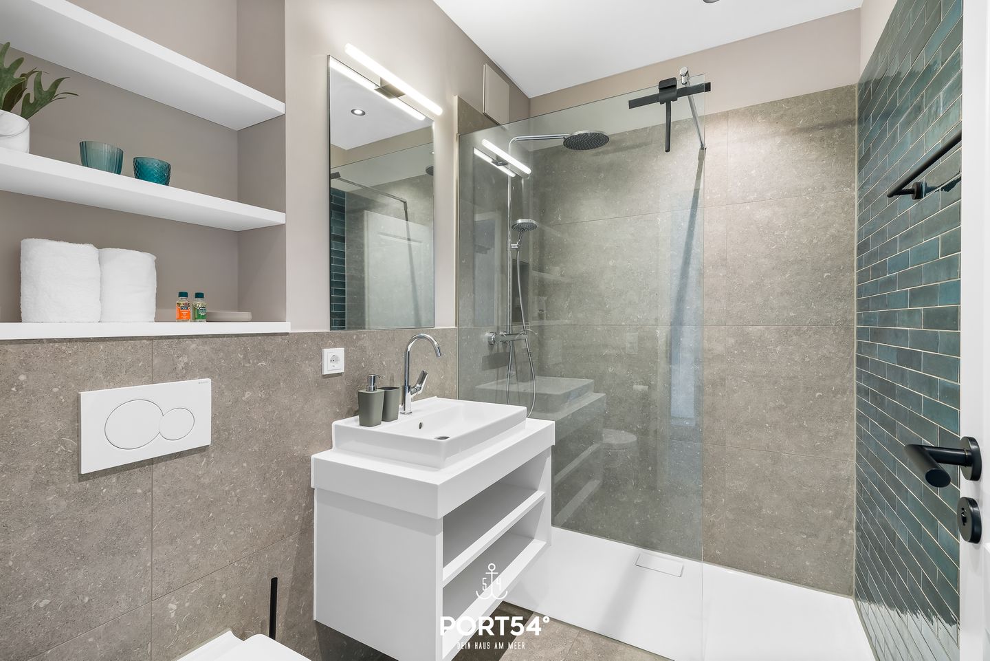 Das Badezimmer bietet eine bodengleiche Dusche, WC, Waschbecken, Spiegel und Kosmetikspiegel sowie einen Haartrockner; warmes Wasser ist selbstverständlich. Für längere Aufenthalte kannst du Waschmaschine und Trockner gemeinschaftlich nutzen. Ein Aufzug erleichtert dir den Zugang zur Wohnung. Außen lädt der Balkon mit Gartenmöbeln ein, die frische Nordseeluft in ruhiger Umgebung zu genießen.