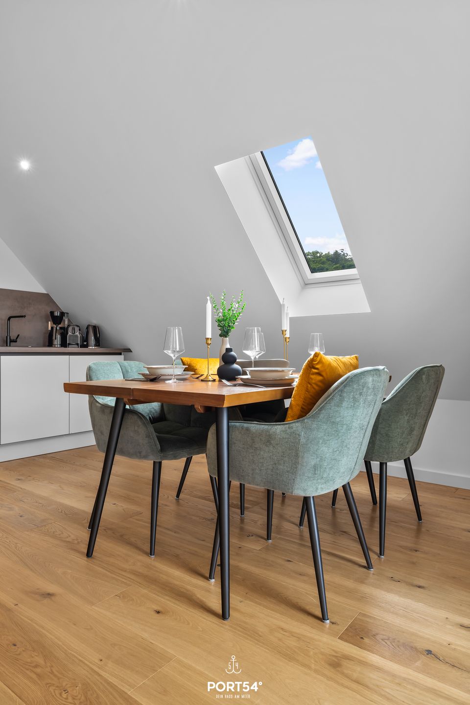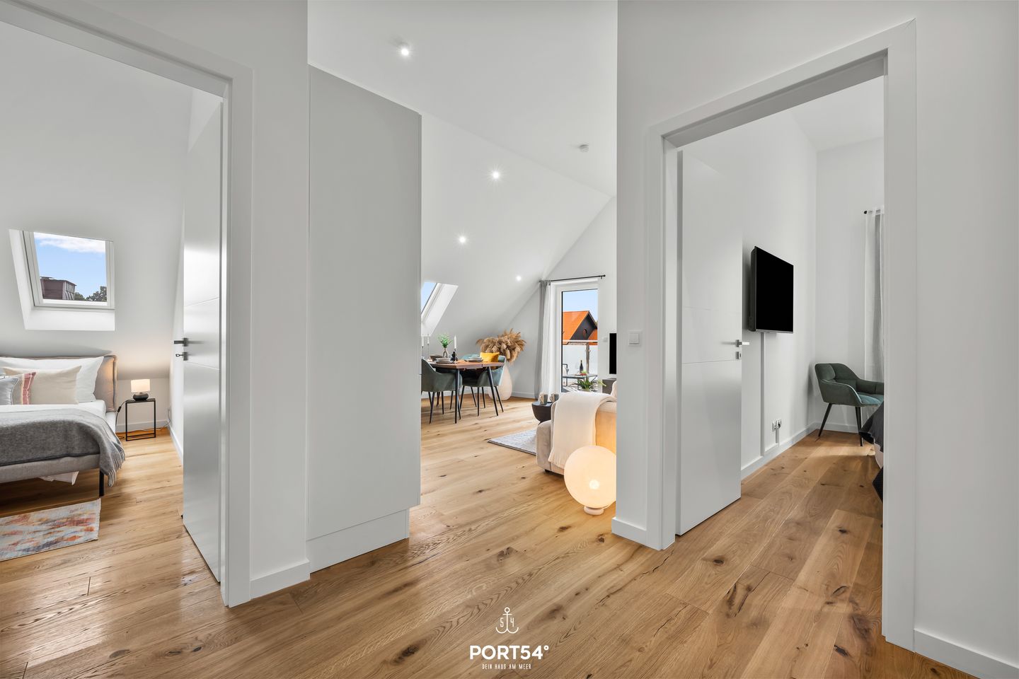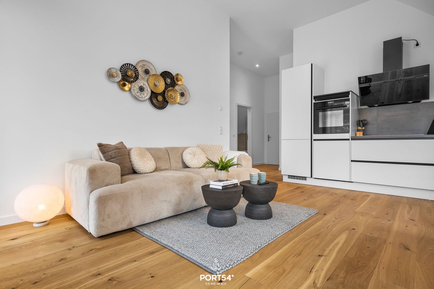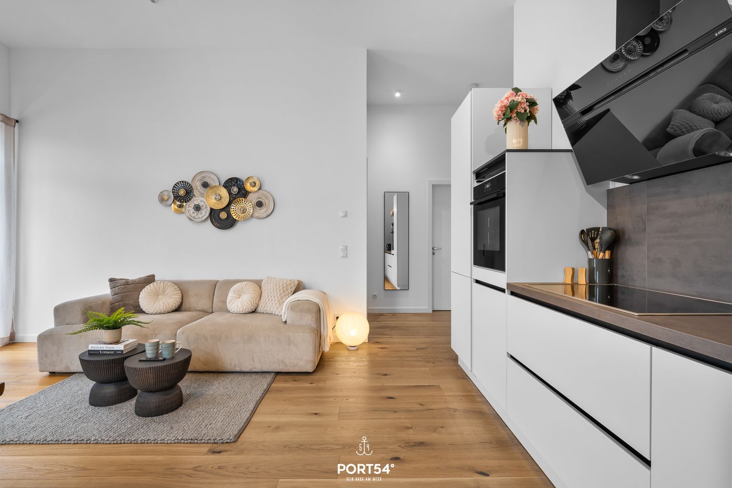 Die Wohnung verfügt über zwei gemütliche Schlafzimmer, die mit hochwertigen Parkettböden ausgestattet sind und eine erholsame Nachtruhe garantieren. Das geräumige Wohnzimmer besticht durch ein modernes Design und ist mit einer hochwertigen Couch und TV ausgestattet, sodass Sie nach einem Tag am Strand gemütlich einen Filmabend genießen können. Der offene Wohn- und Essbereich lädt zu gemeinsamen Mahlzeiten ein und die komplett ausgestattete Küche lässt keine Wünsche offen. Hier finden Sie alles, was Sie benötigen – vom Induktionskochfeld über einen Backofen bis hin zu einer Spülmaschine. Damit wird das Kochen zum Vergnügen!