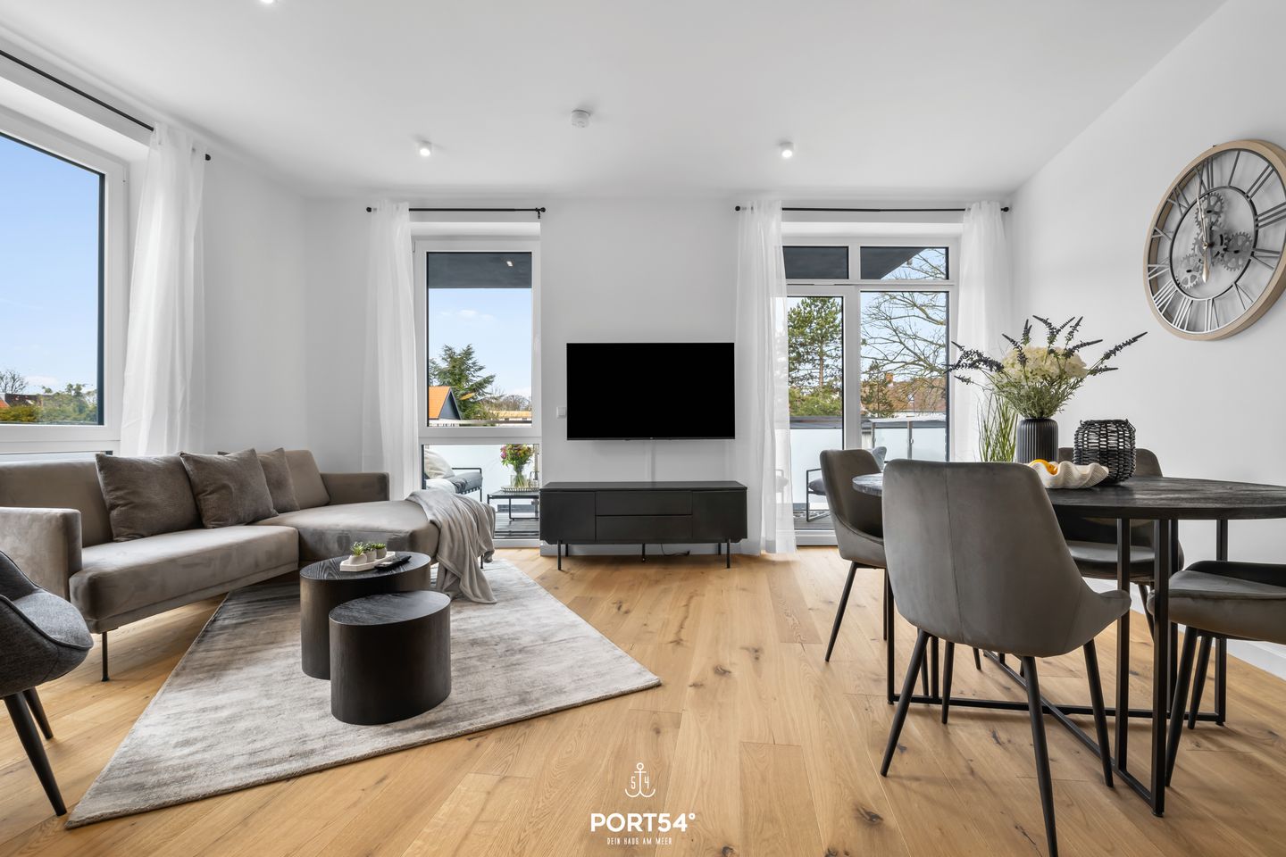 Die Wohnung verfügt über zwei gemütliche Schlafzimmer, die mit hochwertigen Parkettböden ausgestattet sind und eine erholsame Nachtruhe garantieren. Das geräumige Wohnzimmer besticht durch ein modernes Design und ist mit drei Fernsehern ausgestattet, sodass Sie nach einem Tag am Strand gemütlich einen Filmabend genießen können. Der offene Wohn- und Essbereich lädt zu gemeinsamen Mahlzeiten ein und die komplett ausgestattete Küche lässt keine Wünsche offen. Hier finden Sie alles, was Sie benötigen – vom Cerankochfeld über einen Elektrobackofen bis hin zu einer Spülmaschine. Damit wird das Kochen zum Vergnügen!