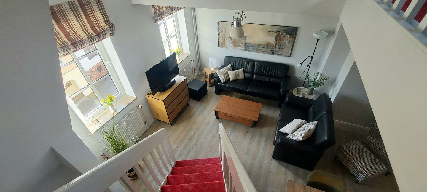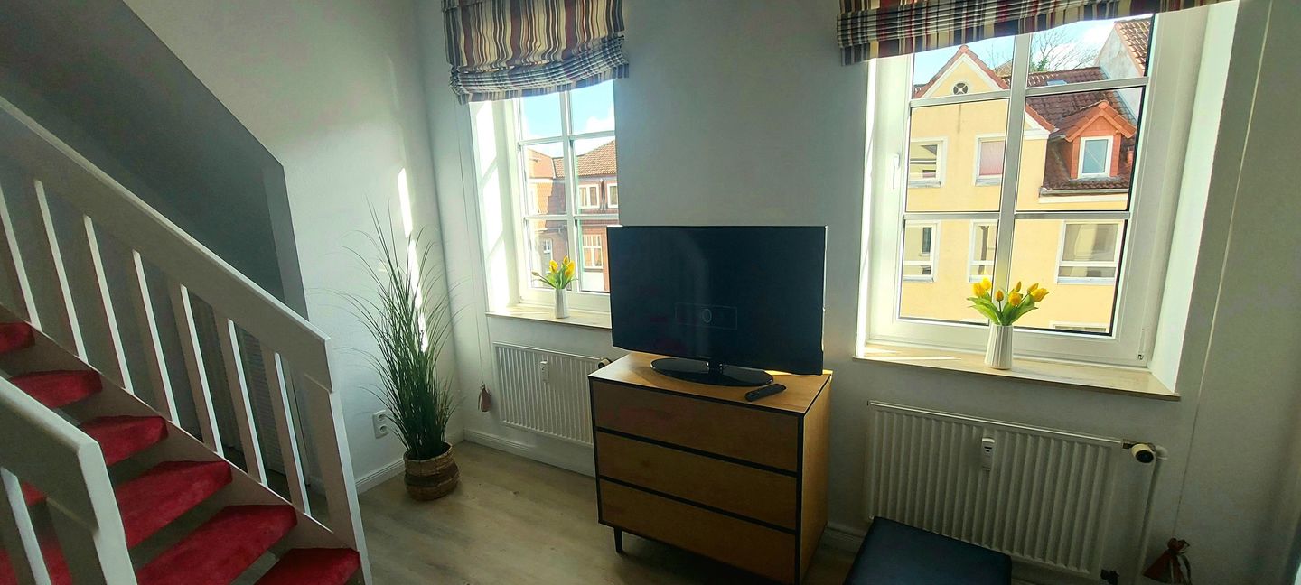 Willkommen in der "Tante Maaß" in Flensburg! Die gemütlich eingerichtete Maisonette-Wohnung befindet sich in einer Wohnanlage in direkter Nähe des zentral gelegenen Südermarkts und bietet mit 64m² ausreichend Platz für vier Personen. Die elegante und stilsichere Einrichtung stimmt Sie auf eine unvergessliche Zeit im Herzen Flensburgs ein! Ein gemütlicher Wohnbereich lässt Sie ankommen und alle Sorgen des Alltags vergessen. Vom Wohnzimmer aus führt eine Treppe in das Schlafzimmer, in dem sich ein gemütliches Doppelbett und 2 Einzelbetten befinden. Die Küche ist vollausgestattet und lässt keine Wünsche offen - hier können Sie nach Lust & Laune kochen. Wenn Sie sich lieber in einem der Flensburger Restaurants die heimische Küche schmecken lassen wollen, so liegt die Ferienwohnung perfekt, um diese in wenigen Gehminuten zu erreichen. Das modern sanierte Badezimmer verfügt über eine bodengleiche Dusche und eine Waschmaschine.