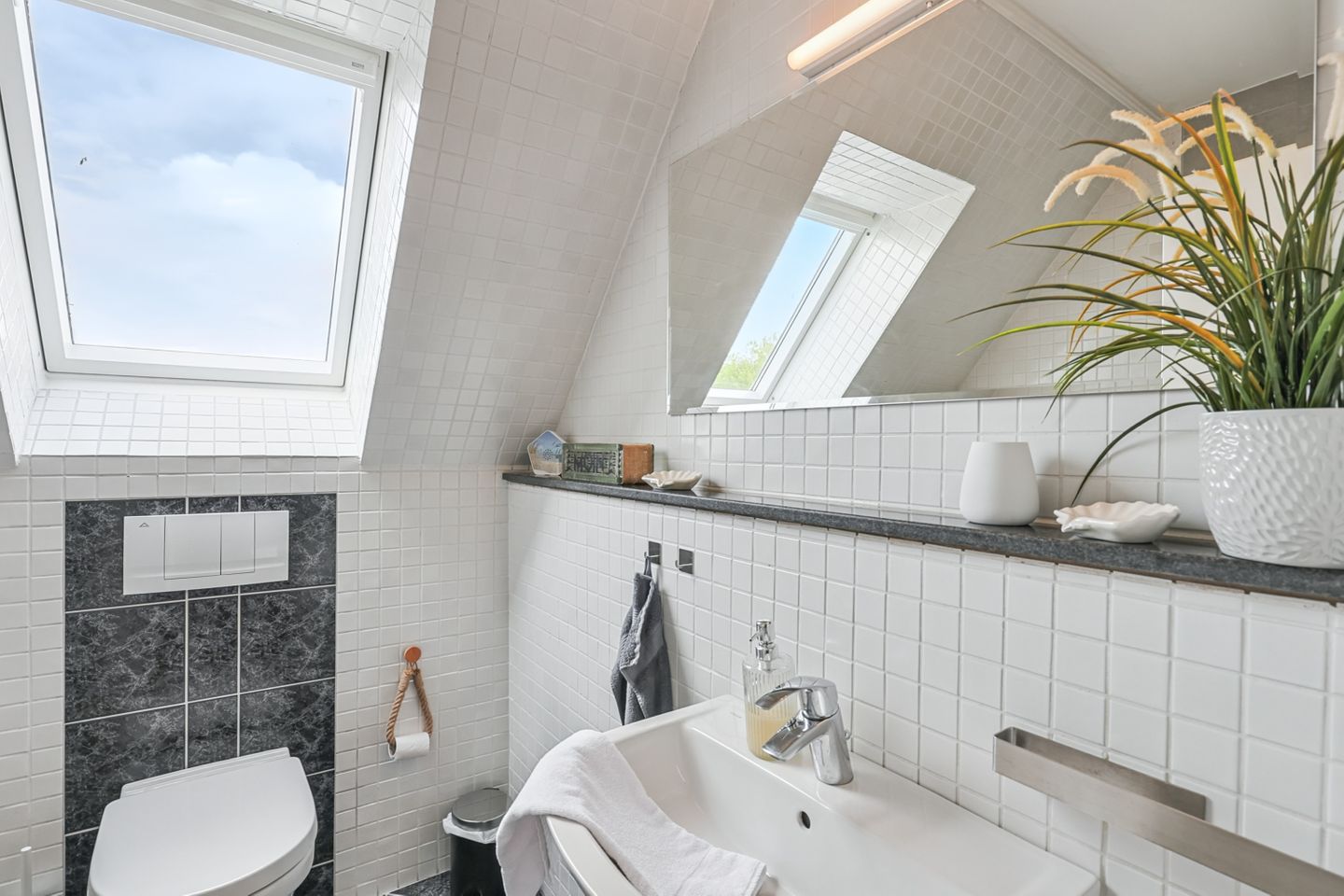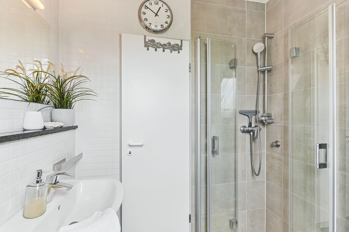 Das Badezimmer besticht durch eine bodengleiche Dusche, ein Waschbecken, Spiegel, Kosmetikspiegel sowie Haartrockner und Fenster für Tageslicht.
