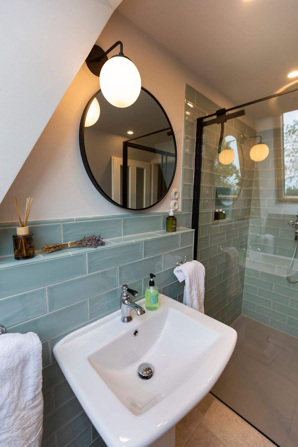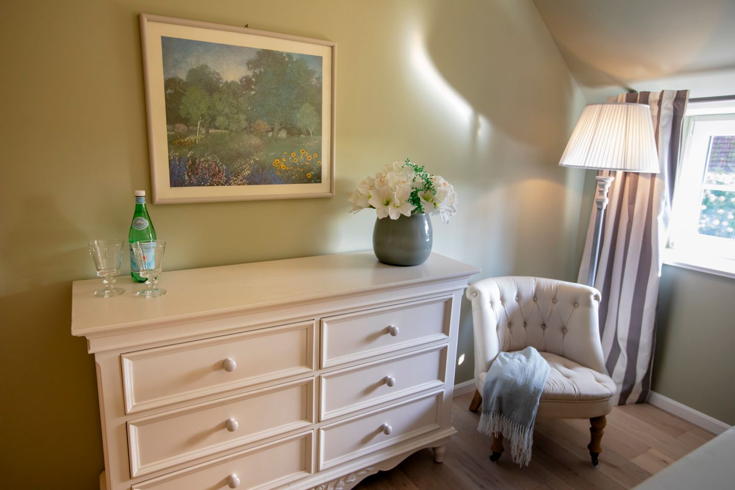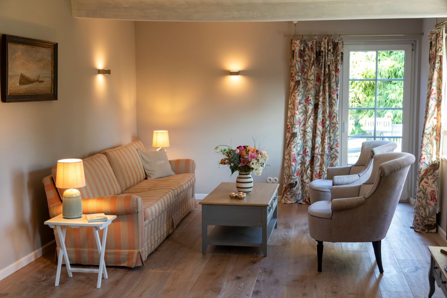 "Steuerbord": Das Wohn- und Esszimmer ist gemütlich eingerichtet und verfügt über einen Zugang zur Süd-Terrasse mit einem wunderbaren Blick ins Grüne. Der Südgarten steht exklusiv dieser Haushälfte zur Verfügung und verfügt über einen Grill. An kälteren Tagen können Sie es sich im Wohnzimmer vor dem hyggeligen dänischen Kamin gemütlich machen und streamen Ihre Lieblings-Serie auf dem Flachbild Fernseher. Die Küche ist offen zum Wohn- und Esszimmer und voll ausgestattet. Die Doppelhaushälfte verfügt über zwei großzügige Tageslicht-Duschbäder, eins pro Etage. Der ehemalige Heuboden wurde im Obergeschoss zu einer traumhaften Schlafetage ausgebaut. Das eine Schlafzimmer ist mit einem Doppelbett (180x200cm) und einem Kleiderschrank ausgestattet. Das andere Schlafzimmer bietet Ihnen zwei Einzelbetten (je 90x200cm), die jeweils zu Doppelbetten ausgezogen werden können (zusätzliche Matratzen sind vor Ort) und beherbergt noch eine Kommode. Für erholsame Nächte sind beide Schlafzimmer mit Verdunkelungsmöglichkeiten ausgestattet. Zusätzlich kann das Schlafsofa im Wohnzimmer (180x200cm) als Ausweichmöglichkeit genutzt werden.