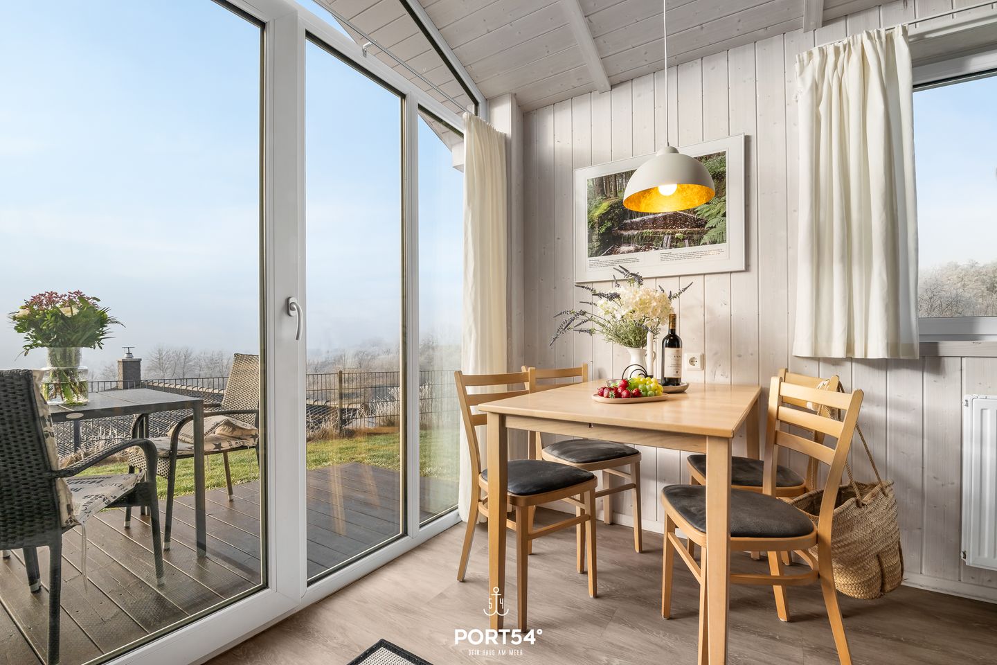 Der offene Wohnbereich bildet das Herzstück des Hauses. Mit seiner gemütlichen Couch, rustikalen Holzelementen und einem Bio-Ethanol-Kaminofen lädt er zu entspannten Abenden in wohliger Atmosphäre ein. Große Fenster holen die umliegende Natur ins Innere und lassen den Raum lichtdurchfluten. Hier können Sie auf der Couch entspannen, ein Buch lesen oder bei einer Tasse Tee den Ausblick genießen. Ein Flachbild-TV und eine Musikanlage sorgen für zusätzliche Unterhaltung.