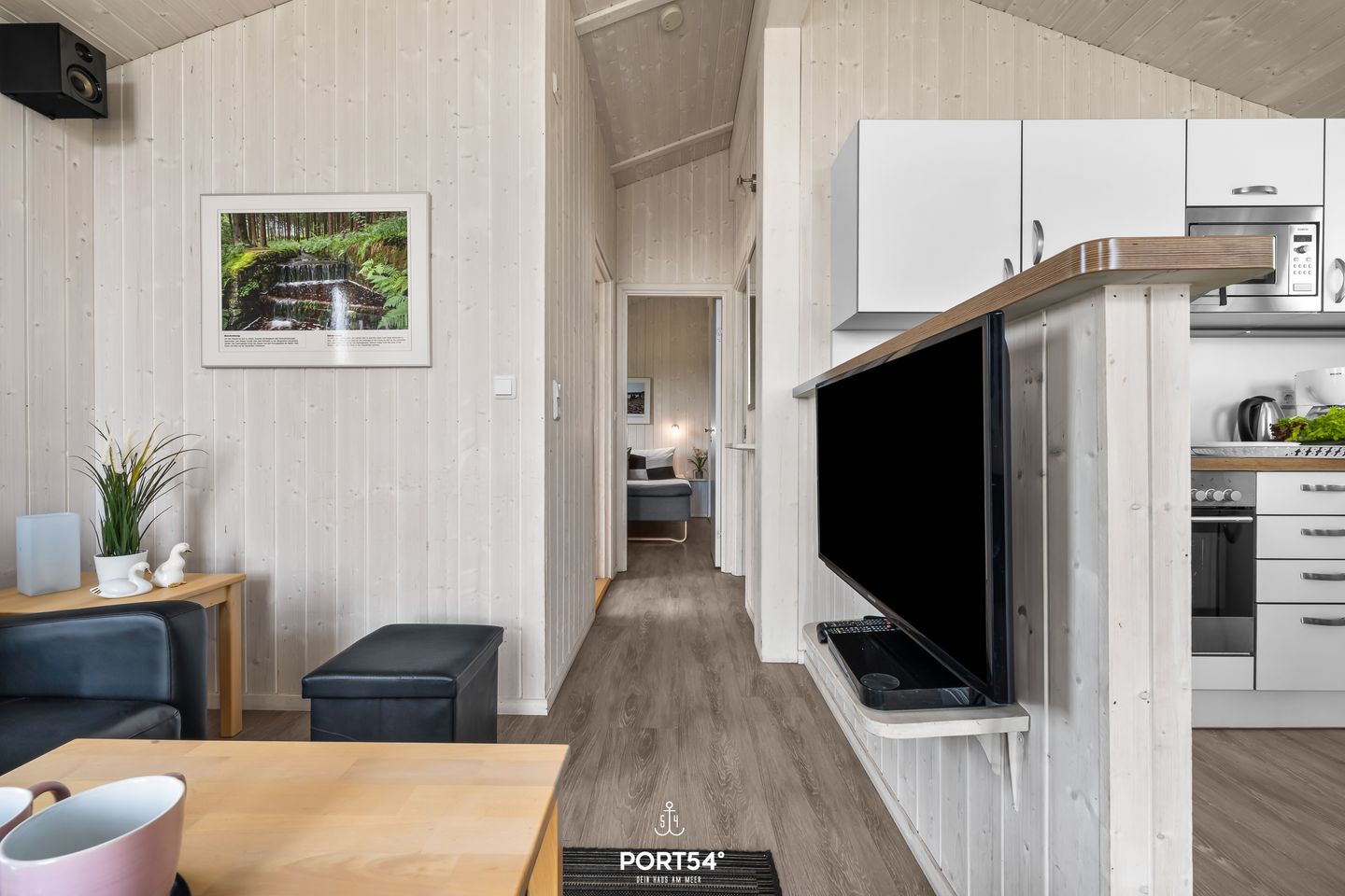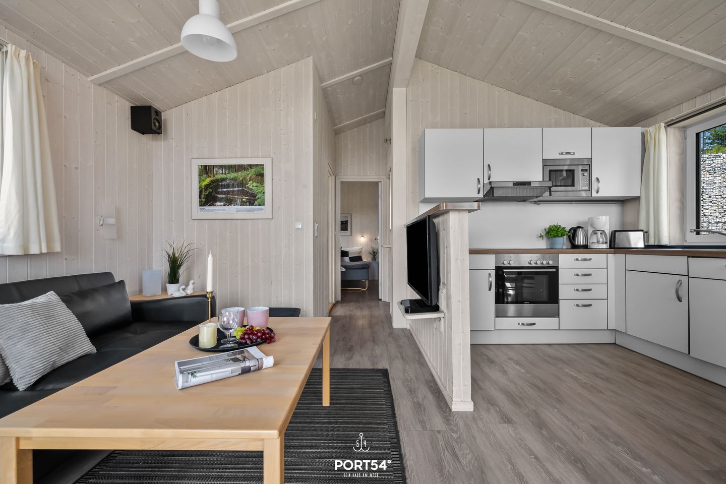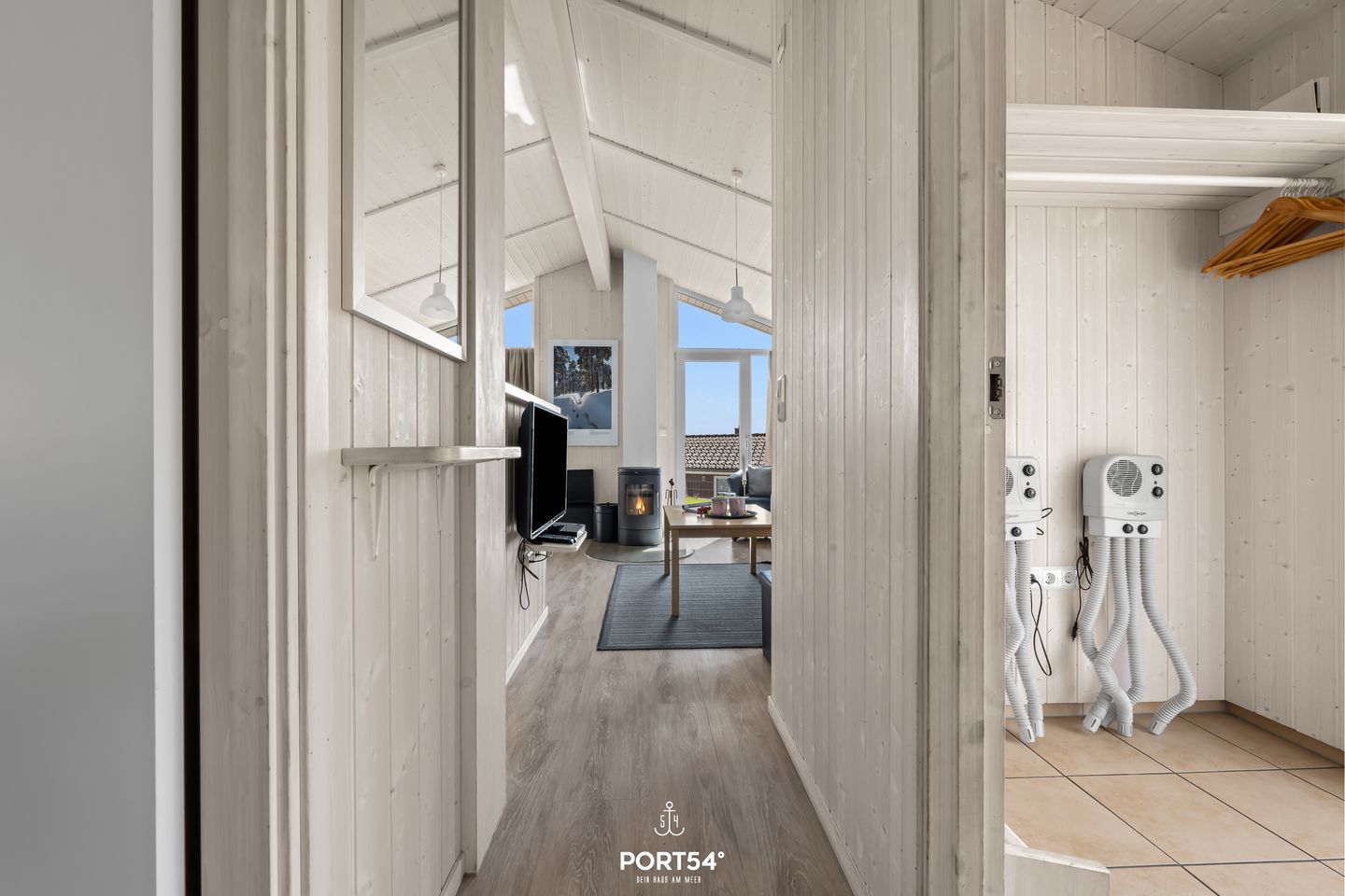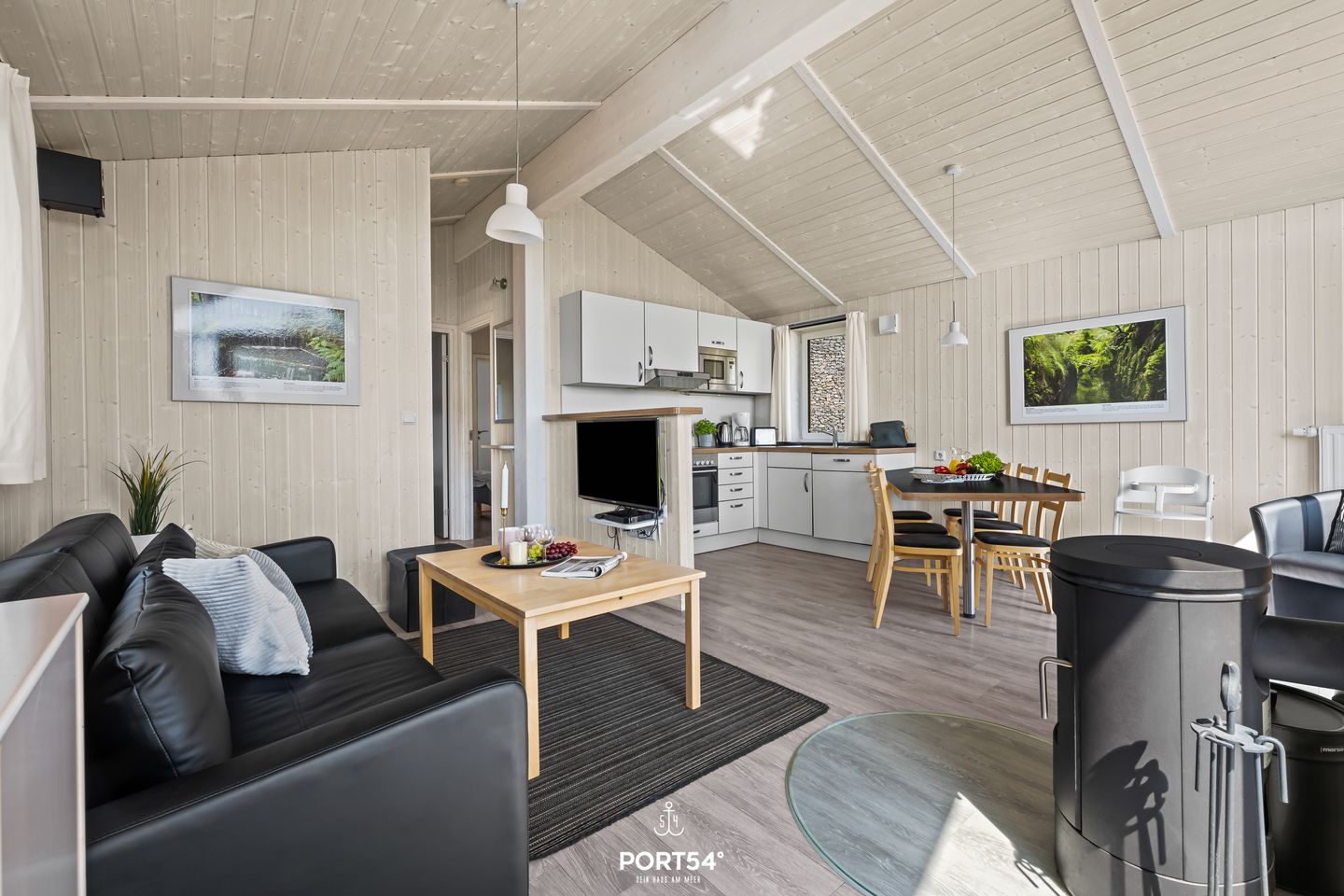 Der offene Wohnbereich ist das Herz des Hauses. Eine gemütliche Couch, rustikale Holzelemente und ein Holzofenkamin sorgen für eine behagliche Atmosphäre, die zum Entspannen einlädt. Große Fenster lassen viel Tageslicht herein und bieten einen malerischen Blick auf die umliegende Natur. Zur Unterhaltung stehen ein Flachbild-TV und eine Musikanlage bereit.