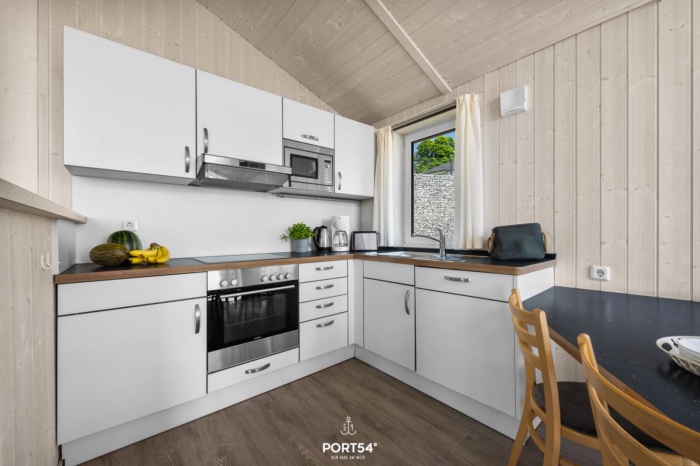 Die voll ausgestattete Wohnküche bietet alles, was Sie für gemeinsame Kochabende benötigen: ein Cerankochfeld, Backofen, Kühlschrank mit Gefrierfach, Mikrowelle und Kaffeemaschine. Der Essbereich lädt zu gemeinsamen Mahlzeiten und geselligen Gesprächen ein.