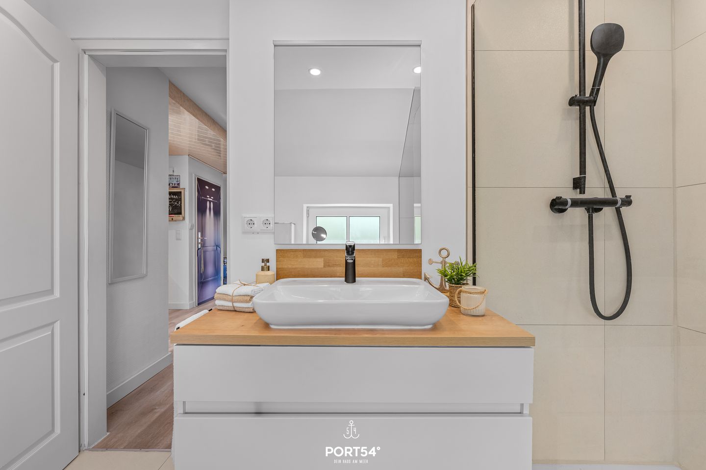 Das Tageslicht-Bad verfügt über eine bodengleiche Dusche, ein WC, ein Waschbecken sowie einen Kosmetikspiegel, Haartrockner und Fenster. Durchdachte Details wie ein Ganzkörperspiegel, Sichtschutz an den Fenstern, und die Garderobe außerhalb der Wohnung im Eingangsbereich tragen zum Komfort bei. Ein Wäscheständer sowie ein Staubsauger stehen ebenfalls bereit.