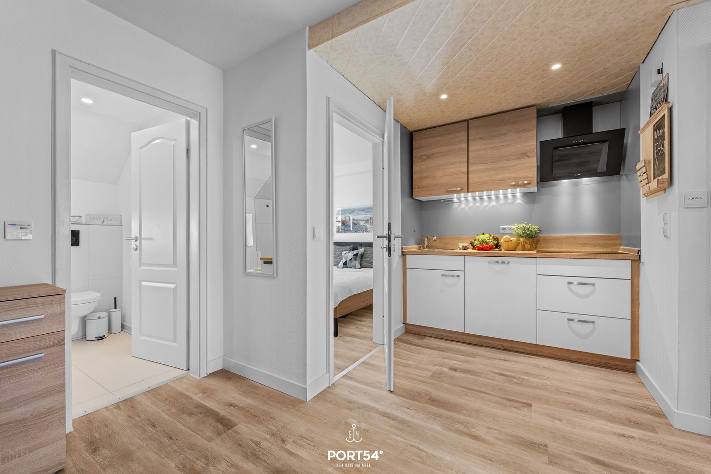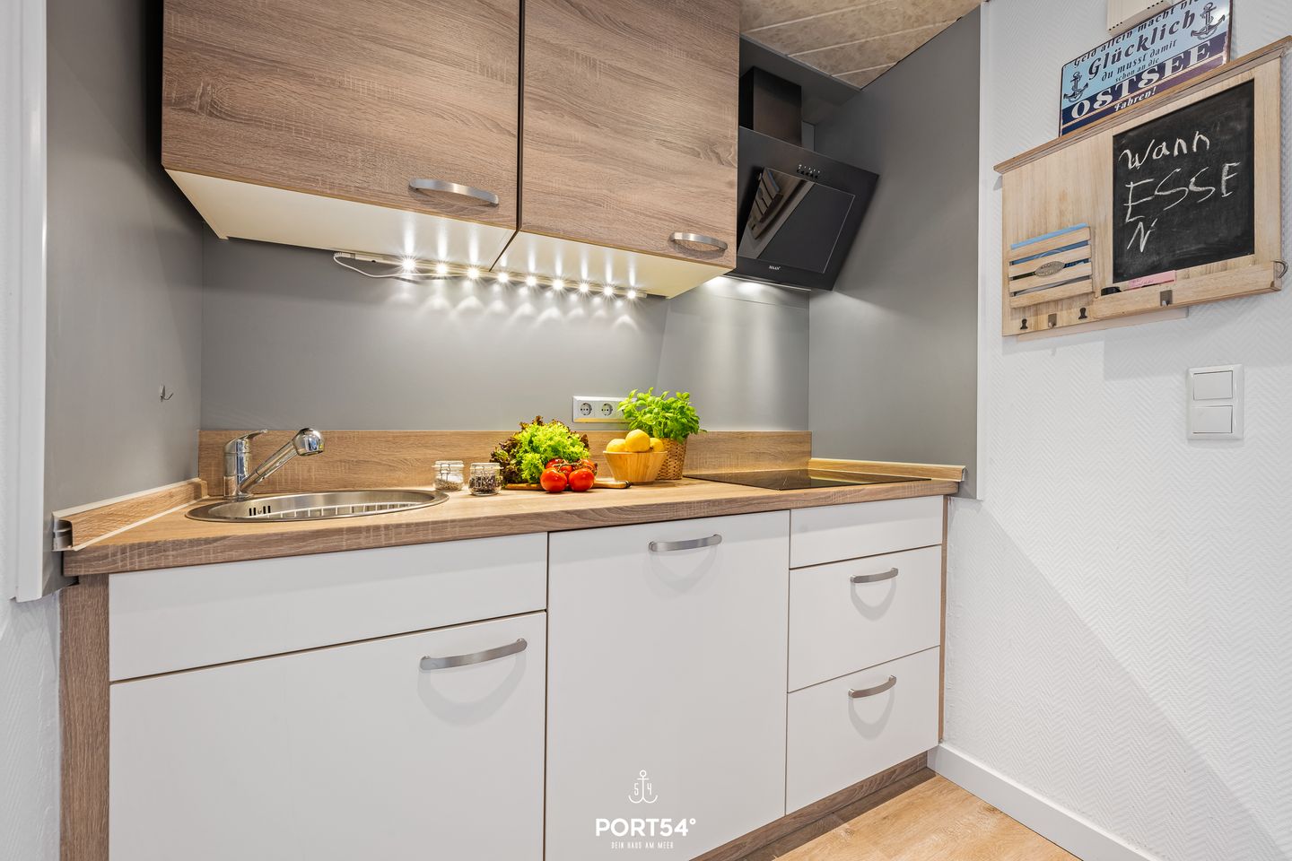 Die offen in das Wohnzimmer integrierte Küche ist zeitgemäß ausgestattet und erfüllt sämtliche Wünsche: Neben einer Spülmaschine, einem Backofen, einer Mikrowelle und einem Herd stehen Ihnen auch ein Kühlschrank mit Gefrierfach, Kaffeemaschine, Wasserkocher und Toaster zur Verfügung. Ein einladender Esstisch bietet Platz für gemeinsame Mahlzeiten.