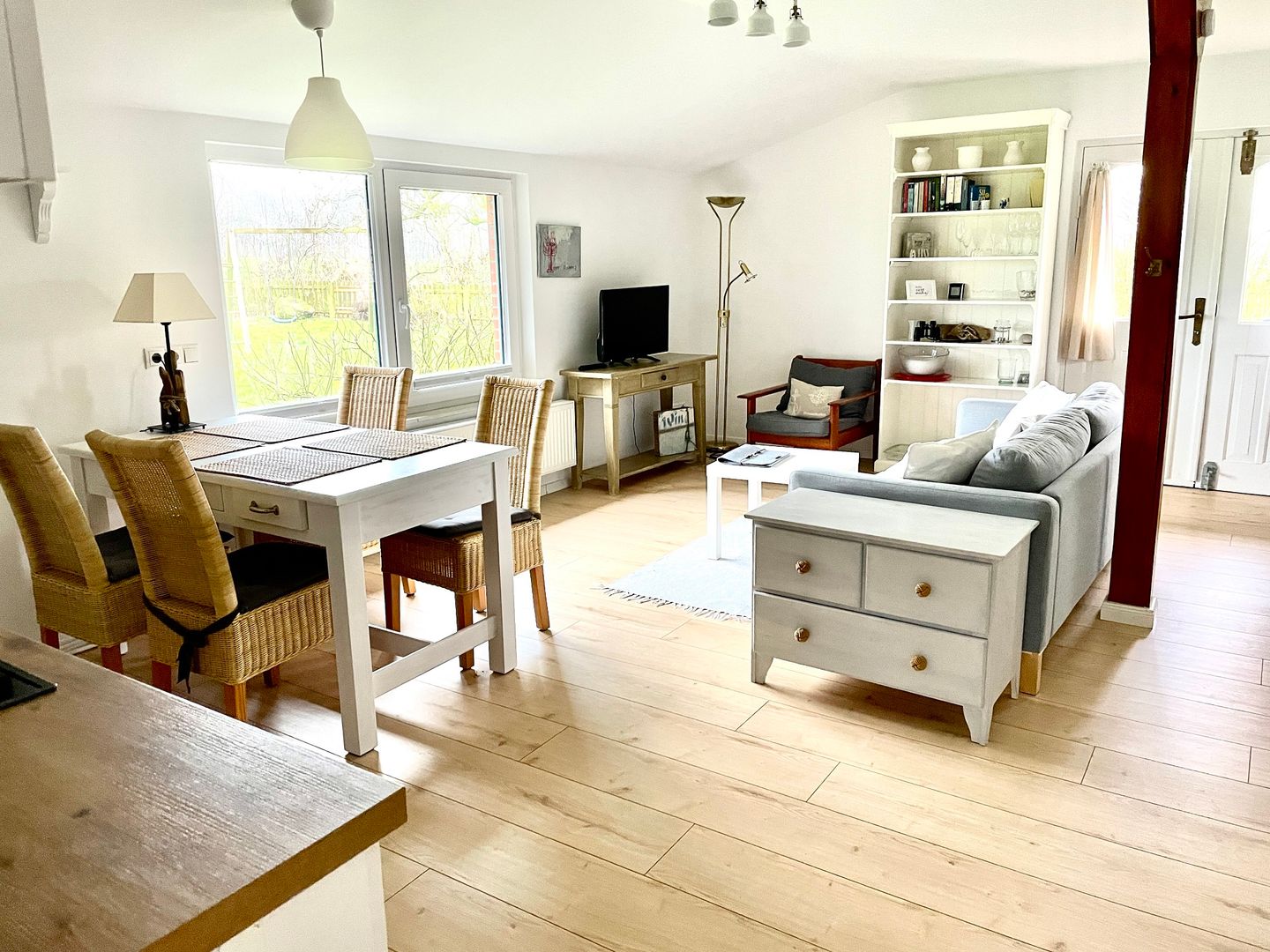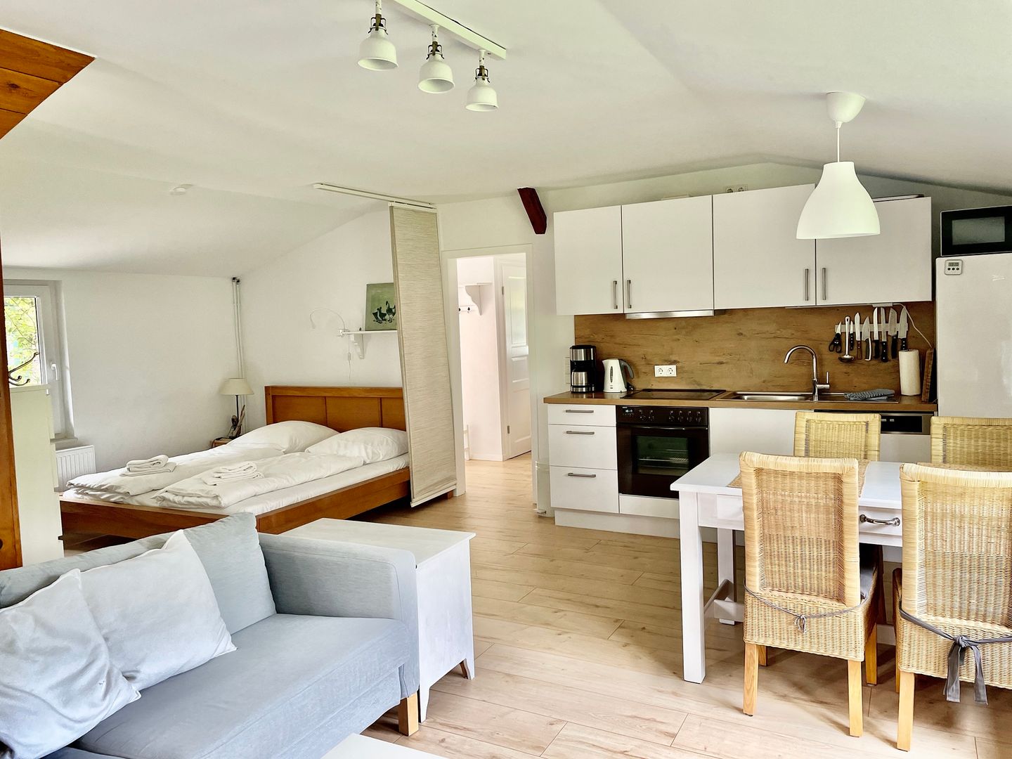Die gemütliche 46m² große Ferienwohnung "Hühnerstall" bietet Platz für bis zu 4 Personen und befindet sich in einem freistehenden kleinen Nebengebäude eines Reetdachhauses. Die abgelegene Lage des Grundstücks und die Nähe zur Ostsee bieten einen idealen Ausgangspunkt für einen perfekten Urlaub. Die renovierte Wohnung verfügt über einen Wohn- und Schlafbereich mit integrierter Küchenzeile. Die Küche ist mit Kaffeemaschine, Wasserkocher, Toaster, Kühlschrank, Ceran-Kochfeld, Backofen, Mikrowelle sowie allen wichtigen Kochutensilien hervorragend ausgestattet. Machen Sie es sich auf dem Sofa gemütlich und lassen Sie sich von einem Film oder einer Serie auf Netflix unterhalten. Das bequeme Doppelbett (180x200cm) lässt sich durch Schiebevorhänge separieren. Ein Kleiderschrank und eine Kommode bieten viel Stauraum. In dem Schlafzimmer befindet sich ein Etagenbett für 2 Personen (je 90x200cm). Das Tageslicht-Duschbad verfügt über einen Fön und einen Handtuchheizkörper. Zur Ferienwohnung gehört eine möblierte Terrasse, auf der sie auch ein Strandkorb erwartet. Für die Kleinen sind ein Kinderreisebett und ein Hochstuhl vorhanden. Ihr Vierbeiner ist ebenfalls herzlich willkommen! Lassen Sie die Kinder mit dem Hund im Garten spielen und lehnen Sie sich zurück und genießen Sie Ihren Urlaub in vollen Zügen. Die Kids werden dank Klettergerüst mit Rutsche, Schaukel und einem Sandkasten bestens beschäftigt sein. Erholen Sie sich in der gemeinschaftlichen finnischen Fasssauna und lassen Sie den Alltag hinter sich bei dem traumhaften Blick auf die Landschaft. Genießen Sie die Ruhe in dem großen Garten! Dieser steht ebenfalls den 3 weiteren Ferienwohnungen des Reetdachhauses zur Verfügung, jedoch sind durch die 2000m² genügend Platz für alle da. Der Garten ist zu 3 Seiten eingezäunt, an der 4. Seite schließt das Grundstück durch einen Knick ab. Ein Stellplatz ist vorhanden.