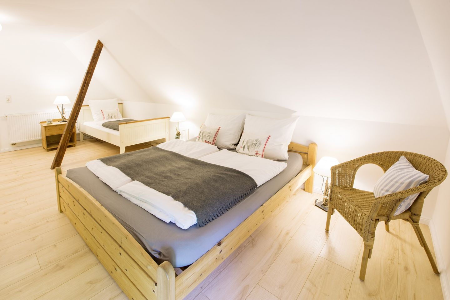 Die schöne zweistöckige Ferienwohnung "Kuhstall" befindet sich in einem von Charme erfüllten ehemaligen Bauernhaus und ist kernsaniert. Sie bietet auf 79m² und mit Platz für bis zu 5 Personen viel Raum. Im Erdgeschoss befindet sich der offene Wohn- und Essbereich mit der Küchenzeile. In der voll ausgestatteten Küche finden Sie alles, was für einen Kochabend mit der ganzen Familie gebraucht wird. Danach können Sie es sich auf dem Sofa gemütlich machen und einen Film schauen. Sollte das Wetter einmal nicht mitspielen machen Sie es sich vor dem Kamin im Wohnzimmer gemütlich und genießen oder erleben Filme und Serien via Netflix. Das Tageslichtbad ist mit einer ebenerdigen Dusche und einem Föhn ausgestattet. Auch ein Schlafzimmer mit einem Doppelbett (180x200cm) und einem Kleiderschrank befindet sich im Erdgeschoss. Im Dachgeschoss ist ein offen gestaltetes Schlafzimmer mit einem Doppelbett (180x200cm) und einem Einzelbett (90x200cm) vorhanden. Auch hier bietet ein Kleiderschrank viel Stauraum. Eine Récamiere ist der ideale Platz um in Ruhe ein Buch zu lesen. Im Außenbereich sind Gartenmöbel vorhanden, die gemeinschaftlich genutzt werden. Für die Kleinen sind ein Kinderreisebett und ein Hochstuhl vorhanden. Ihr Vierbeiner ist ebenfalls herzlich willkommen! Lassen Sie die Kinder mit dem Hund im Garten spielen und lehnen Sie sich zurück und genießen Sie Ihren Urlaub in vollen Zügen. Die Kids werden dank Klettergerüst mit Rutsche, Schaukel und einem Sandkasten bestens beschäftigt sein. Erholen Sie sich in der gemeinschaftlichen finnischen Fasssauna und lassen Sie den Alltag hinter sich bei dem traumhaften Blick auf die Landschaft. Genießen Sie die Ruhe in dem großen Garten! Dieser steht ebenfalls den 3 weiteren Ferienwohnungen des Reetdachhauses zur Verfügung, jedoch sind durch die 2000m² genügend Platz für alle da. Der Garten ist zu 3 Seiten eingezäunt, an der 4. Seite schließt das Grundstück durch einen Knick ab. Ein Stellplatz ist vorhanden.