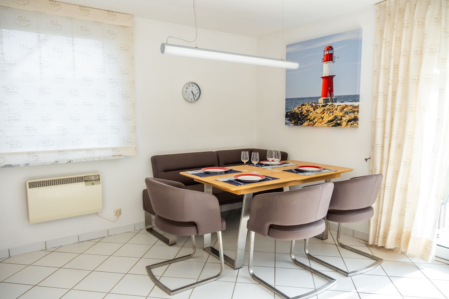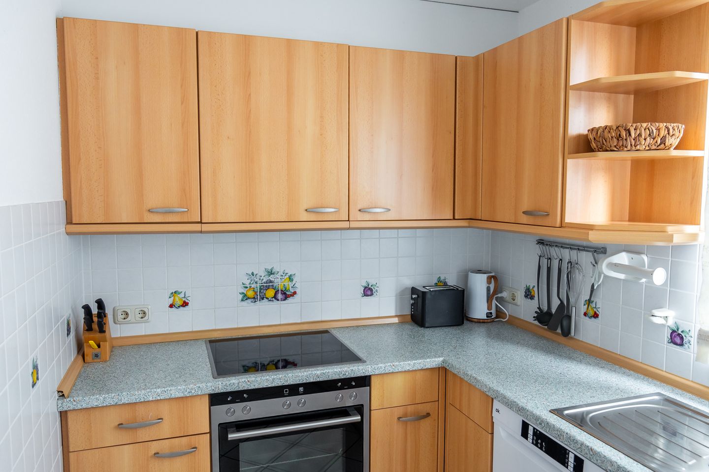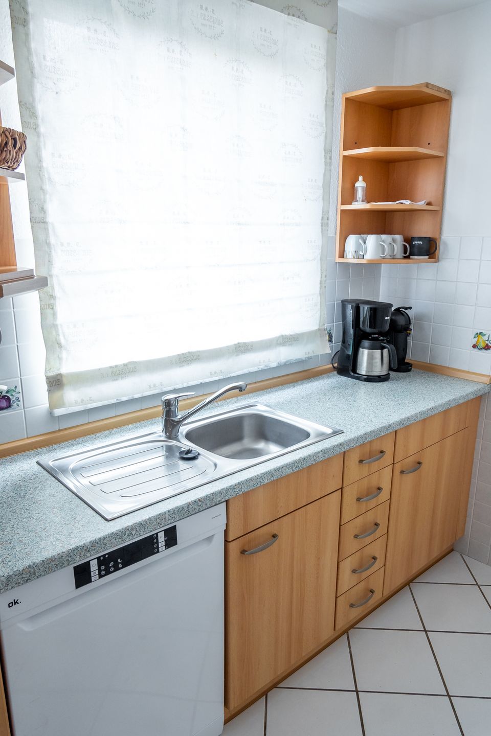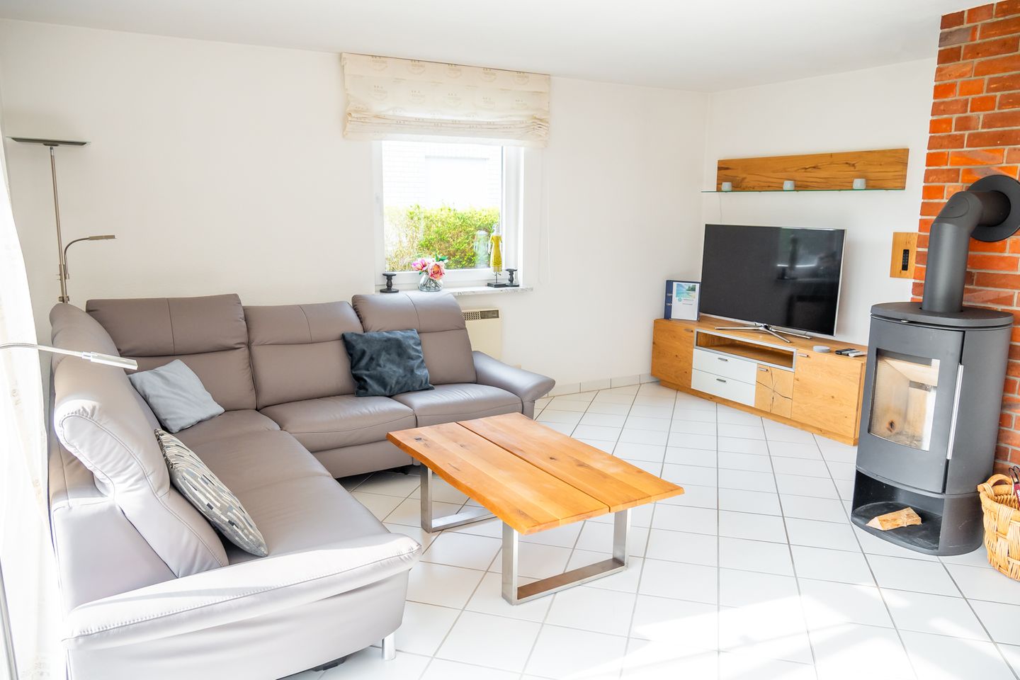 Die Küche ist offen zum Wohnzimmer gestaltet und umfassend ausgestattet: Ceran-Herd, Backofen, Mikrowelle, Kühlschrank mit Gefrierfach, Spülmaschine sowie Kaffeemaschine, Wasserkocher und Toaster stehen bereit. Küchenutensilien, Geschirr und Besteck sind vorhanden; ebenso Geschirrhandtücher, Abfalleimer und eine Erstausstattung. Bettwäsche ist inklusive. Für längere Aufenthalte oder den Strandalltag profitieren Sie zudem von einer Waschmaschine zur Eigennutzung sowie einem Wäscheständer; Staubsauger ist ebenfalls vorhanden.
