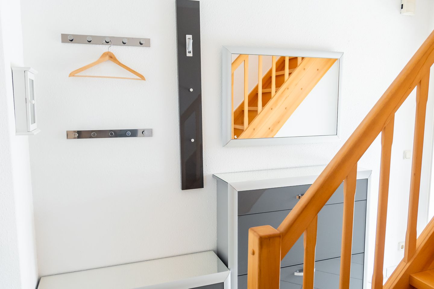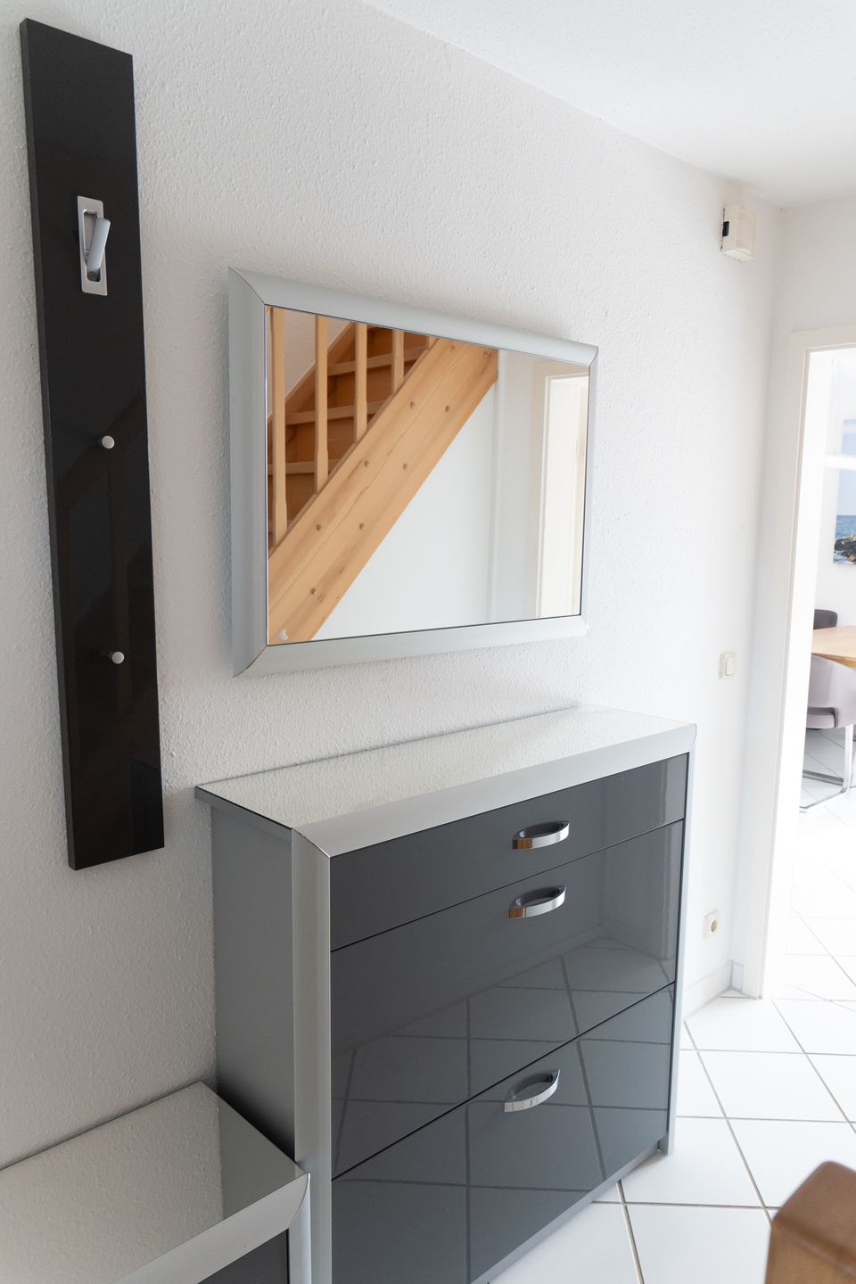 Im Parterre erwartet Sie ein Wohnbereich mit Sofaecke sowie ein separater Essbereich/Esszimmer mit Esstisch – ideal für gemeinsame Mahlzeiten und entspannte Abende. Für behagliche Wärme sorgt eine Zentralheizung, zusätzlich steht ein Kaminofen zur Verfügung. Zur Unterhaltung sind WLAN sowie ein TV vorhanden, ergänzt durch Radio, CD-Spieler und HiFi-Anlage. Eine Garderobe sowie praktische Möbel wie Kommode und weitere Ablagemöglichkeiten runden die Einrichtung ab.