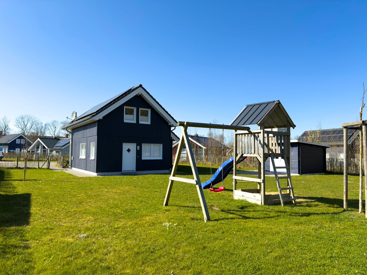 Der weitläufige und eingezäunte Garten lädt Kinder zum sicheren Toben und Spielen ein. Auf der angrenzenden Terrasse können Sie die Ruhe genießen und in die Natur eintauchen. Zwei Schlafzimmer haben Zugang zu einem überdachten Balkon, der Ihnen zusätzliche Entspannungsmöglichkeiten bietet. Der Außenbereich ist umfassend möbliert und hält Gartenspielzeug, Liegen, einen Sonnenschirm und einen Grill für Sie bereit.