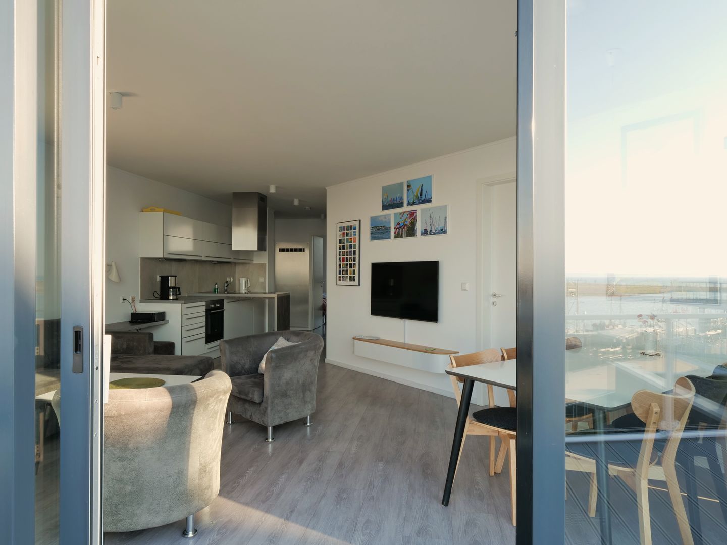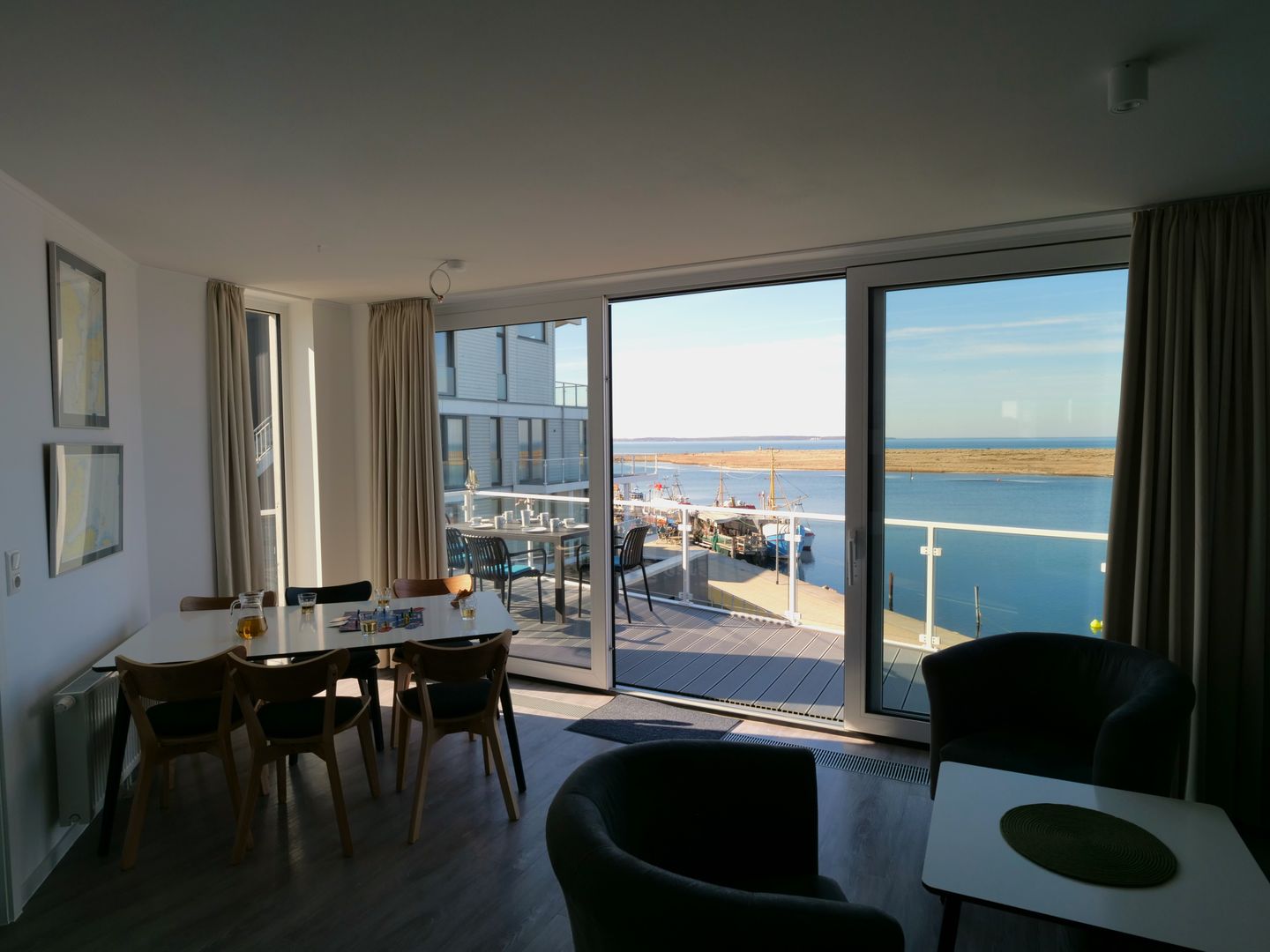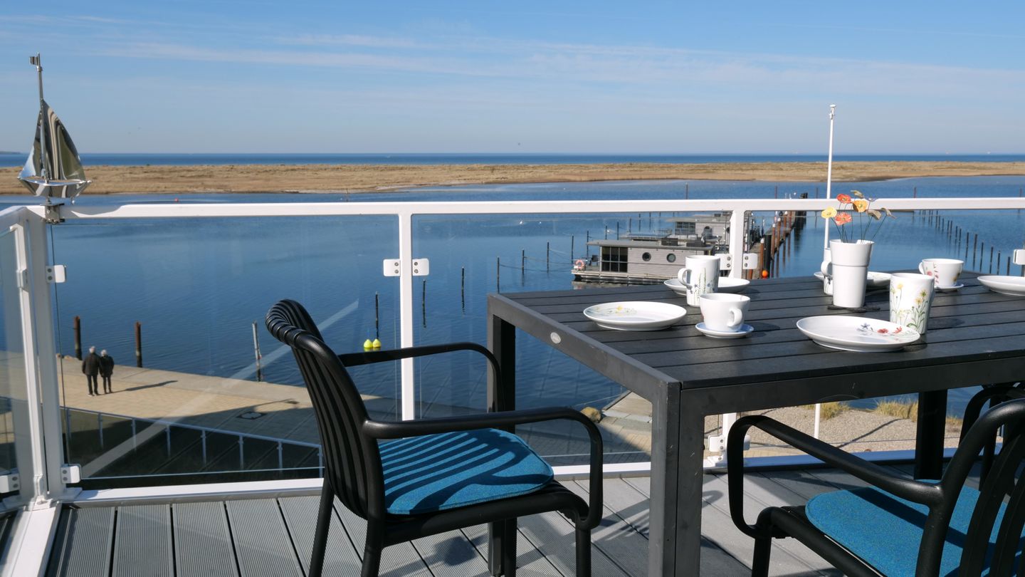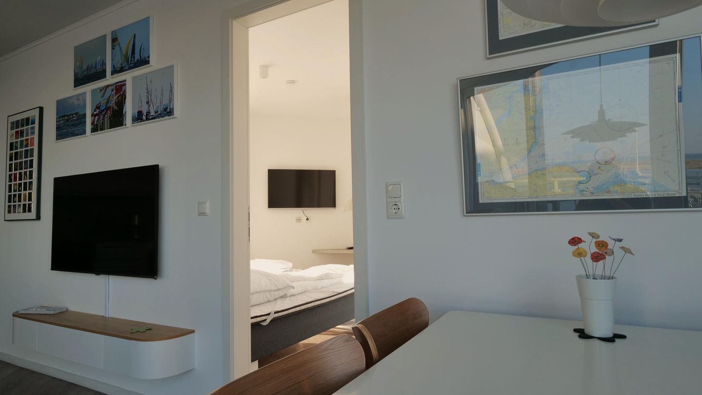 Das Herzstück der Wohnung bildet der offene Wohnbereich, der vom Wohn- und Esszimmer bis zur modernen Küche reicht. Hier kannst du gemeinsame Mahlzeiten zubereiten, während du die wunderschöne Aussicht auf das Meer durch die großen Fenster genießt. Ein besonderes Highlight stellt zudem die Terrasse dar, die mit 24 qm Größe umlaufend um die Wohnung verläuft und dir viele Möglichkeiten bietet, die frische Meeresluft im Freien zu genießen. Die voll ausgestattete Küche lässt keine Wünsche offen und bietet dir alles, was du für deinen Aufenthalt benötigst: von der Spülmaschine bis hin zur Espressomaschine, um deinen Morgen mit einer köstlichen Tasse Kaffee zu beginnen.