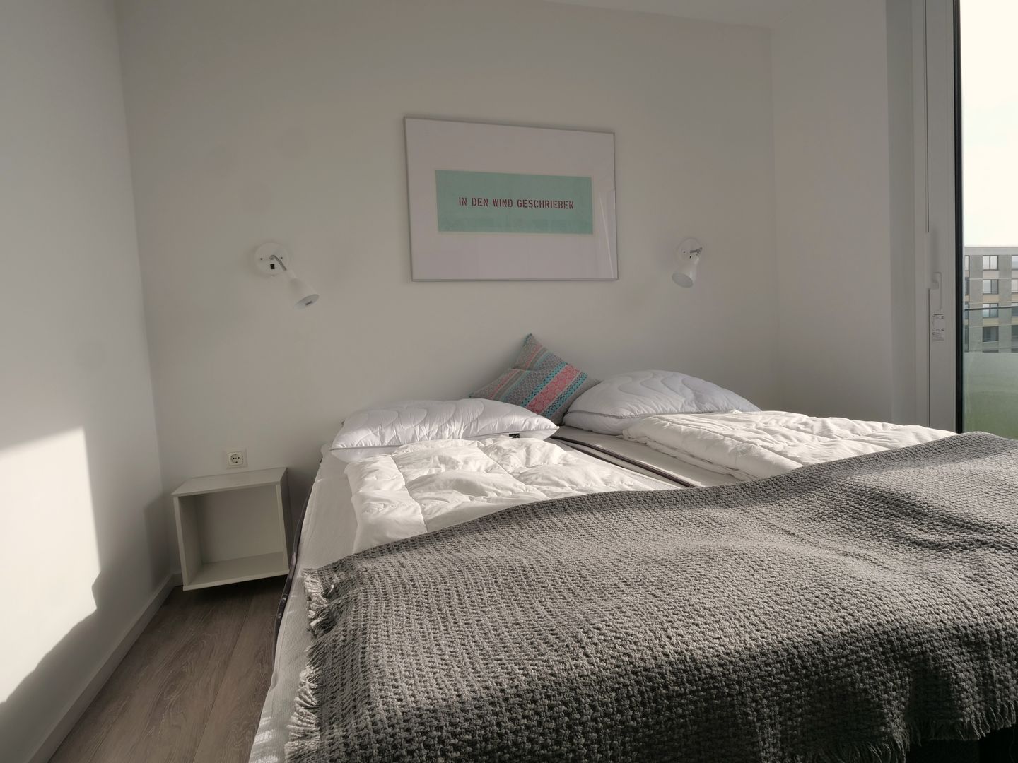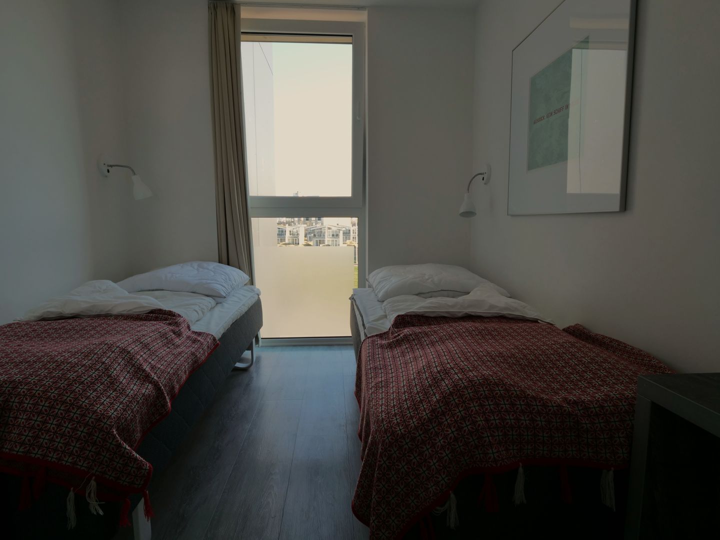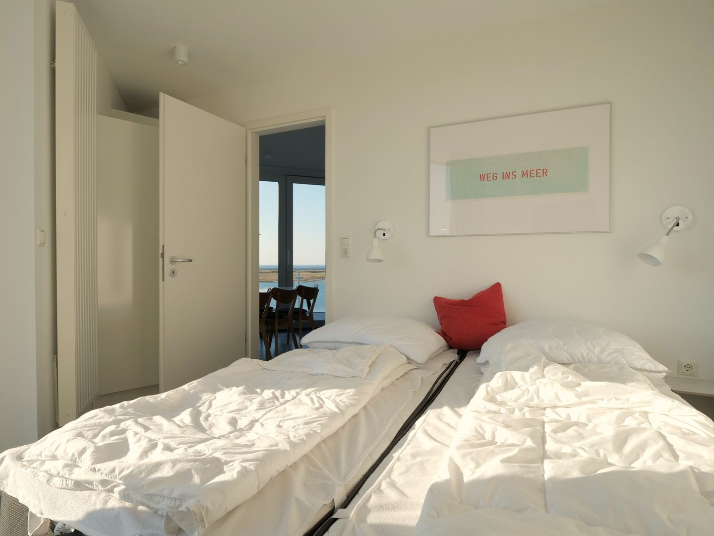 Das Herzstück der Wohnung bildet der offene Wohnbereich, der vom Wohn- und Esszimmer bis zur modernen Küche reicht. Hier kannst du gemeinsame Mahlzeiten zubereiten, während du die wunderschöne Aussicht auf das Meer durch die großen Fenster genießt. Ein besonderes Highlight stellt zudem die Terrasse dar, die mit 24 qm Größe umlaufend um die Wohnung verläuft und dir viele Möglichkeiten bietet, die frische Meeresluft im Freien zu genießen. Die voll ausgestattete Küche lässt keine Wünsche offen und bietet dir alles, was du für deinen Aufenthalt benötigst: von der Spülmaschine bis hin zur Espressomaschine, um deinen Morgen mit einer köstlichen Tasse Kaffee zu beginnen.