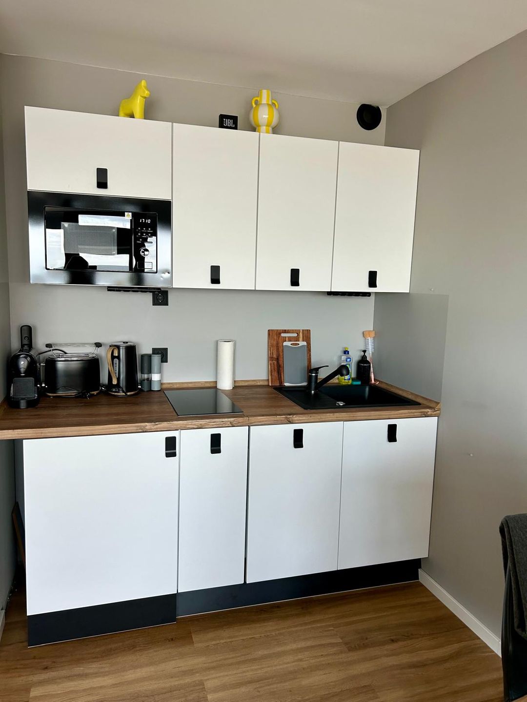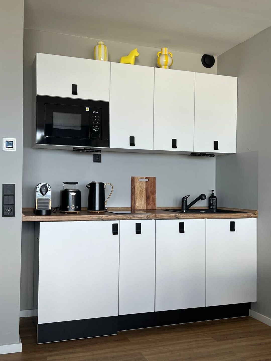 Die offene und moderne Küche ist in den Wohnraum integriert und bietet unter anderem einen Zwei-Platten-Herd, Kühlschrank mit Gefrierfach, Spülmaschine, Mikrowelle, Kapselkaffeemaschine (Cafissimo/ Tchibo), Wasserkocher, Toaster sowie allen Küchenutensilien, Geschirr und Besteck. Damit ist die Ferienwohnung gut für die unkomplizierte Selbstversorgung geeignet. Auch eine Erstausstattung und Geschirrhandtücher sind vorhanden.