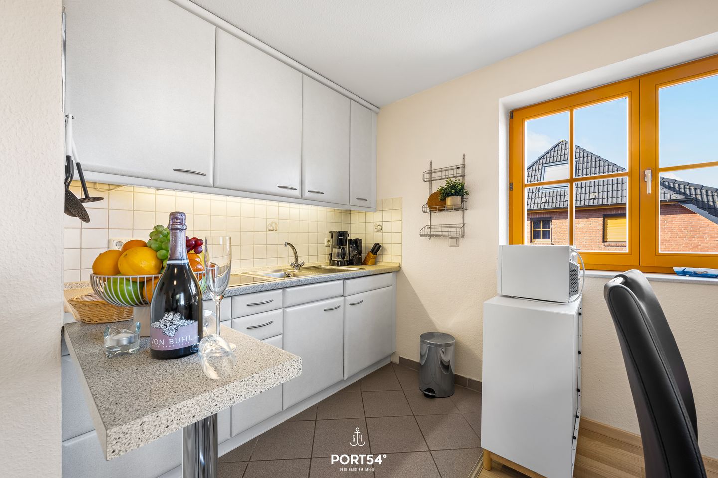 Auf 45 m² Wohnfläche bietet die Ferienwohnung durchdachten Komfort für bis zu drei Schlafmöglichkeiten, welche sich auf ein Schlafzimmer (zwei elektrisch verstellbare und zusammengeschobene Einzelbetten) und eine Schlafcouch im Wohnzimmer verteilen (max. ein Erwachsener und ein Kind). Ein modernes Badezimmer mit Dusche und Tageslicht sorgt für angenehme Privatsphäre und Funktionalität. Das gesamte Interieur besticht durch hochwertige Laminat- und Fliesenböden im Schlaf- und Wohnzimmer, moderne Materialien und einen offenen Grundriss: Die offen gestaltete Küche ist harmonisch in den Wohnbereich integriert und bestens ausgestattet mit Ceranherd Kühlschrank mit Gefrierfach, Mikrowelle, Kaffeemaschine, Wasserkocher und Toaster. Selbstverständlich stehen Ihnen sämtliche Küchenutensilien, Geschirr und Besteck sowie Geschirrhandtücher zur Verfügung.