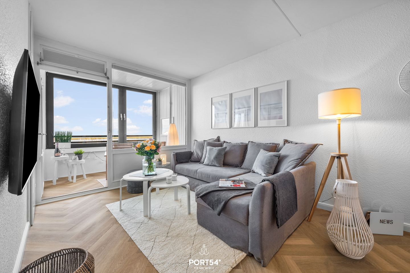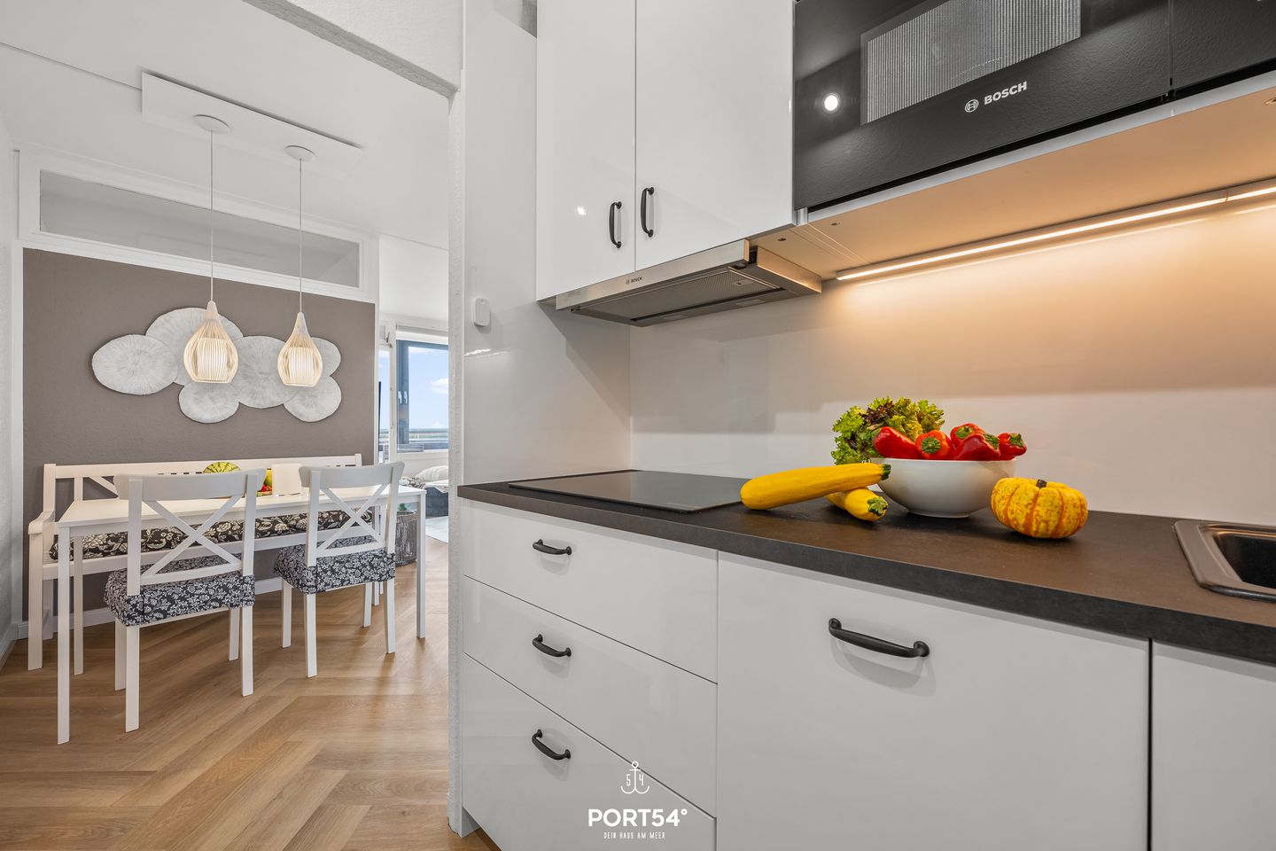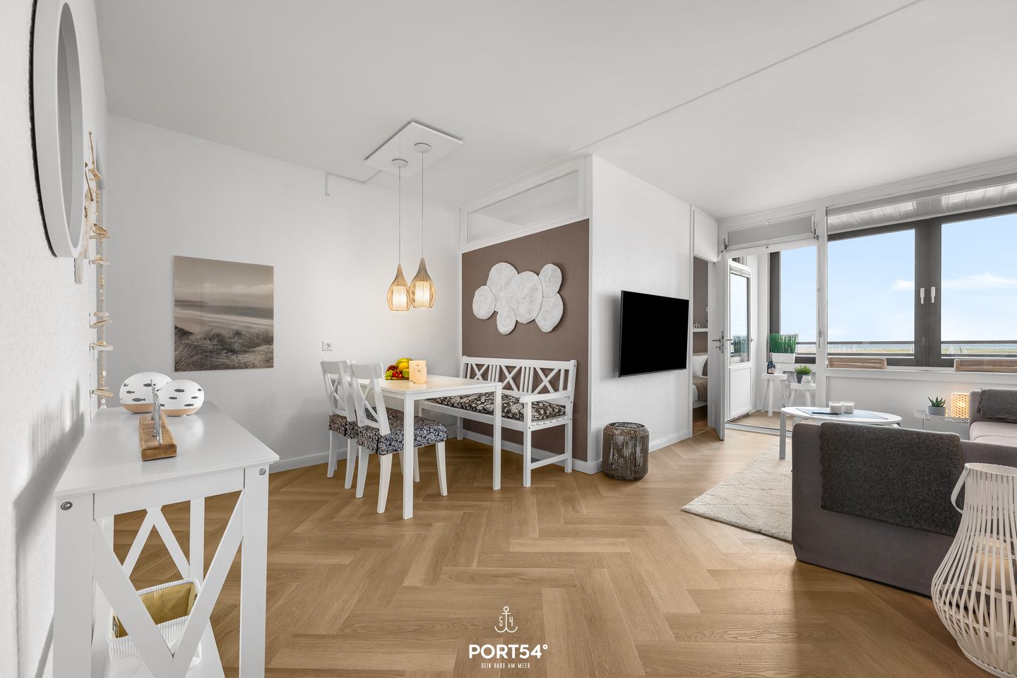 Die Wohnung befindet sich im 6. Stock und beeindruckt mit einem außergewöhnlich guten Meerblick, der Ihnen bereits beim Aufwachen den Atem rauben wird. Genießen Sie die frische Meeresluft, während Sie den Sonnenaufgang über der Ostsee beobachten. Die lichtdurchfluteten Räumlichkeiten sind geschmackvoll eingerichtet und bieten Ihnen eine gemütliche Atmosphäre. Der offene Wohnbereich mit einer komfortablen Sofaecke (Schlafcouch) lädt zum Entspannen ein und ist mit einem 48-Zoll-Fernseher sowie einer HiFi-Anlage ausgestattet. Ein extra Schlafzimmer, das durch eine verschließbare Tür vom Wohnraum abgetrennt ist verfügt über ein Doppelbett.