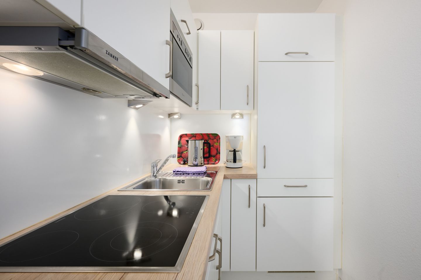 Die geschlossene Küche ist komplett ausgestattet: Ceranherd, Backofen, Mikrowelle, Spülmaschine, Kühlschrank mit Gefrierfach, Kaffeemaschine, Tassimo-Kaffee-/Espressomaschine, Wasserkocher, Toaster sowie zahlreiche Küchenutensilien, Geschirr und Besteck. Auf Wunsch erleichtert ein Einkaufsservice deine Ankunft.