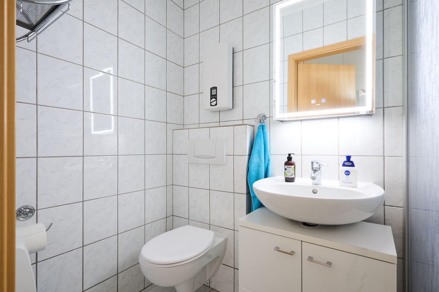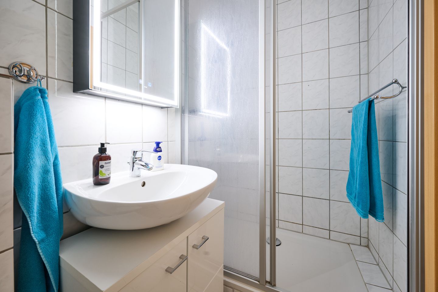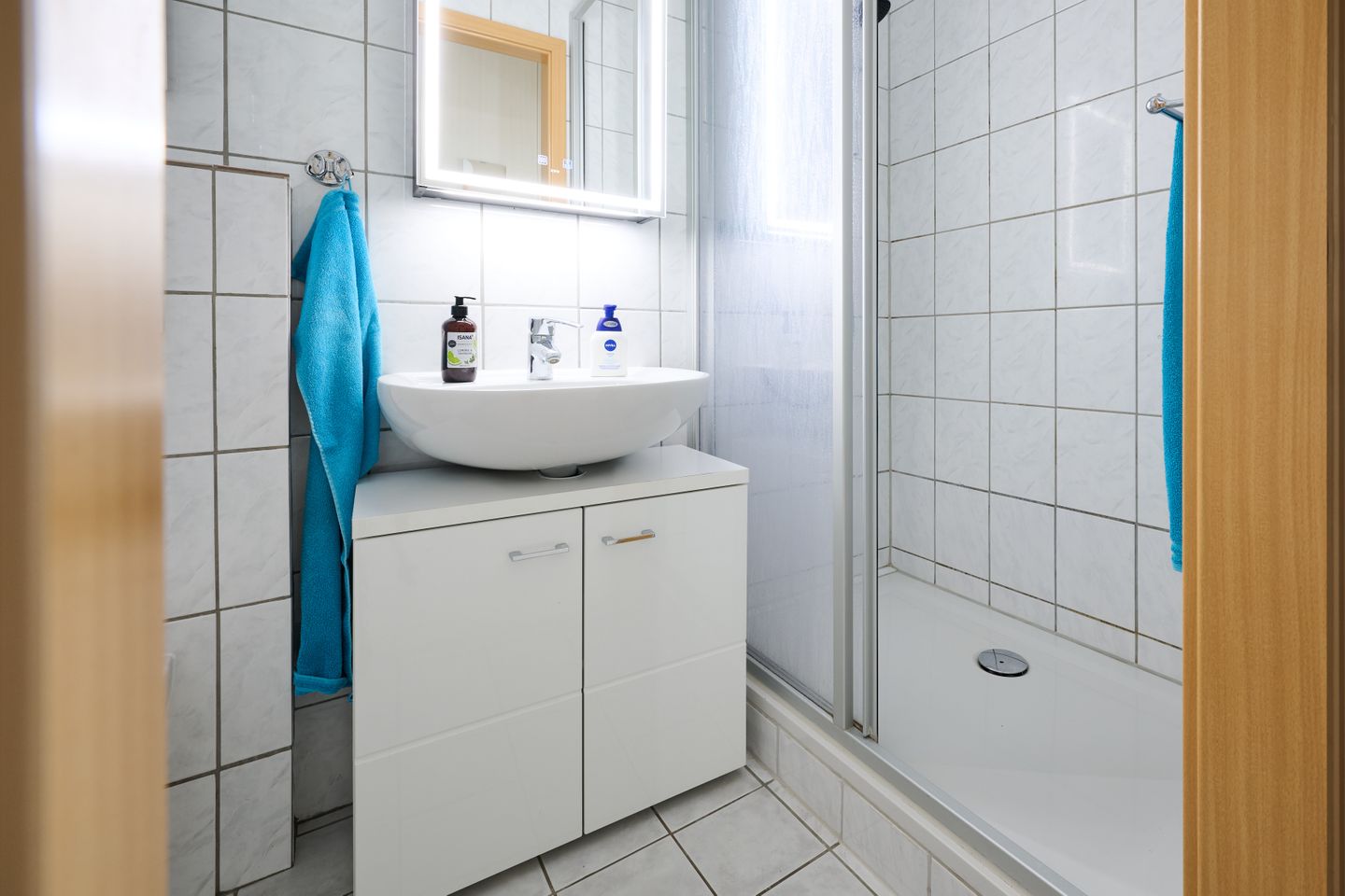 Das Badezimmer ist mit Dusche, WC, Waschbecken, Kosmetikspiegel und Haartrockner ausgestattet.