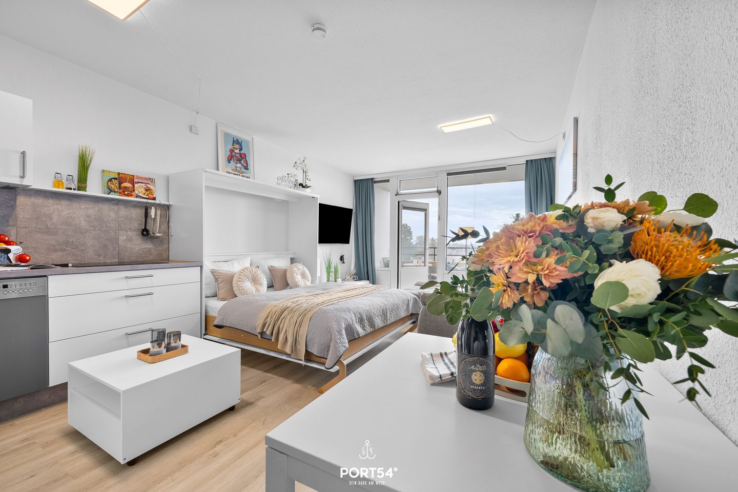 Die helle, offen gestaltete Ein-Raum-Ferienwohnung verfügt über ein großes Schlafsofa, ein Murphy-Schrankbett, einen Essbereich und eine moderne Küchenzeile. Diese ist offen zum Wohnraum und mit zahlreichen Annehmlichkeiten ausgestattet: Neben einem Induktionsherd, Backofen, Kühlschrank mit Gefrierfach, Mikrowelle und Spülmaschine sind auch eine Senseo-Espressomaschine, Toaster, Wasserkocher sowie Geschirr und Küchenutensilien vorhanden. Ein Esstisch bietet den perfekten Ort für gemeinsame Mahlzeiten.
