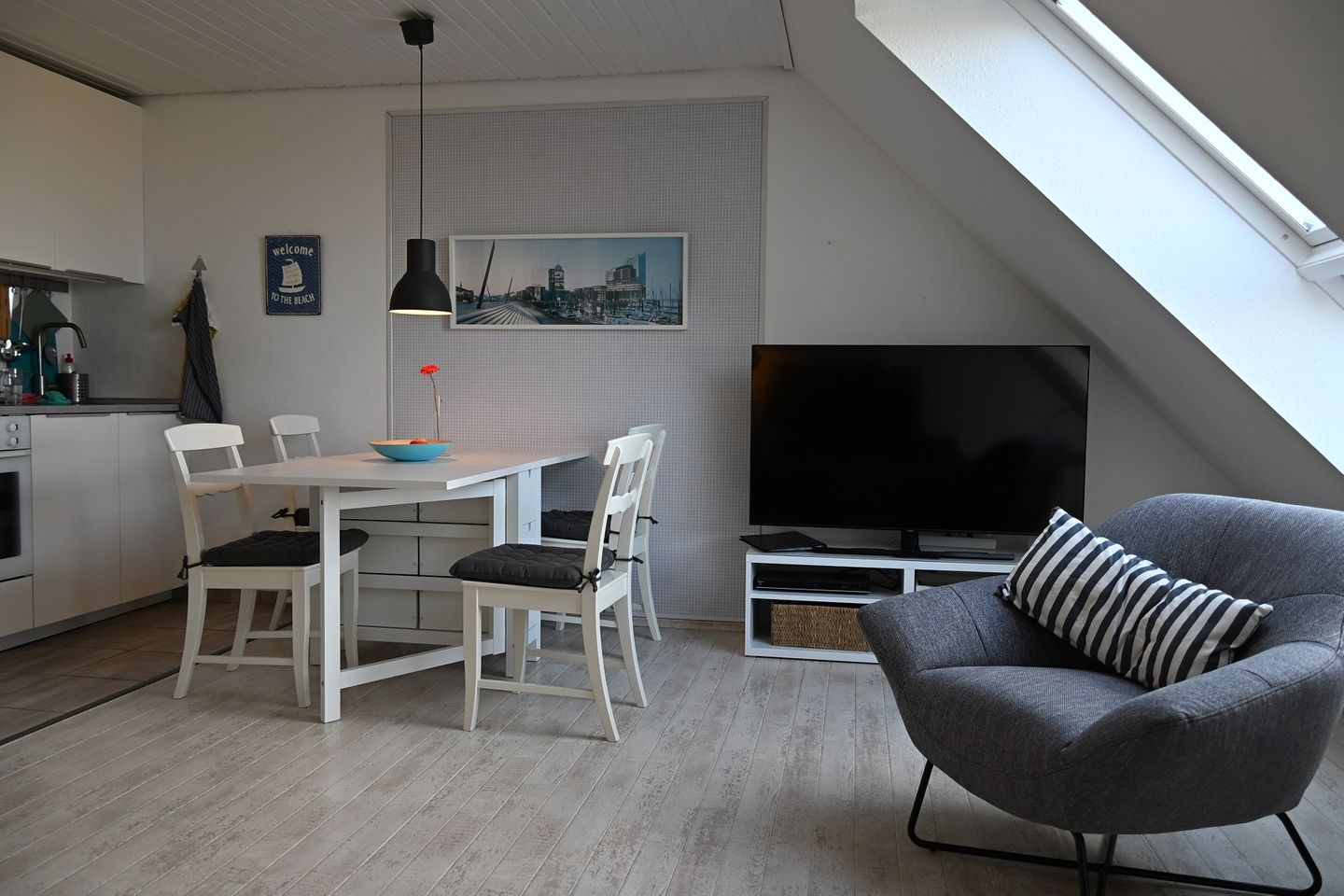 Die modern ausgestattete, helle Ferienwohnung ist von der Lage her ideal für Surfer und Segler. Surf-und Segelschulen befinden sich in unmittelbarer Nähe. Ebenso nur wenige Gehminuten entfernt finden Sie Restaurants (u.a. Ahoi by Steffen Hensler; Restaurant im Hotel Slow Down; Restaurant "Gut Salzig"; Janny´s Eis) und den Sportboothafen Marina Wendtorf mit der Möglichkeit, vormittags vom Fischkutter frisch gefangenen Fisch zu kaufen. Ein Supermarkt befindet sich in Fußgehentfernung in Wendtorf. Das Ostseebad Laboe mit einer Fährverbindung nach Kiel ist 5 km entfernt, die Strandbäder Heidkate und Kalifornien befinden sich ebenfalls in der Nähe. Unmittelbar vor der Tür liegen Sandstrand und Dünen, zur Seebrücke sind es nur wenige Minuten. Einen Bäcker finden Sie in der Marina, ein Supermarkt liegt in Fahrradentfernung. Interessant für Schlechtwettertage ist das Ende 2024 eröffnete Indoor-Spielparadies für Kinder in der Marina Wendtorf. Seit Anfang 2025 besteht die Möglichkeit, gegen Gebühr die Wellness-Landschaft des neu eröffneten Hotels "Slow Down" in der Marina zu benutzen.