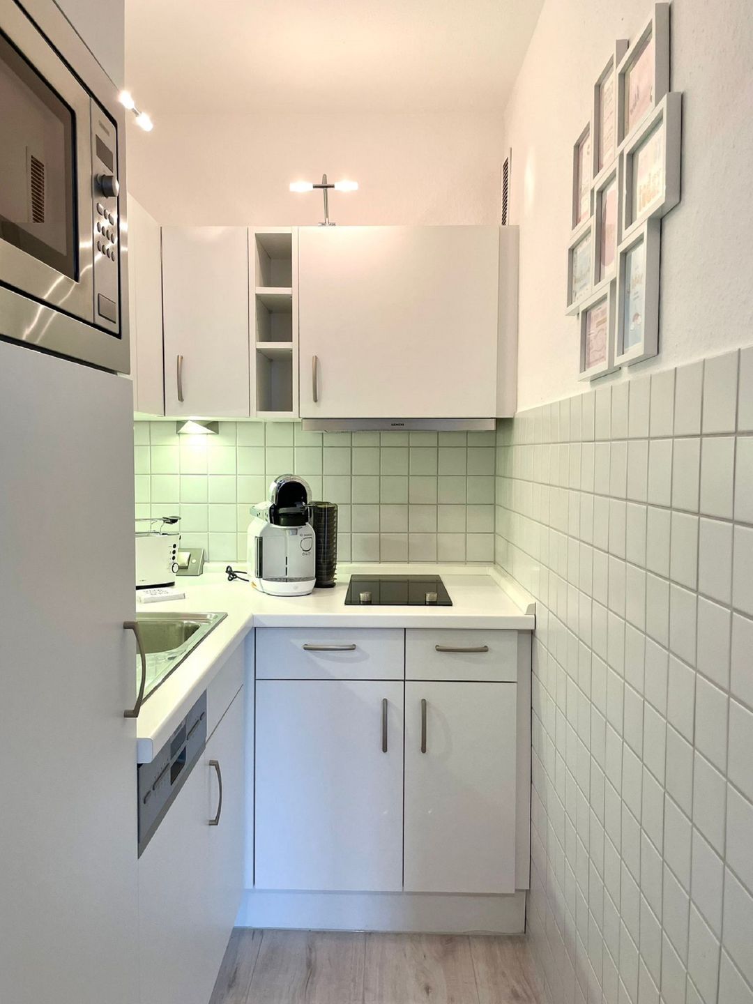 Die offen zum Wohnzimmer gestaltete Küche ist umfangreich und funktional eingerichtet. Sie verfügt über einen Kühlschrank mit Gefrierfach, Spülmaschine, 2-Platten-Herd, Mini-Backofen, Mikrowelle, Toaster, Wasserkocher, Tassimo-Espressomaschine sowie alle notwendigen Küchenutensilien, Geschirr und Besteck. Der angrenzende Essbereich mit Esstisch lädt zu gemeinsamen Mahlzeiten ein und bietet ausreichend Platz.