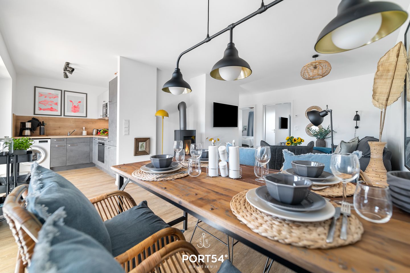 Die im Erdgeschoss gelegene Wohnung bietet dir viel Komfort und eine freundliche Wohlfühlatmosphäre. Das Herzstück ist der helle und geräumige Wohn- und Essbereich, der mit seiner gemütlichen Einrichtung sofort für Urlaubsgefühl sorgt. Auf der bequemen Couch kannst du es dir nach einem erlebnisreichen Tag wunderbar gemütlich machen. Besonders in der kalten Jahreszeit entfaltet die Wohnung ihren besonderen Charme: Dann sorgt der Kamin für wohlige Wärme und eine behagliche Atmosphäre, während dich die Infrarot-Sauna zu entspannenden Wohlfühlmomenten einlädt. Nach einem langen Strandspaziergang kannst du hier wunderbar abschalten, aufwärmen und den Tag entspannt ausklingen lassen.