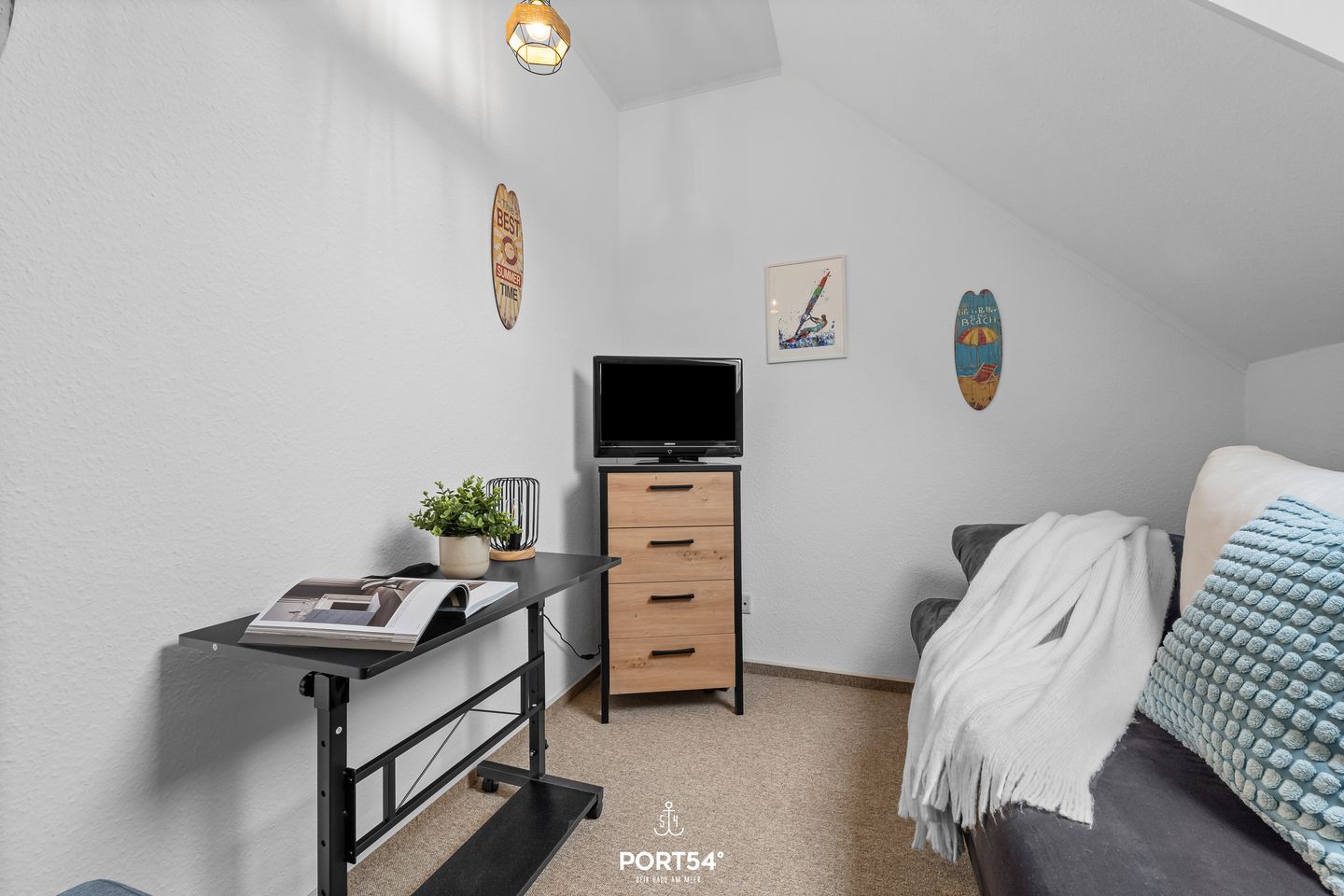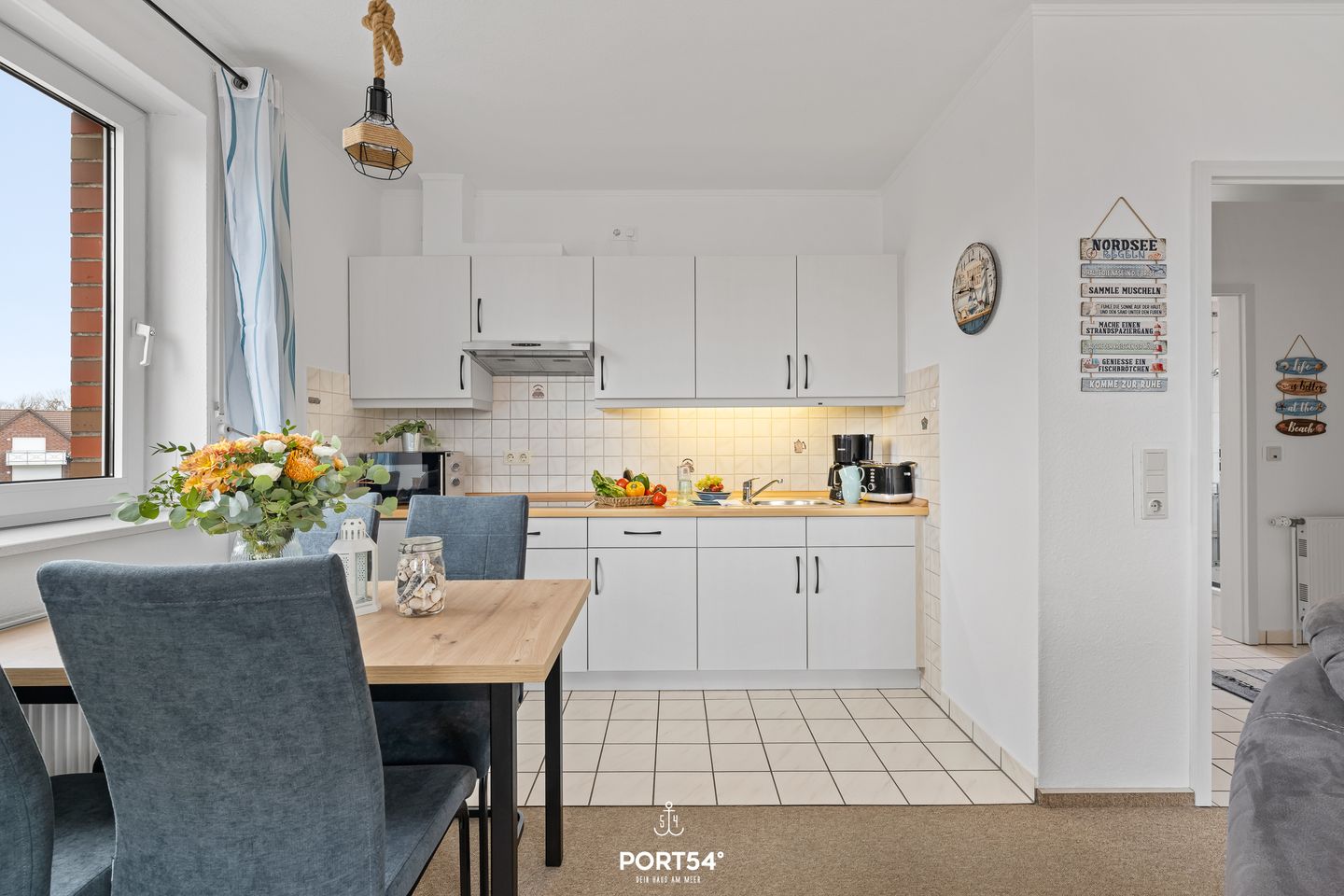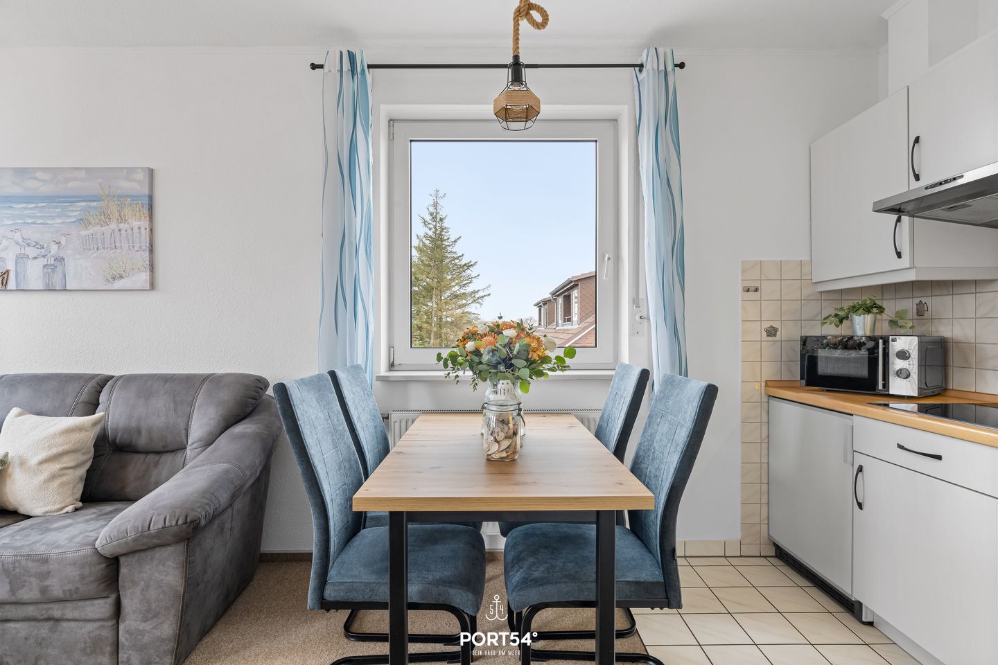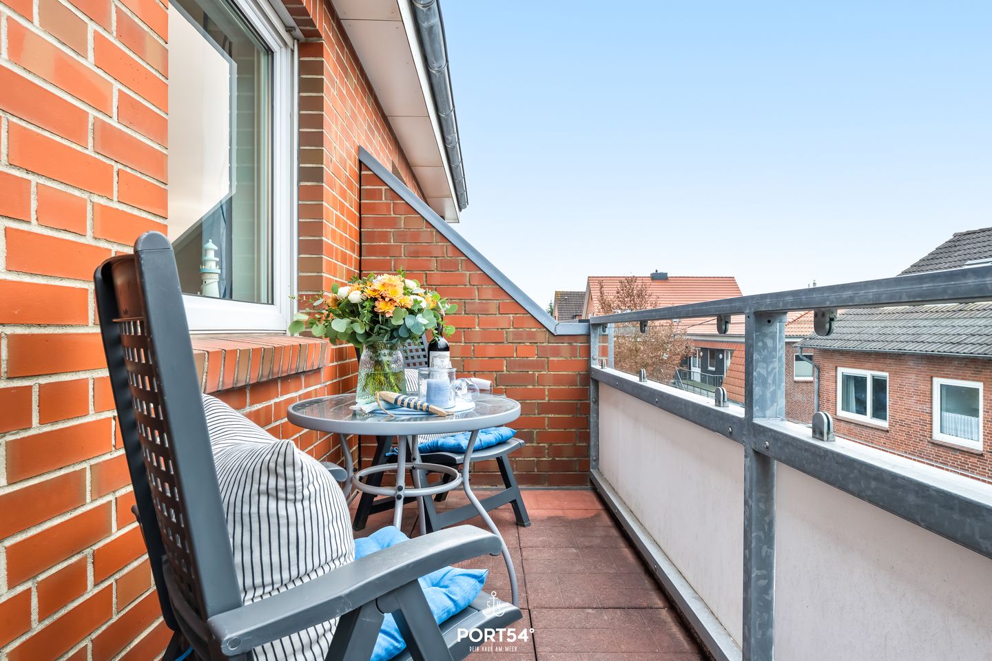Der eigene Balkon erweitert den Wohnraum nach draußen. Ausgestattet mit bequemen Gartenmöbeln und einem Sonnenschirm, lädt er dazu ein, die frische Nordseeluft in privater Atmosphäre zu genießen. Für Familien mit kleinen Kindern steht ein tragbarer Sitz mit Tisch zur Befestigung am Esszimmerstuhl bereit.