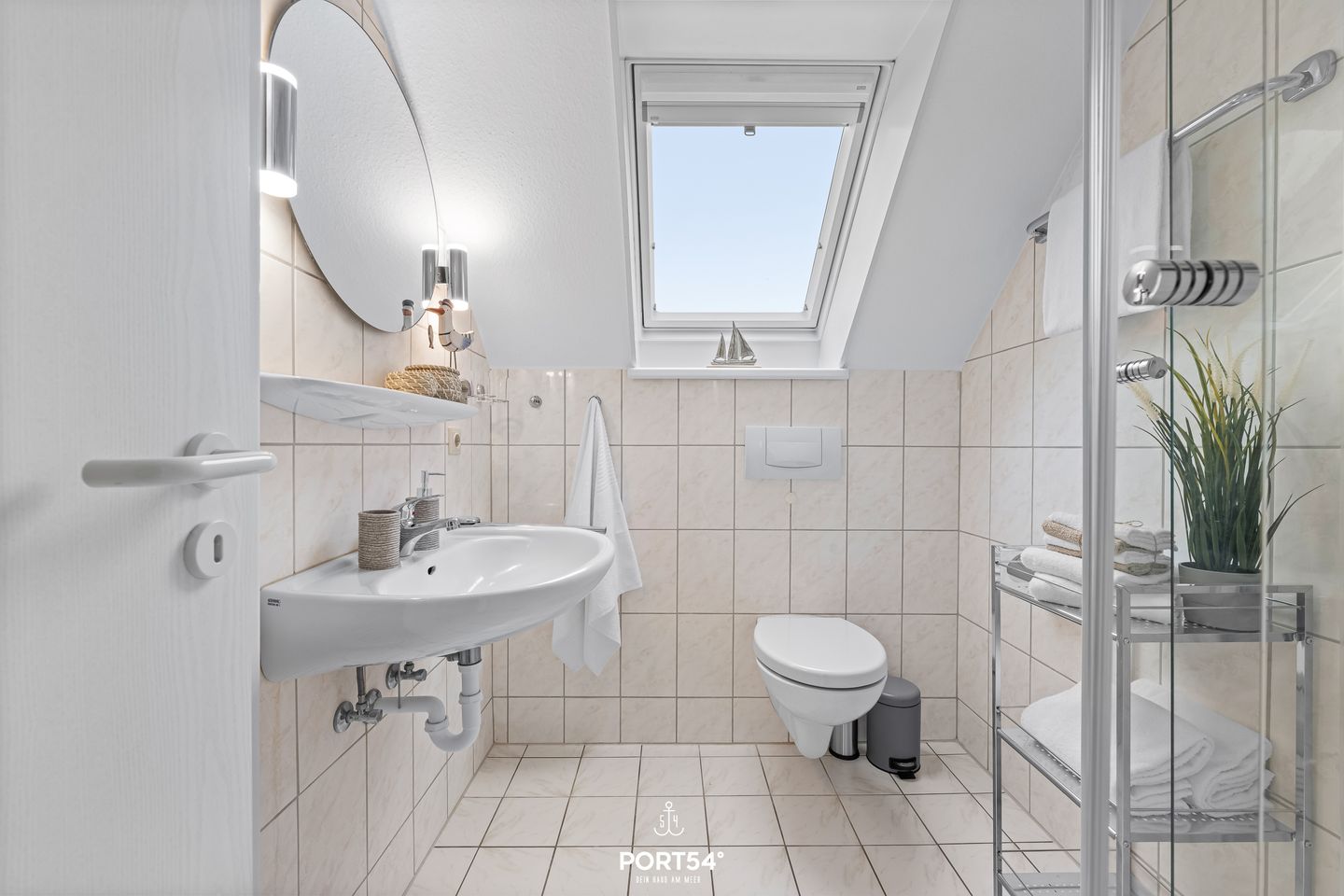 Das Badezimmer verfügt über eine Dusche, WC, Haartrockner, Spiegel und Kosmetikspiegel. Für den Sichtschutz sorgt ein Velux-Rollo. Zudem stehen dir in einem Abstellraum eine 3-kg-Waschmaschine zur Eigennutzung, Bügeleisen, Bügelbrett und Wäscheständer zur Verfügung. Heizung, eine Erstausstattung mit Bettwäsche sowie diverse Reinigungsutensilien, einschließlich Staubsauger, sind ebenfalls vorhanden.