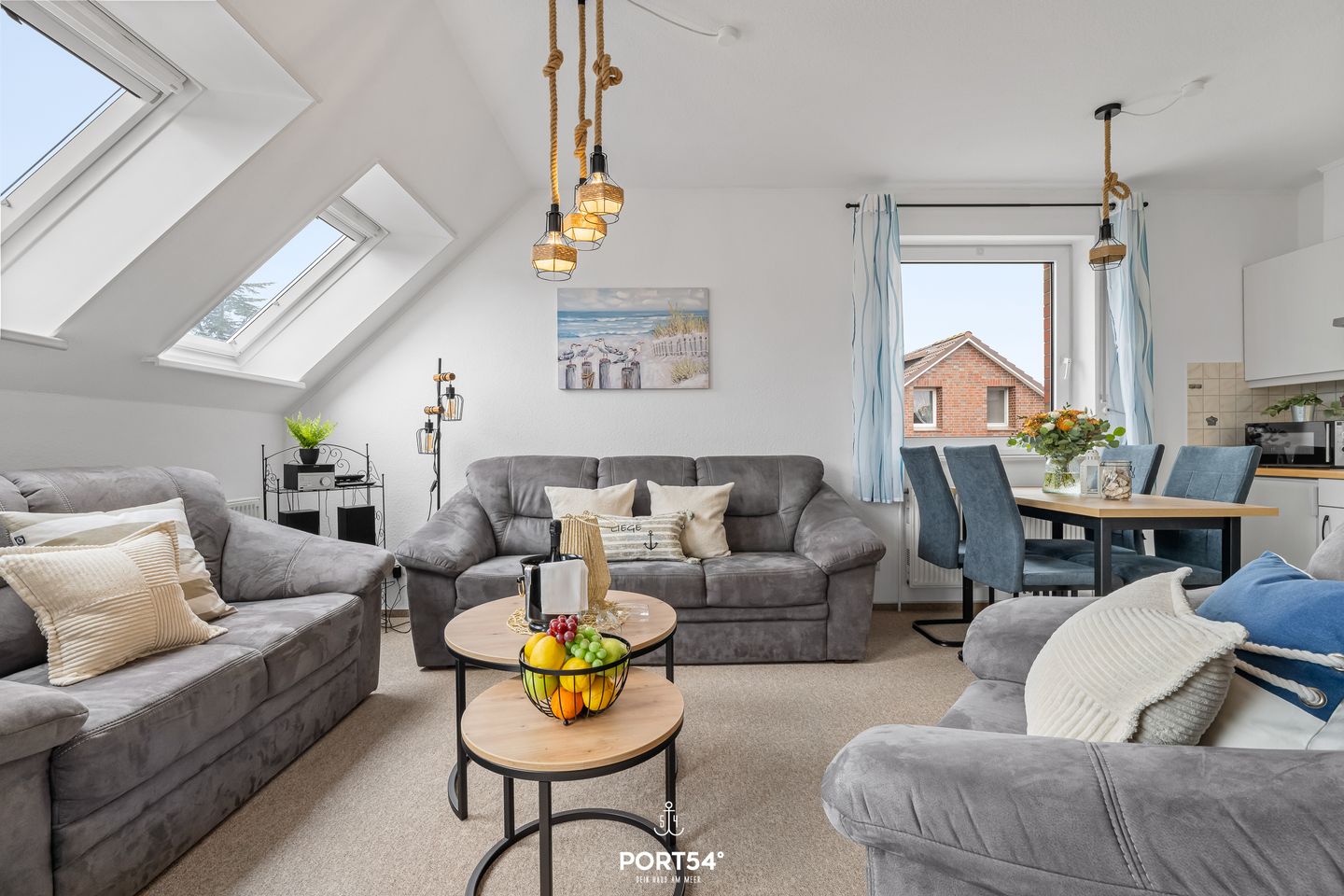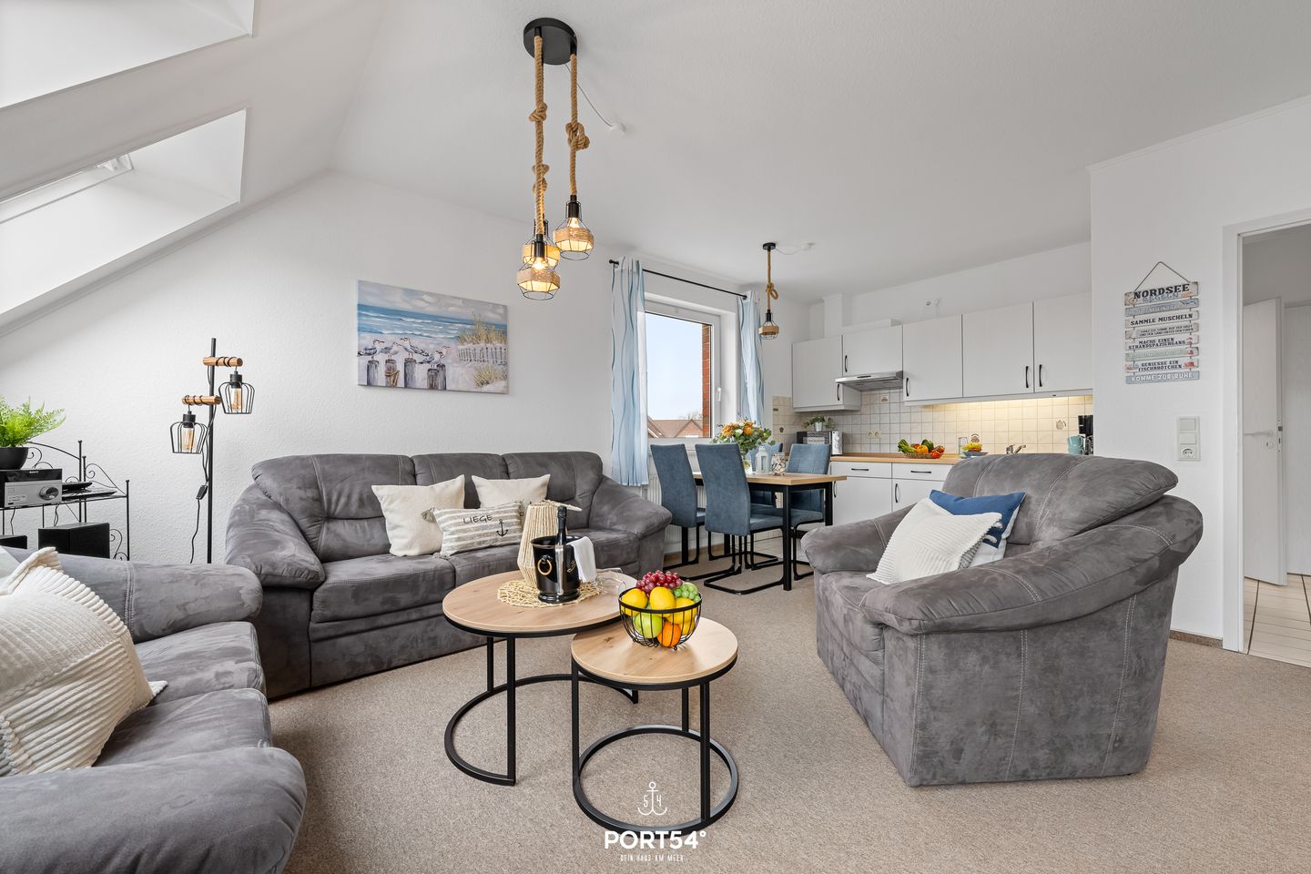 Die offene Küche ist nahtlos in den Wohnbereich integriert und umfassend ausgestattet mit Cerankochfeld, Kühlschrank mit Gefrierfach, Geschirrspülmaschine, Mikrowelle mit Grillfunktion, Wasserkocher, Toaster und Kaffeemaschine. Der angrenzende Essbereich und die gemütliche Sofaecke schaffen eine angenehme Atmosphäre für gemeinsame Mahlzeiten oder entspannte Abende. Ein Fernseher sowie kostenfreies WLAN stehen dir zur Unterhaltung zur Verfügung.