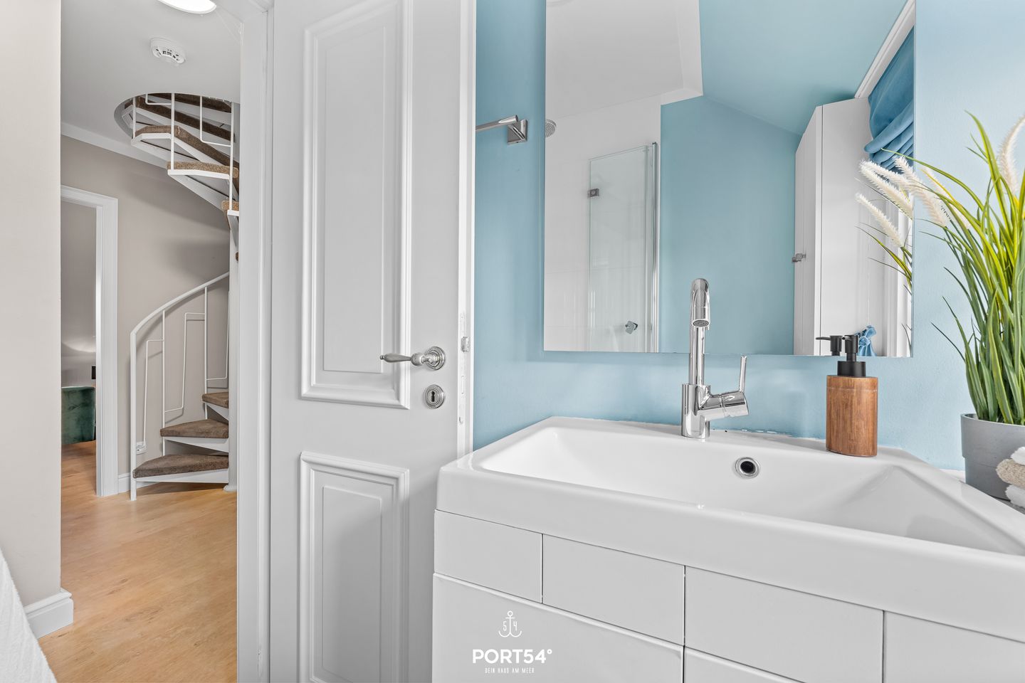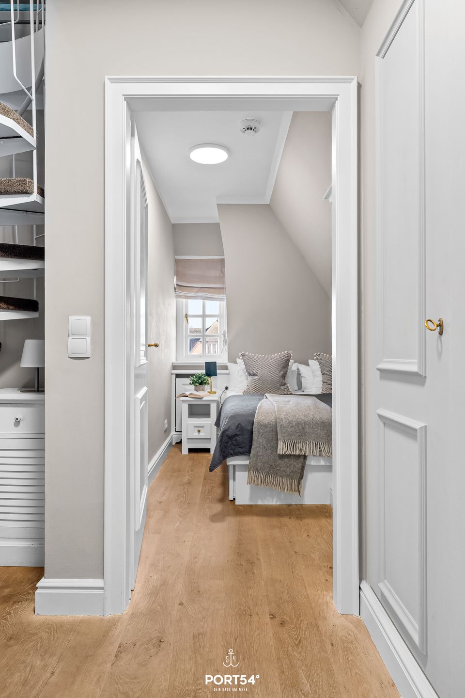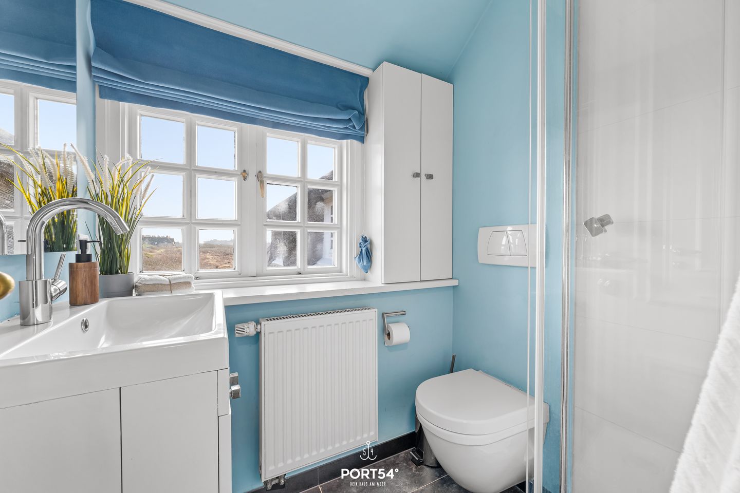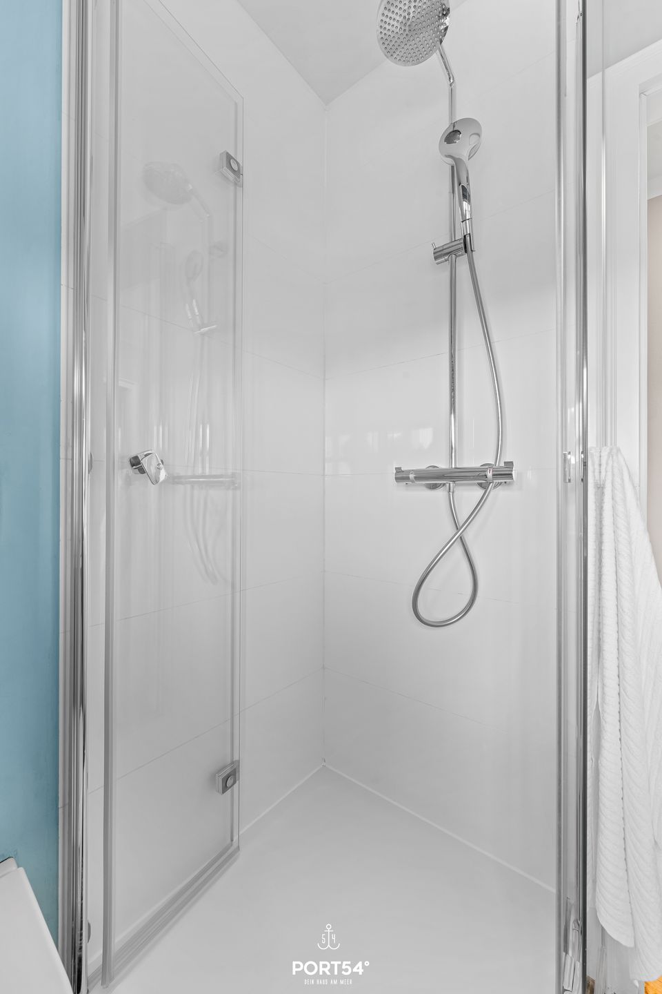 Das moderne Tageslicht-Duschbad ist über den Flur erreichbar und mit einer Dusche, einem großen Spiegel, Haartrockner, warmem Wasser und weiteren Ablagemöglichkeiten ausgestattet. Zusätzlicher Stauraum befindet sich im Flur sowie im Spitzboden in Form weiterer Einbauschränke – ideal für längere Aufenthalte.