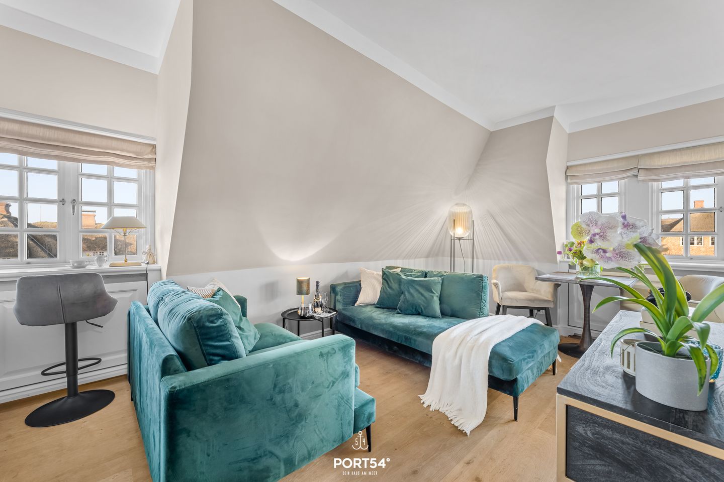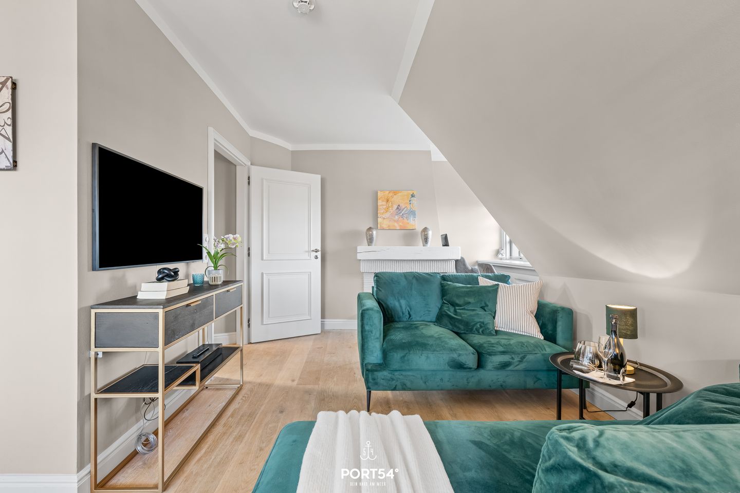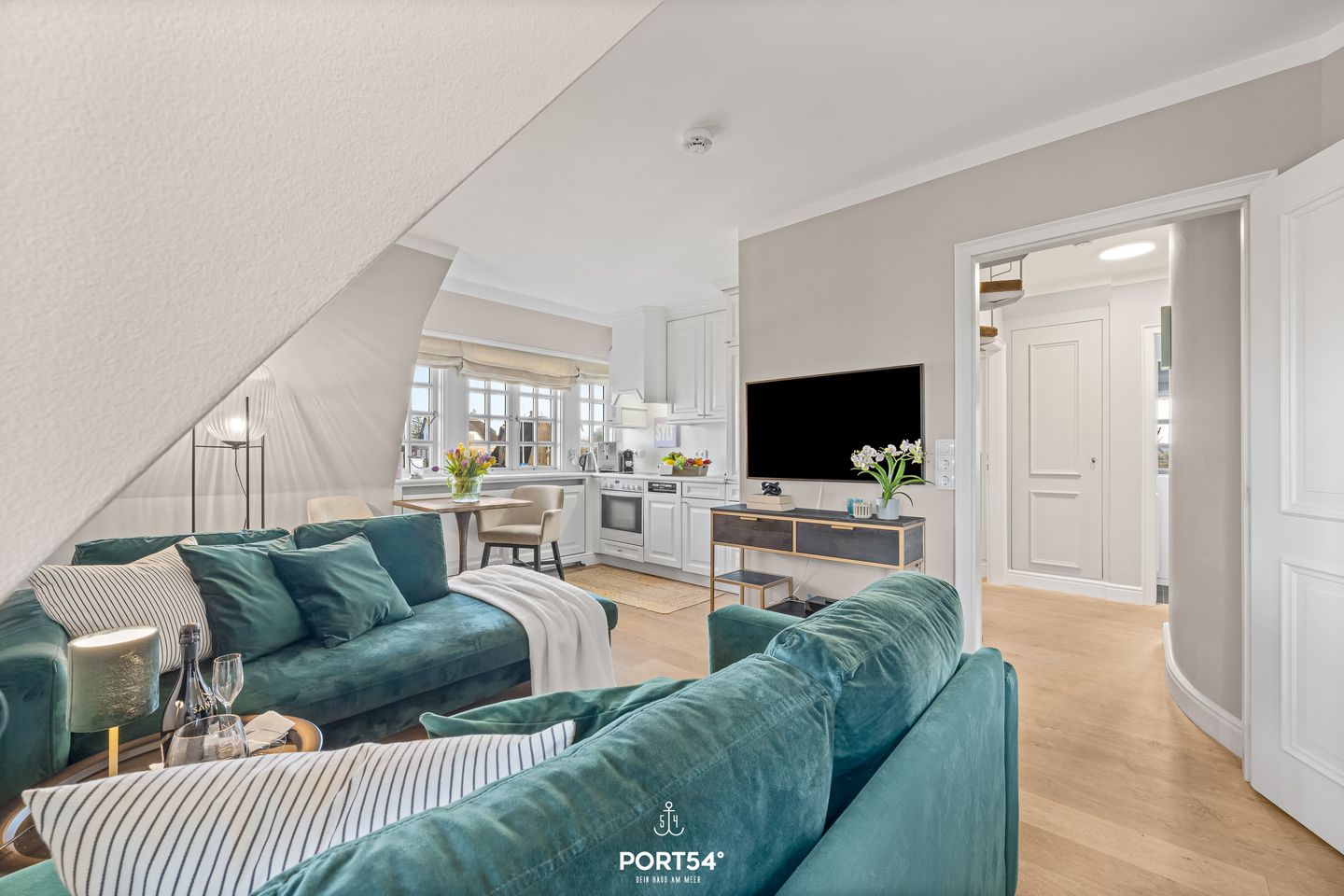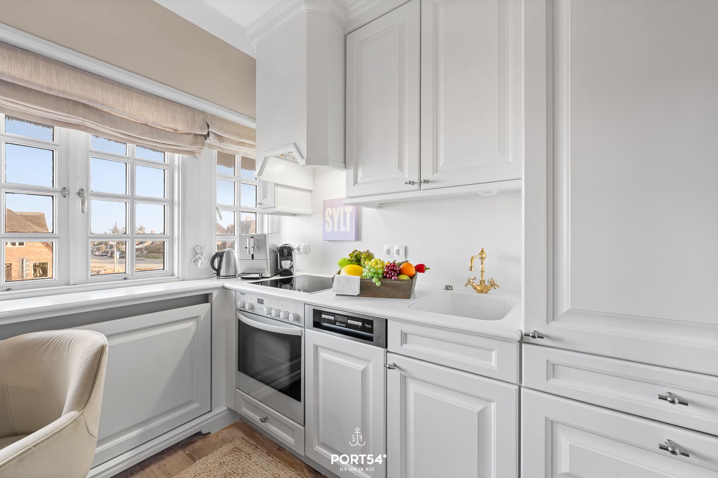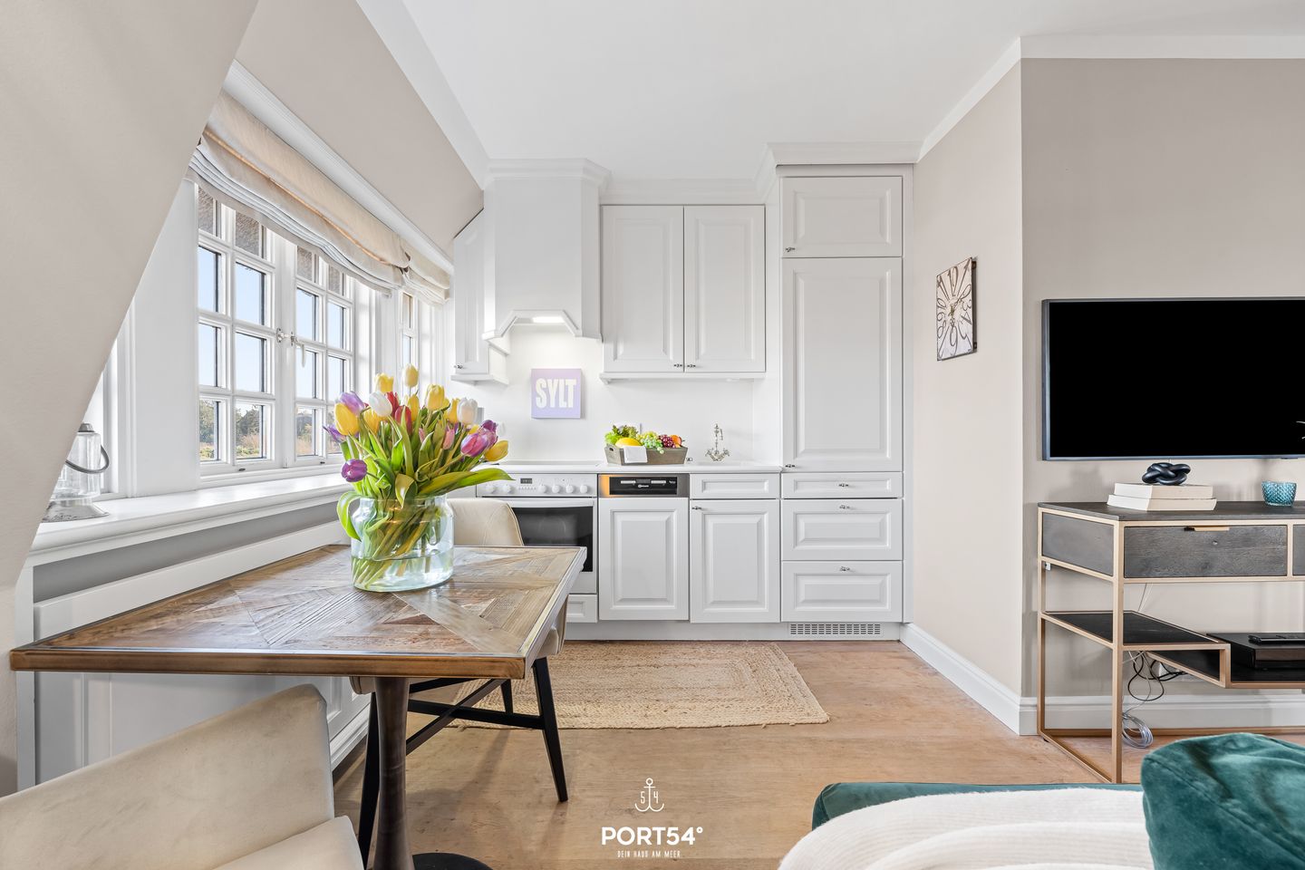 Das etwa 55 m² große Appartement verteilt sich geschickt und komfortabel auf zwei Etagen. Der einladende Wohn- und Essbereich bildet das Herzstück der Unterkunft: Helle, moderne Möbel, ein gemütliches Sofa, ein Esstisch sowie ein romantischer Kamin schaffen eine Atmosphäre, in der du dich sofort wohlfühlst. Durch die großen Fenster genießt du einen herrlichen Blick auf die Nordsee – perfekt für entspannte Stunden, einen Sundowner am Abend oder gemütliche Lesemomente. Die offen integrierte Küchenzeile ist großzügig und funktional gestaltet. Sie bietet alles, was du für einen komfortablen Aufenthalt benötigst: Backofen, Ceranfeld, Geschirrspüler, Kühlschrank mit Gefrierfach, Kaffeemaschine, Kaffeevollautomaten, Wasserkocher, Toaster sowie alle wichtigen Küchenutensilien. Ob ein schnelles Frühstück oder ein liebevoll gekochtes Abendessen – hier bleiben keine Wünsche offen.