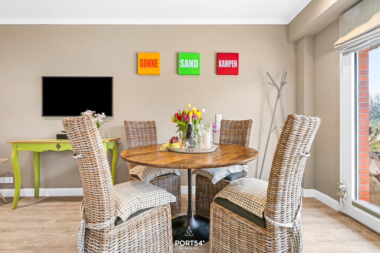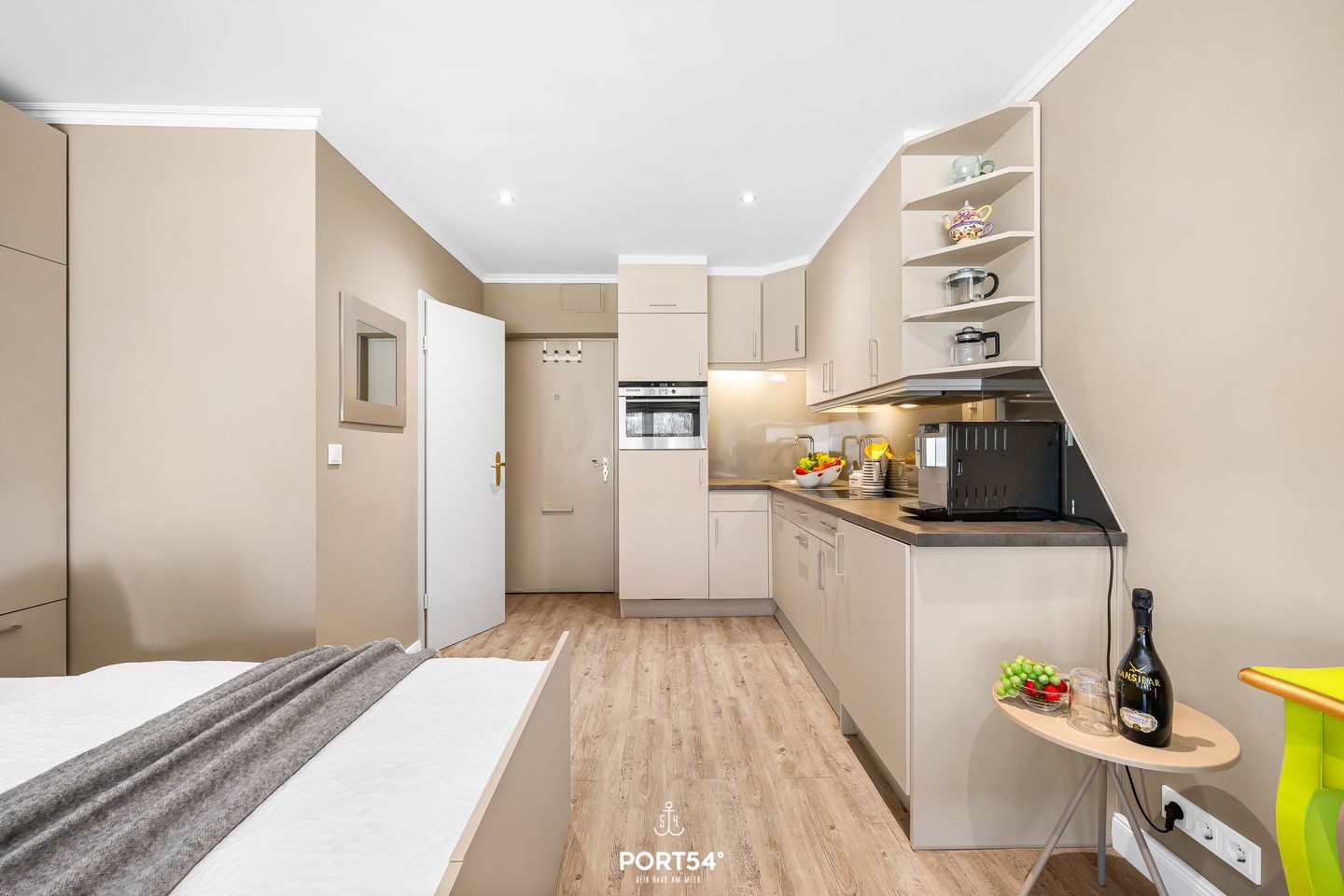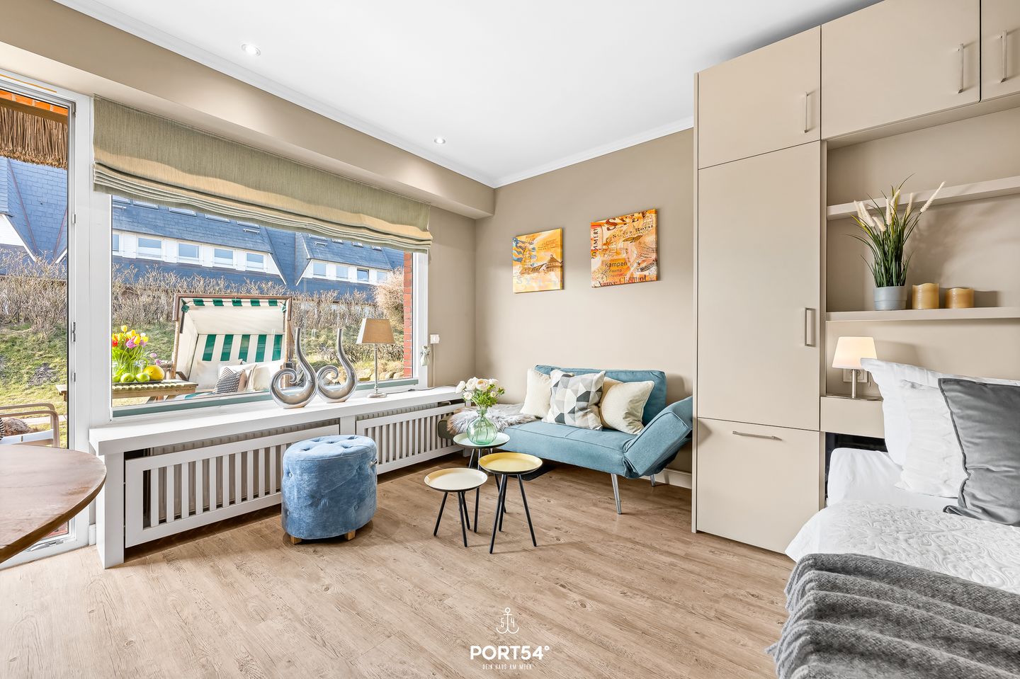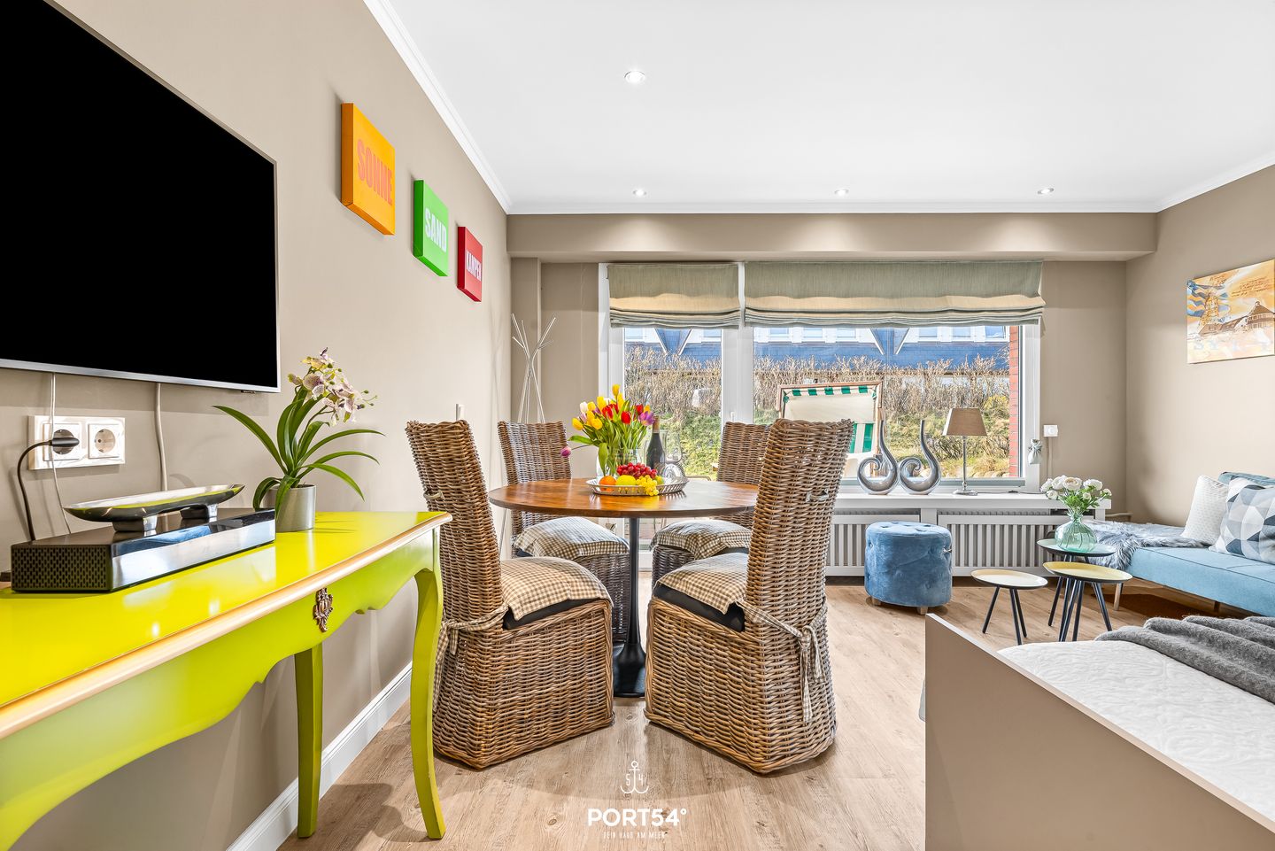 Das Studio-Appartement „Lieblingsplatz am Meer No. 2“ im charmanten Reetdachhaus Haus Kampbarg begrüßt dich in bester Lage von Kampen auf Sylt. Komplett renoviert, stilvoll eingerichtet und mit viel Feingefühl gestaltet, bietet dieses Feriendomizil auf kleiner, aber perfekt genutzter Fläche einen modernen, behaglichen Rückzugsort für zwei Personen, die Wert auf Komfort, Qualität und eine strandnahe Lage legen. Schon beim Betreten spürst du die besondere Atmosphäre des Studios: Ein harmonisches Farbkonzept, moderne Materialien und eine durchdachte Raumaufteilung schaffen ein Wohngefühl, das gleichermaßen gemütlich wie funktional ist. Das einladende Doppelbett lässt sich tagsüber mühelos verstauen und eröffnet damit großzügigen Wohnraum. Die separate Couch bietet auch tagsüber einen komfortablen Sitzplatz, ideal zum Lesen, Entspannen oder für gemütliche Stunden am Abend. Der runde Esstisch direkt am Fenster schafft einen hellen Ort für gemeinsame Mahlzeiten, Frühstück oder als ruhige Ecke zum Arbeiten. Der moderne Fernseher ist so platziert, dass er von allen Sitzbereichen und dem Bett aus einsehbar ist – perfekt für abwechslungsreiche Unterhaltung ganz nach deinem Geschmack.