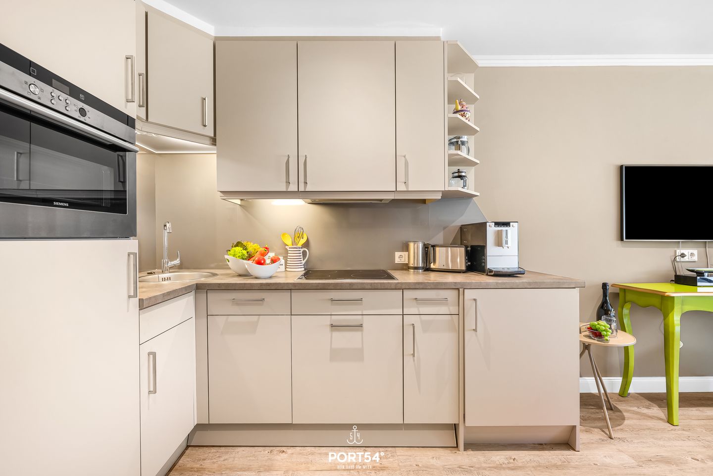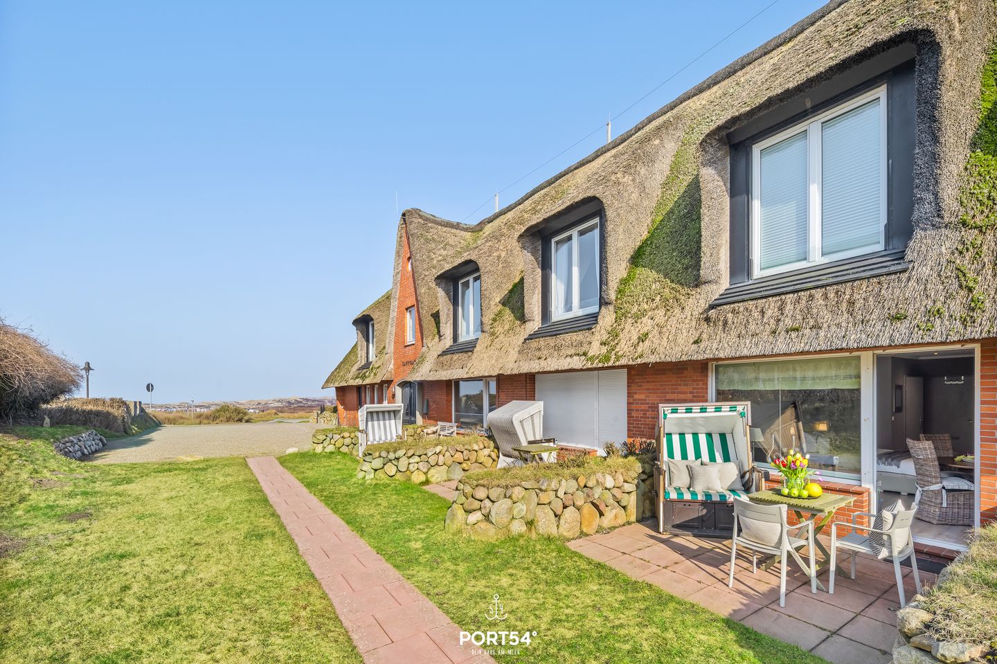 Die offen gestaltete Küchenzeile fügt sich harmonisch in den Wohnbereich ein und überzeugt mit einer modernen, umfangreichen Ausstattung, die Selbstversorgern alles bietet, was sie im Urlaub benötigen: Herd, Backofen, Mikrowelle, Kühlschrank mit Gefrierfach, Spülmaschine, Kaffeevollautomat, Wasserkocher, Toaster sowie Geschirr, Besteck und Küchenutensilien. Hier wurde an alles gedacht, um das Kochen angenehm und unkompliziert zu gestalten. Vom Wohnraum aus gelangst du direkt auf die Terrasse, die das Appartement in den warmen Monaten optimal erweitert. Ausgestattet mit Gartenmöbeln, Tisch, passenden Stühlen und einem gemütlichen Strandkorb, ist dieser Außenbereich ein wunderschöner Ort, um sonnige Stunden zu genießen, zu frühstücken oder abends bei frischer Meeresluft zu entspannen. Dank des seitlichen Meerblicks und des traditionellen Friesenwalls bietet die Terrasse echtes Sylt-Flair im privaten Rahmen.