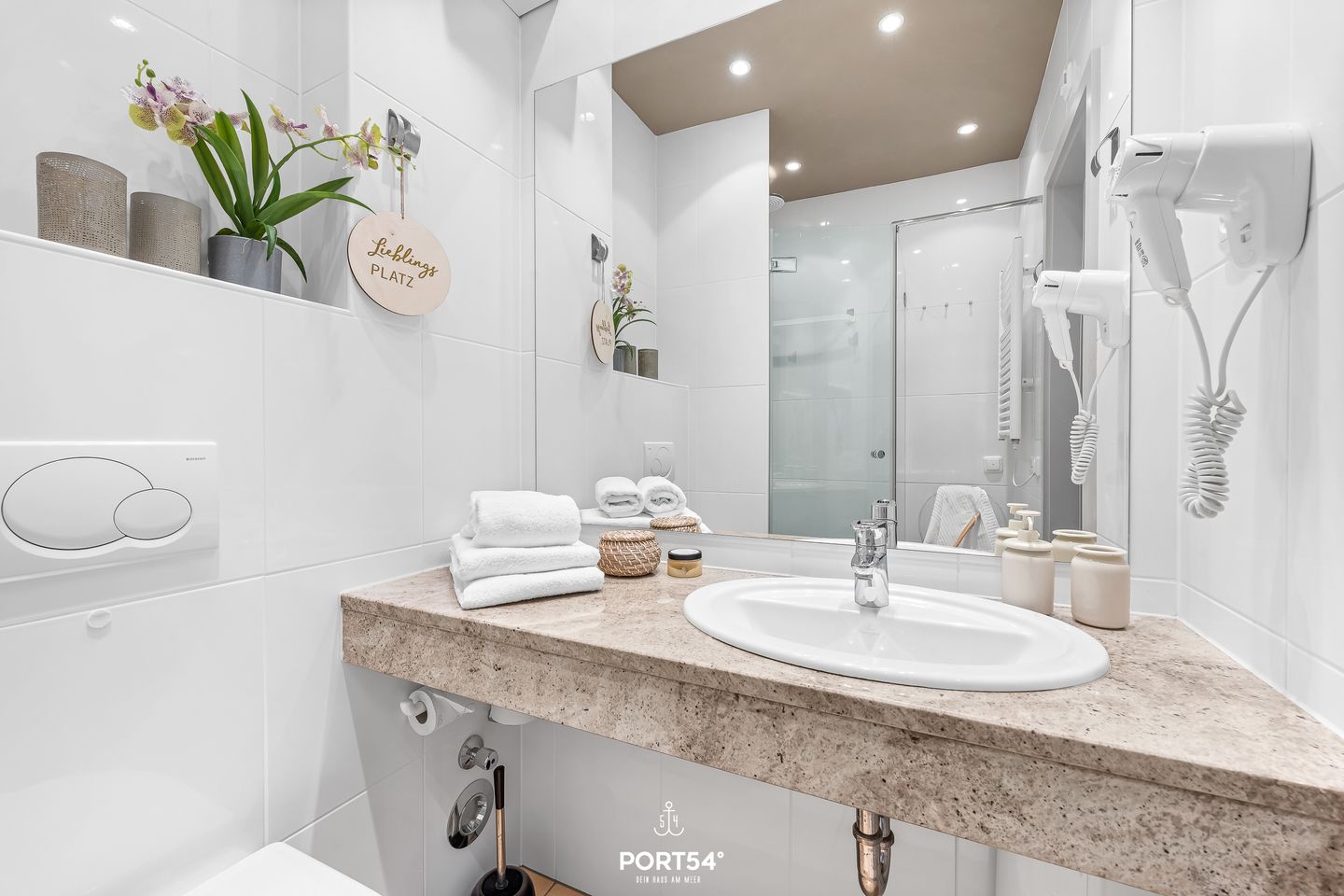 Das separate, hell geflieste Badezimmer ist modern ausgestattet und bietet mit einer Dusche mit Glasabtrennung, einem großen Waschtisch, Kosmetikspiegel, fest installiertem Föhn sowie warmem Wasser und praktischen Ablagemöglichkeiten einen komfortablen Start in den Tag. Für zusätzlichen Komfort stehen dir im Appartement auch Waschmaschine, Trockner, Staubsauger, Verdunkelungsmöglichkeiten, ein Kleiderschrank, WLAN sowie ein Feuermelder zur Verfügung.