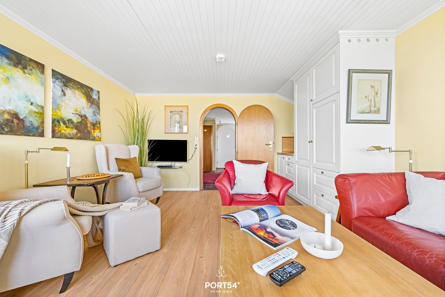 Von deinem Zimmer aus genießt du einen atemberaubenden Blick auf die Dünenlandschaft in Rantum, sowie die traditionellen Reetdachhäuser. Kostenloses WLAN und der Zugang zum Gemeinschaftswohnraum mit Smart-TV, Büchern und Spielen im Erdgeschoss sorgen dafür, dass du dich rundum wohlfühlst. Das Wohnzimmer mit dem roten Sofa ist ein gemeinsamer Raum des Hauses Friedeburg.
