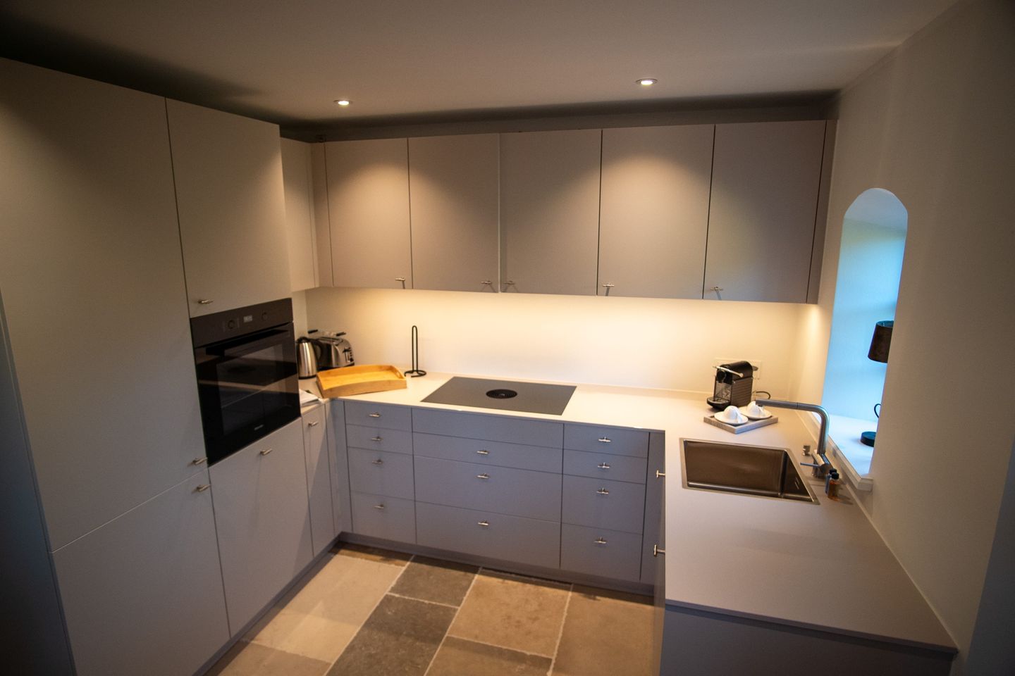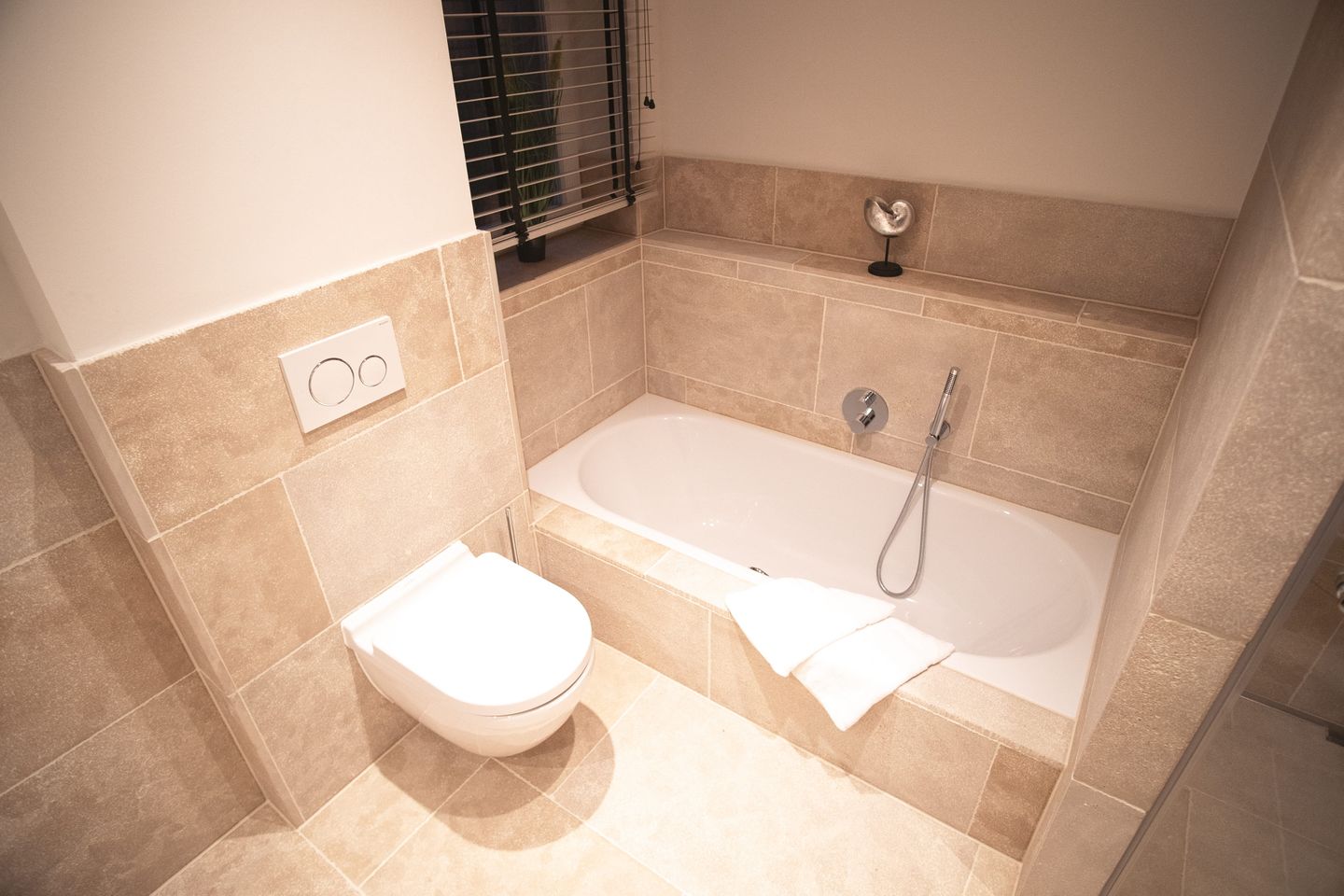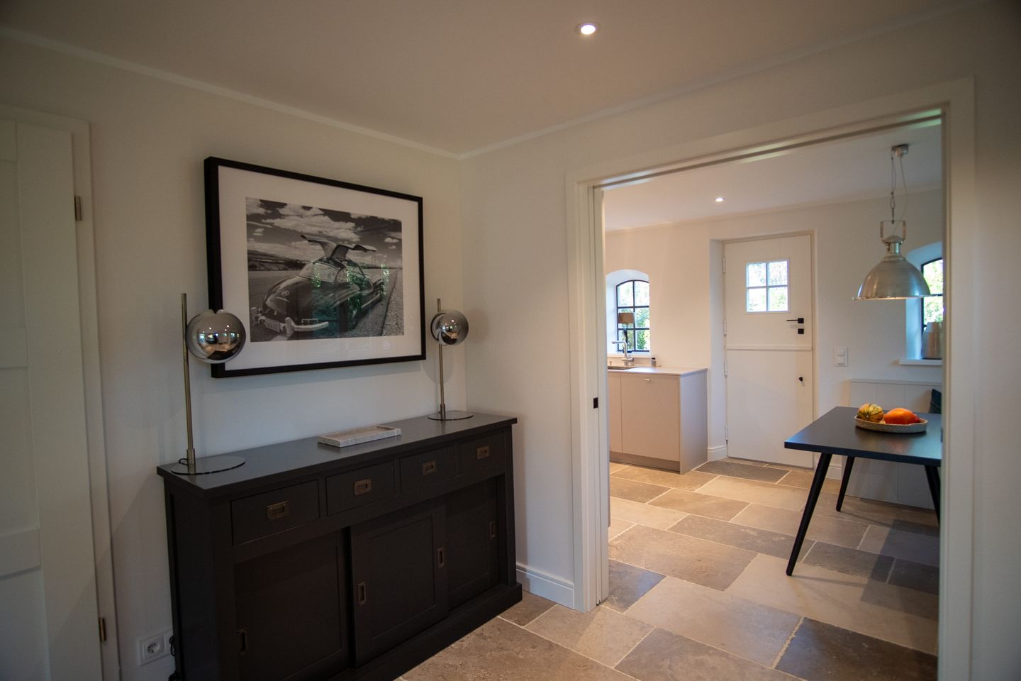 Das Haus besticht durch eine gelungene Kombination aus modernem Design und hochwertiger Ausstattung. Elegante Natursteinböden und maßgefertigte Tischlereinbauten verleihen jedem Raum Charakter, während Eichenholzdielen und eine Fußbodenheizung für ein behagliches Wohngefühl sorgen. Im Zentrum befindet sich eine einladende Essdiele, die moderne Küche lässt sich über zwei praktische Schiebetüren vollständig vom Wohn- und Essbereich abtrennen. Sie ist vollständig ausgestattet und verfügt unter anderem über Miele-Geräten, Induktionskochfeld und Nespresso-Maschine sowie eine „Klönschnacktür“, die direkt in den Garten führt – perfekt für gemeinsame Mahlzeiten im Freien.