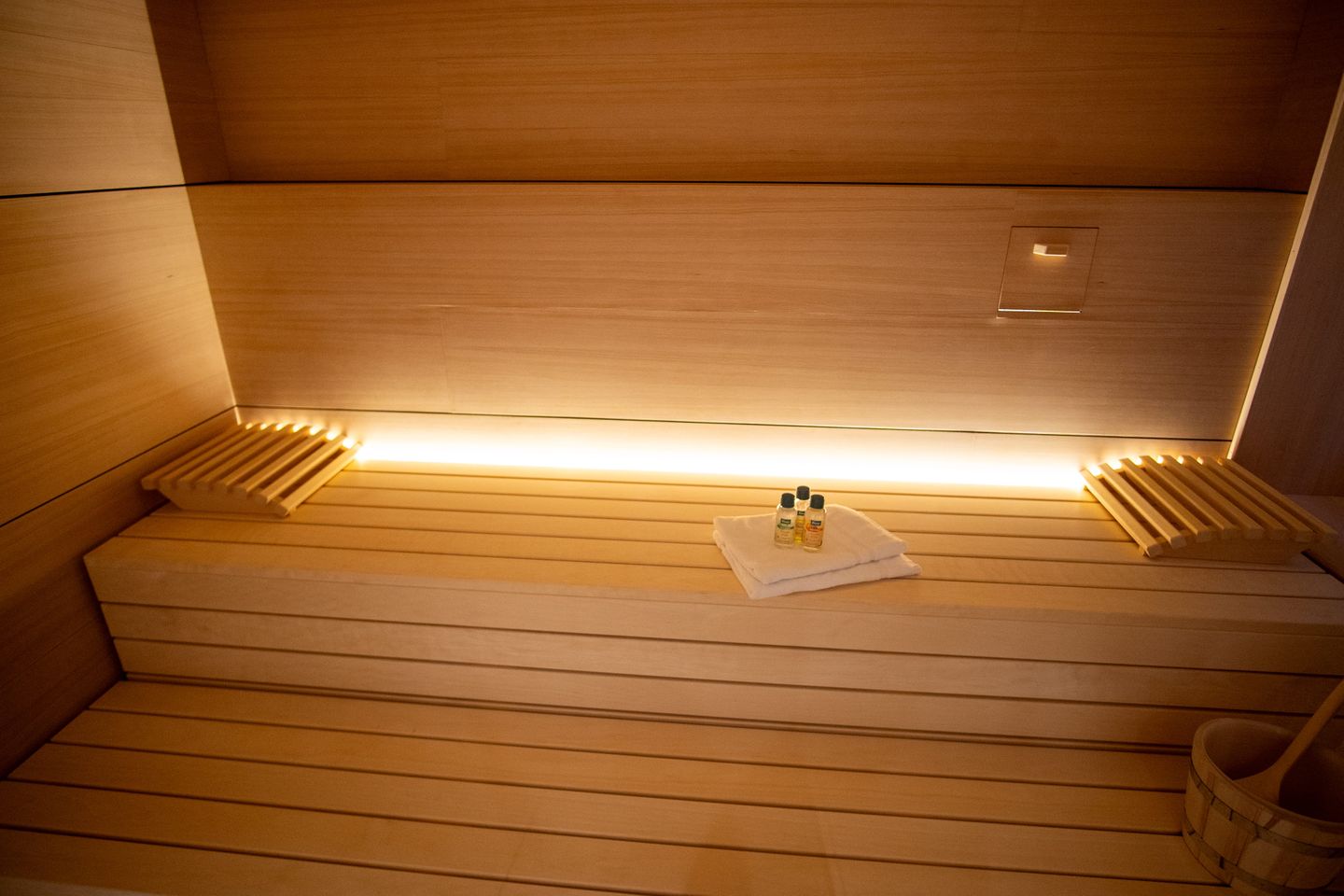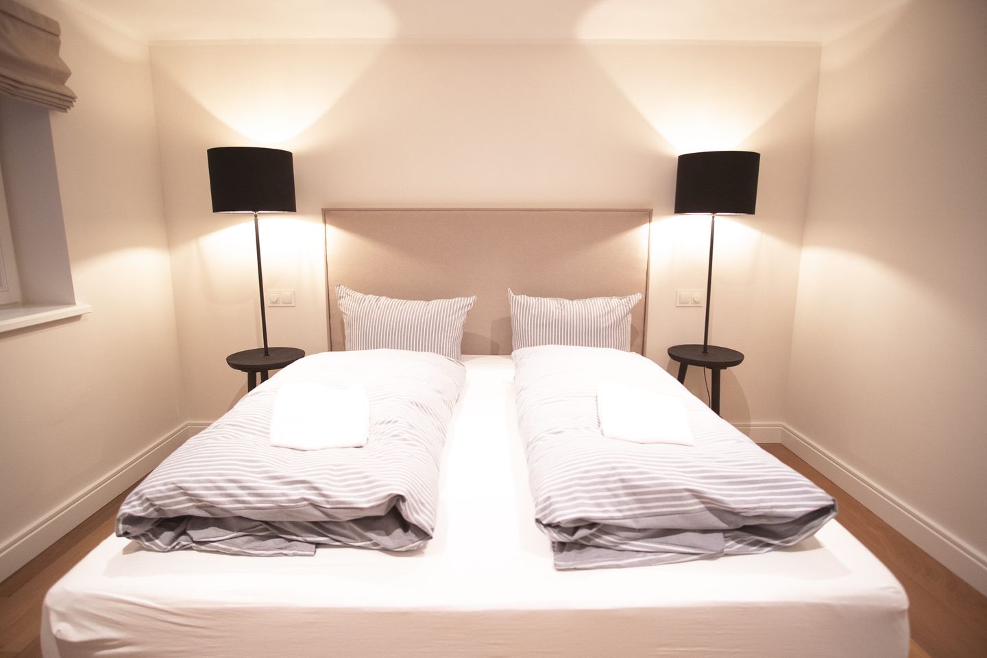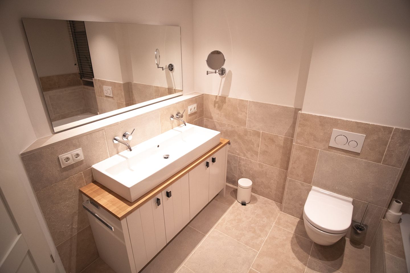 Das Tiefparterre beherbergt ein weiteres Schlafzimmer mit Boxspringbett (180 x 200 cm), TV und Einbauschrank sowie ein zusätzliches Badezimmer mit Badewanne und Regendusche. Ein Wellnessbereich mit Sauna und zwei gemütliche Ruheliegen sorgt für erholsame Momente.