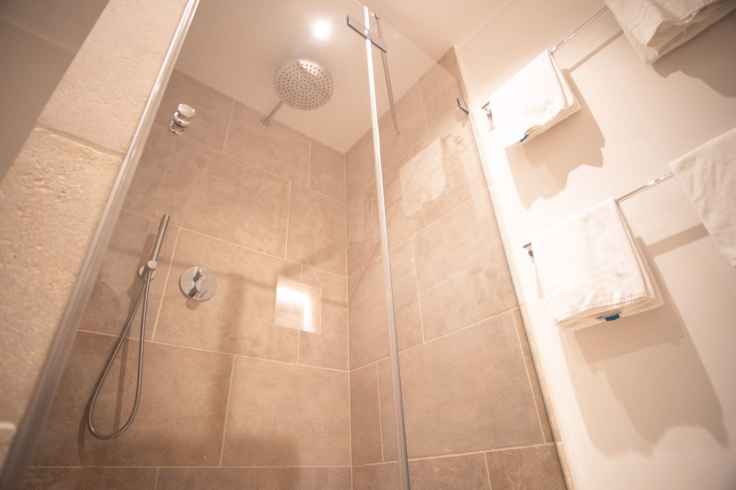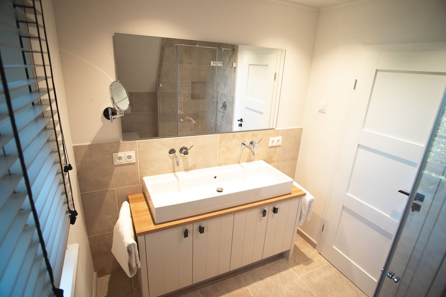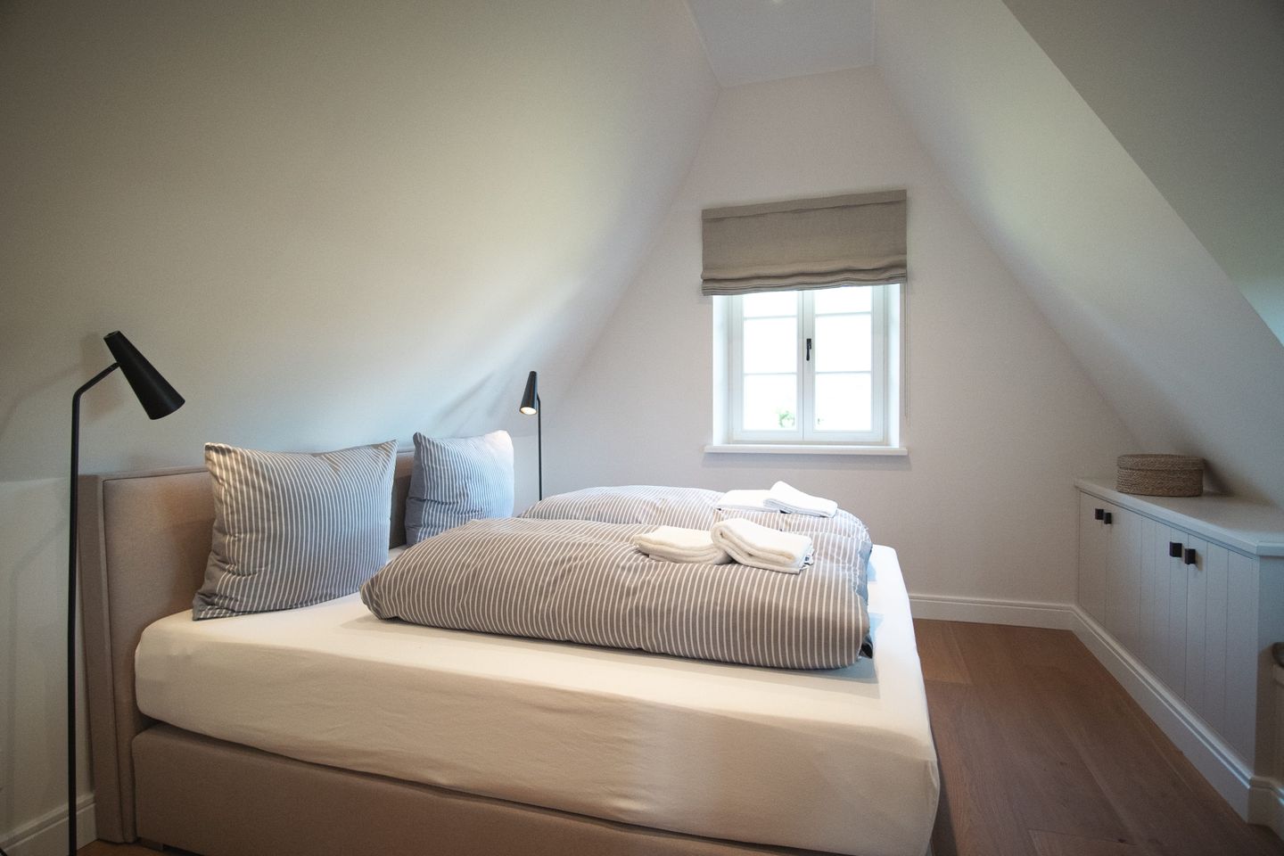 Im Obergeschoss erwarten dich zwei Schlafzimmer – eines mit Boxspringbett (180 x 200 cm), das andere mit zwei Einzelbetten (je 80 x 200cm), TV und Einbauschrank – sowie ein stilvolles Badezimmer mit Regendusche. Darüber hinaus bietet der Spitzboden zusätzlichen Raum zum Relaxen oder Spielen – ideal für Kinder oder als Rückzugsort für Momente der Ruhe.